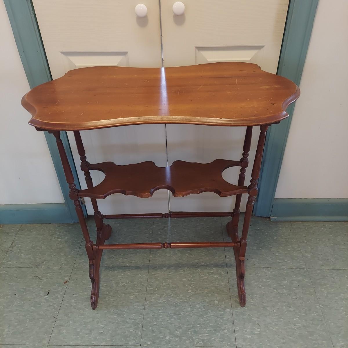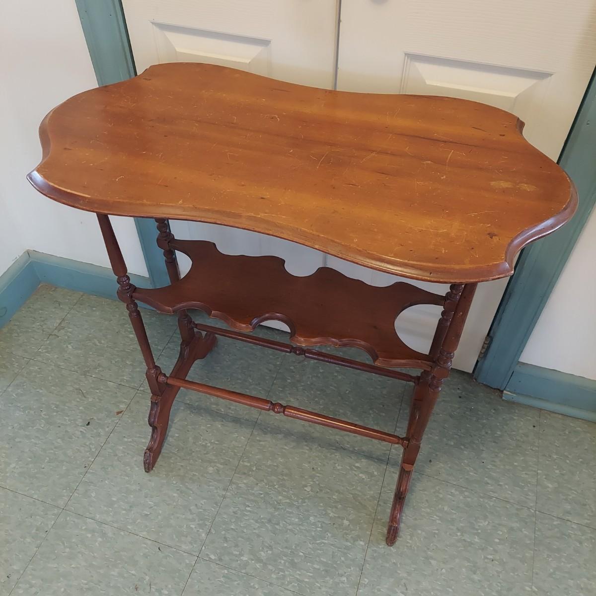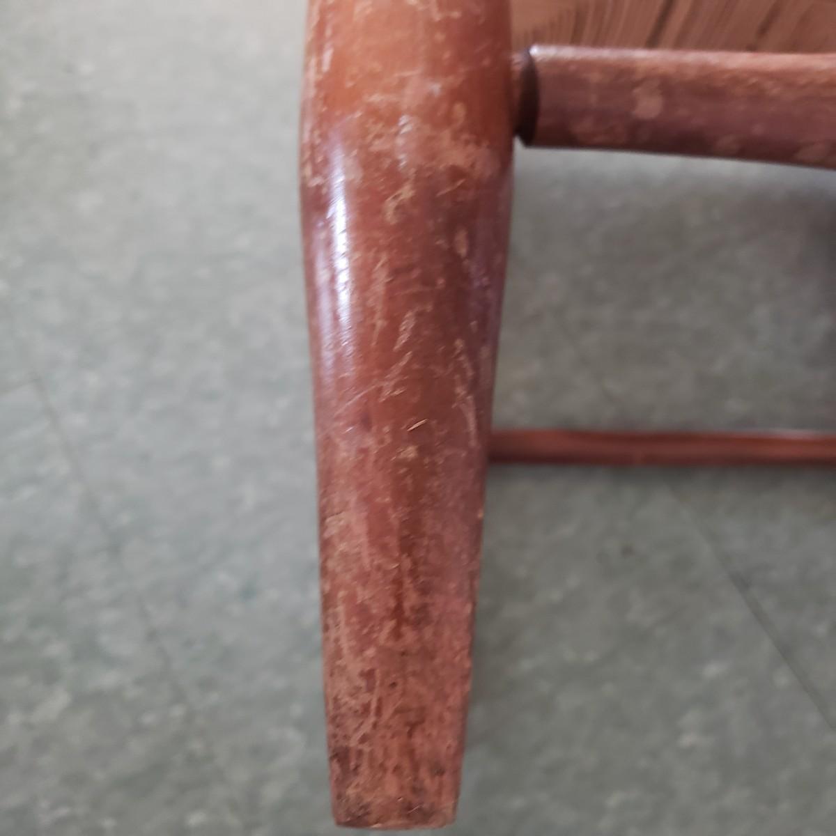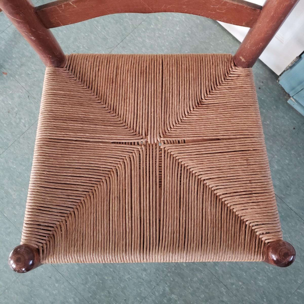 This two piece lot features a wooden side table in an Edwardian style that measures 29” x 16” x 29"H. Table is solid wood but is slightly rickety. Some wear to the top. The rush wooden chair measures 17" x 15" x 37"H, with a seat height of 18". The chair appears to be solid and blemish free. Please see photos for details. Local Pickup Only