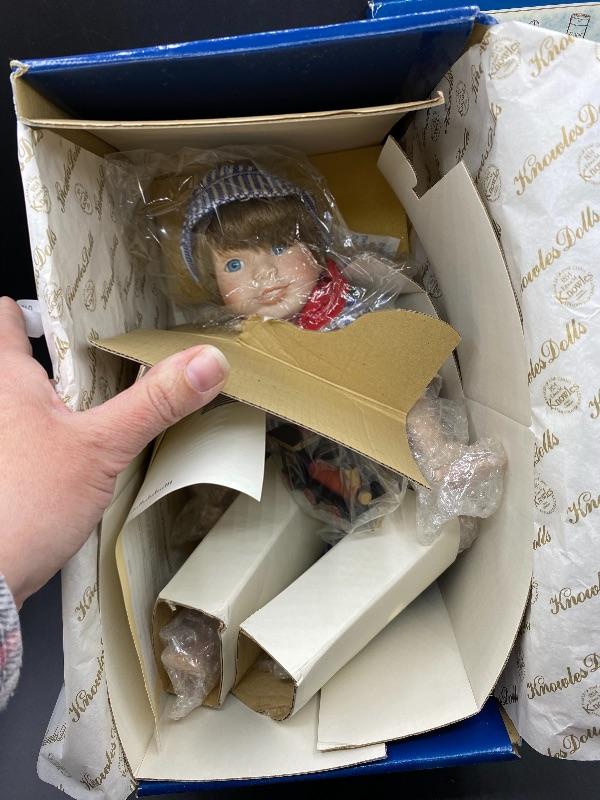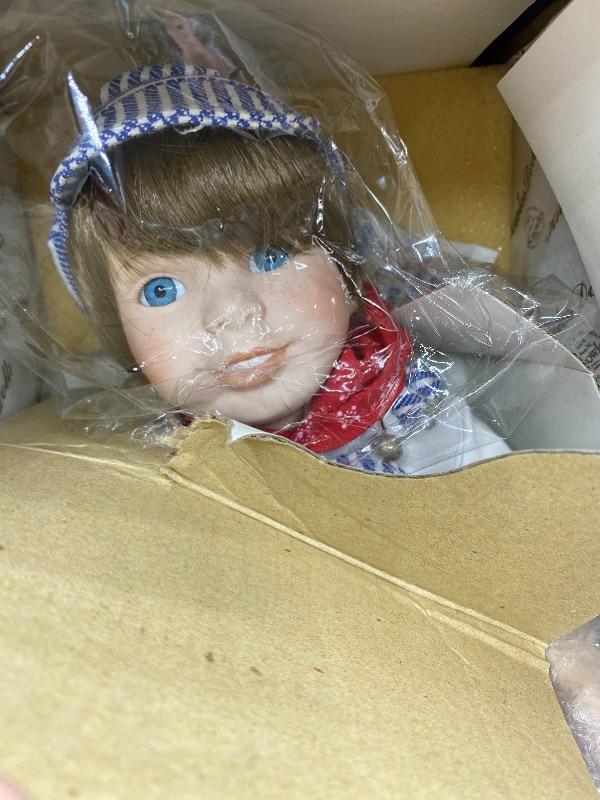 Collector doll from Edwin Knowles series Yesterday's Dreams. Porcelain boy doll in a train conductor outfit. Never removed from box. Has COA. Box has damage.