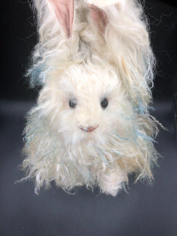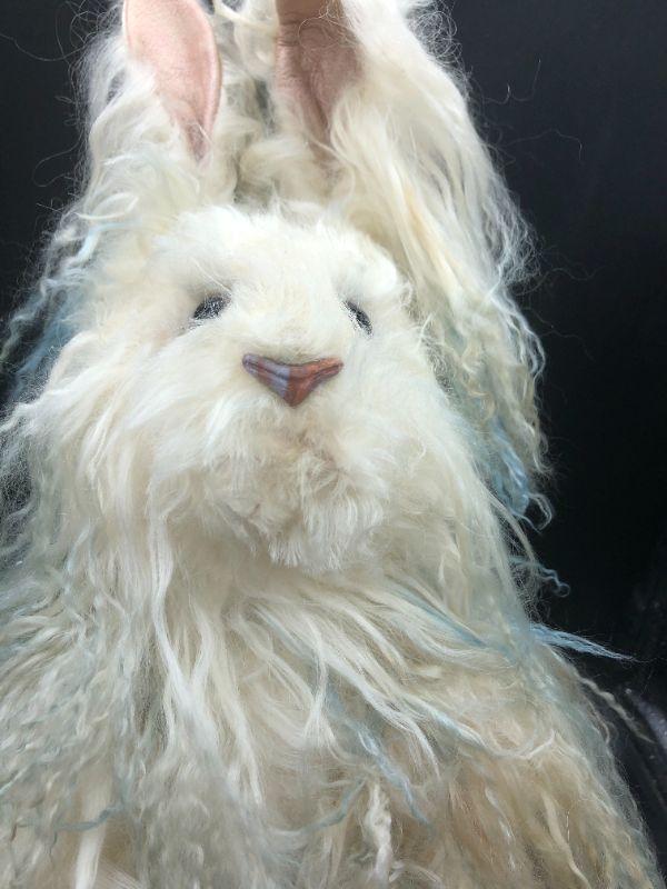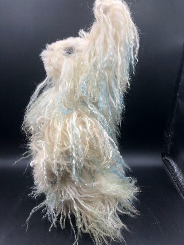 Jointed rabbit plush doll. Poseable limbs, bendable ears. Covered in a long fur with tint of blue to it. Looks like an artist doll, maybe OOAK, no tags or marks though.