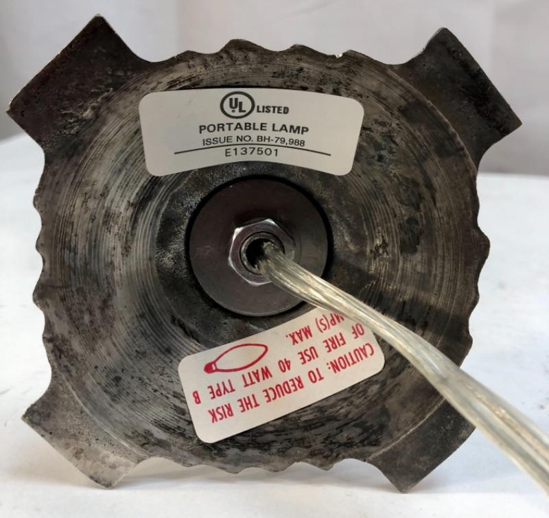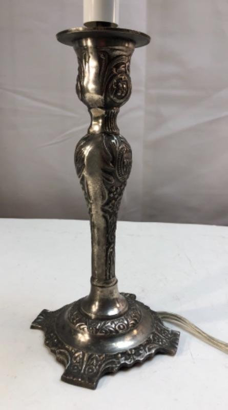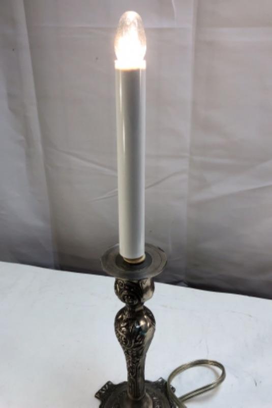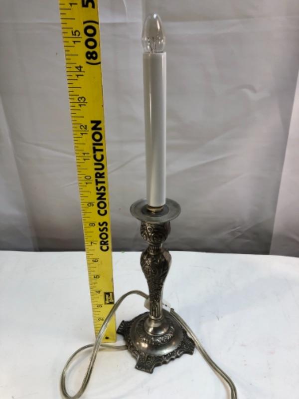 Candlestick style table lamp. Light on top is like the flame of the candle. Under 16" size.