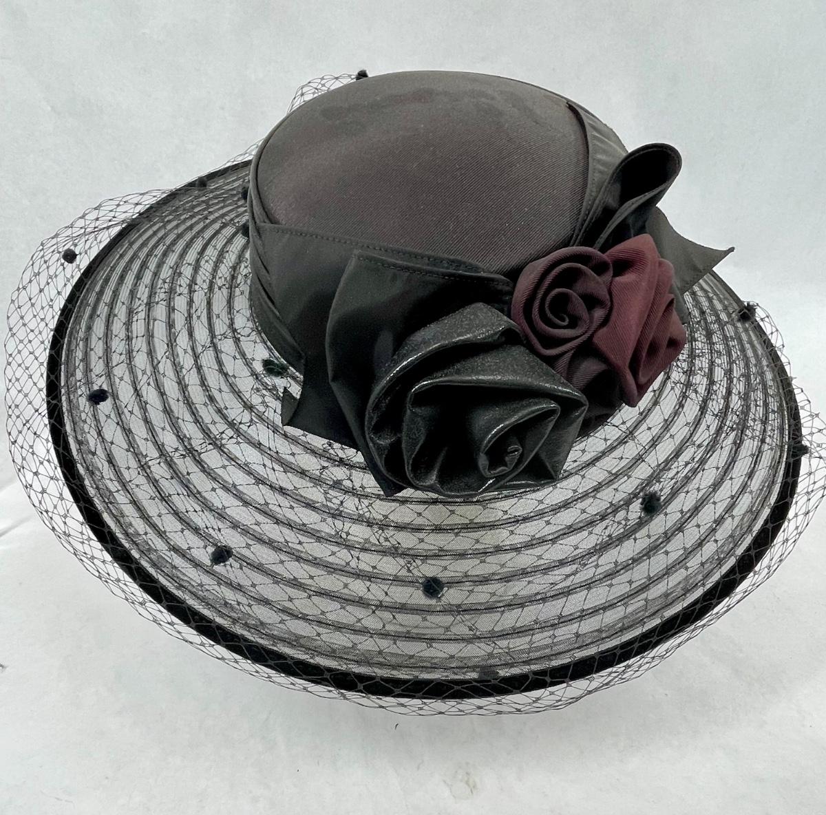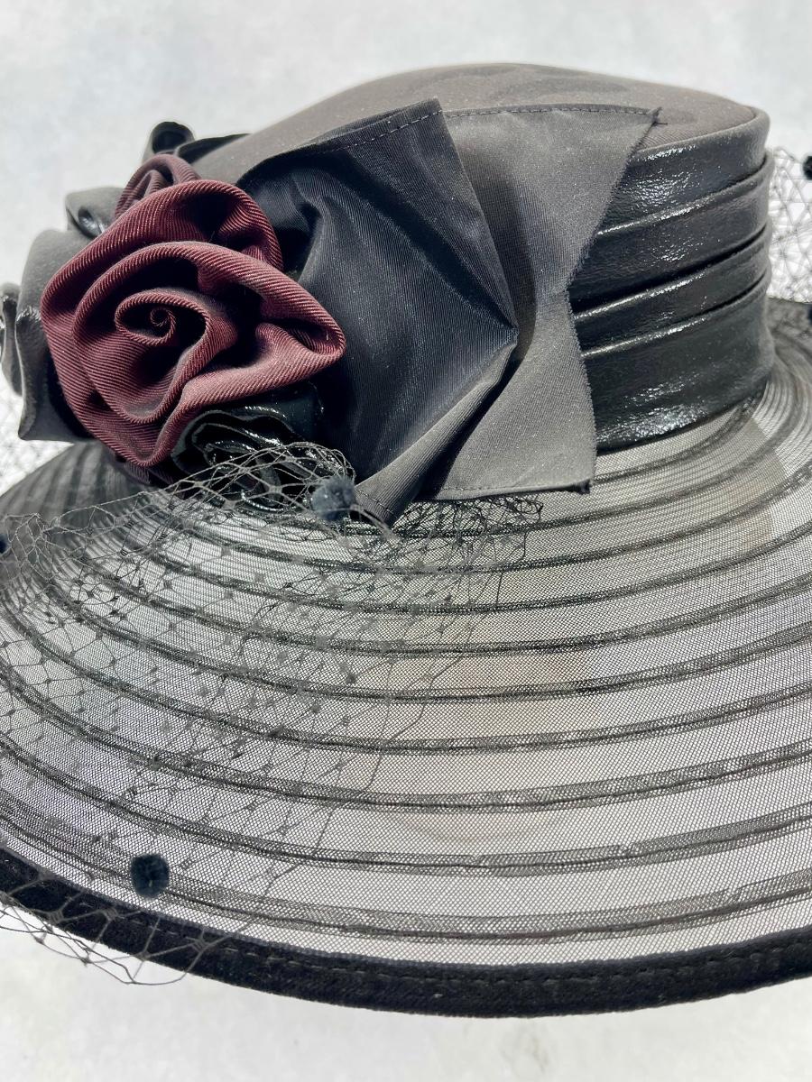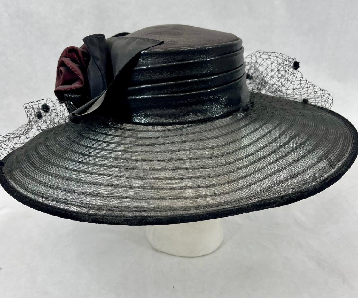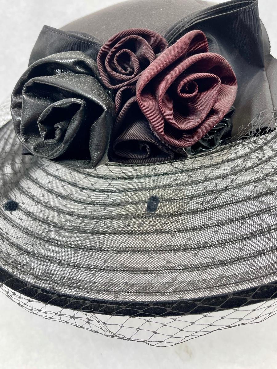 Whittall & Shon Vintage wide brim Hat black & maroon leather roses trim on hatband