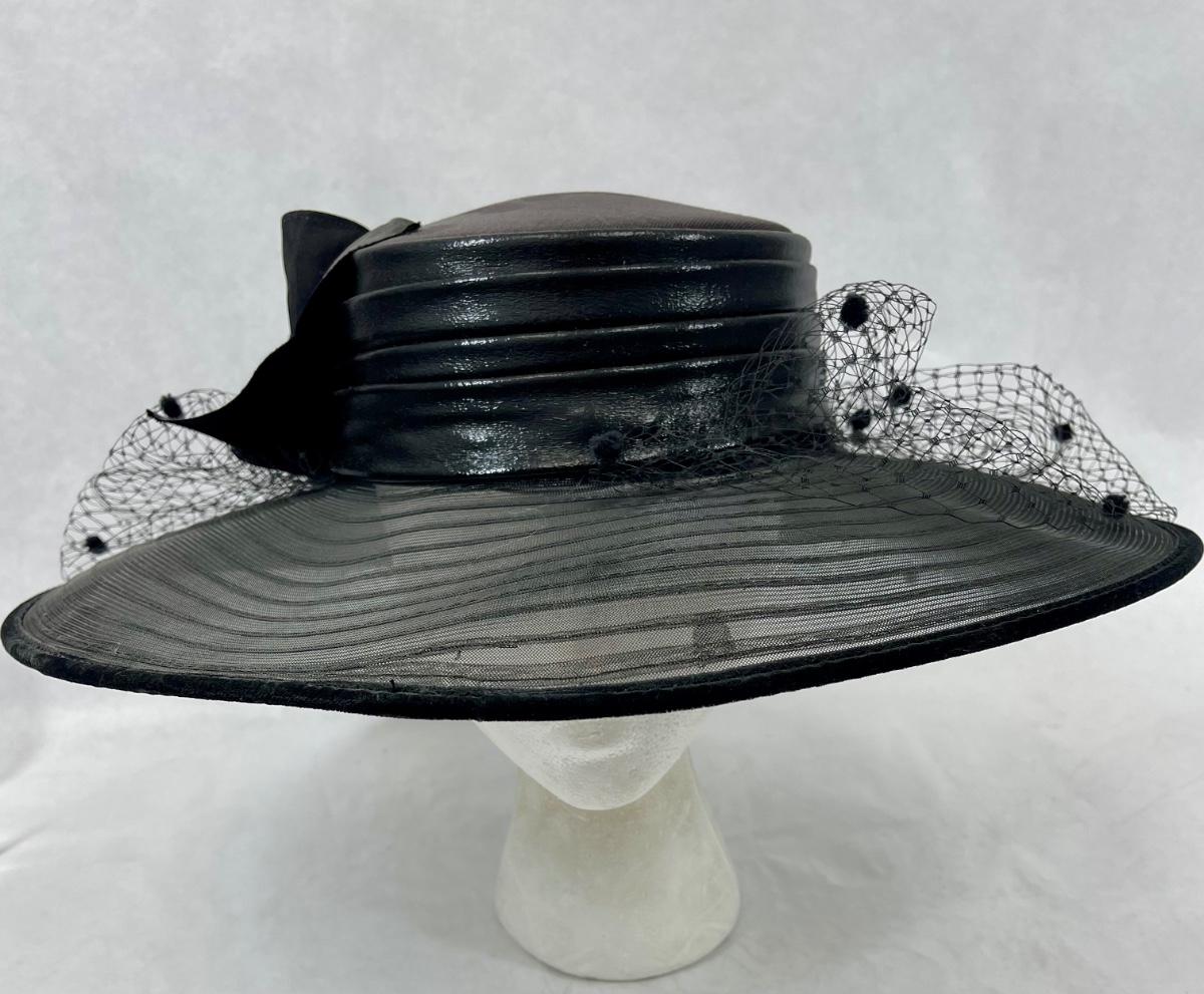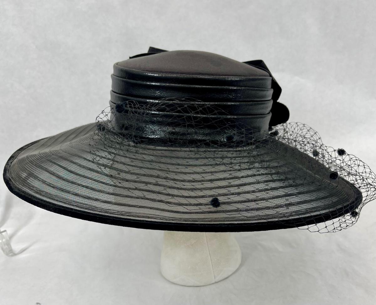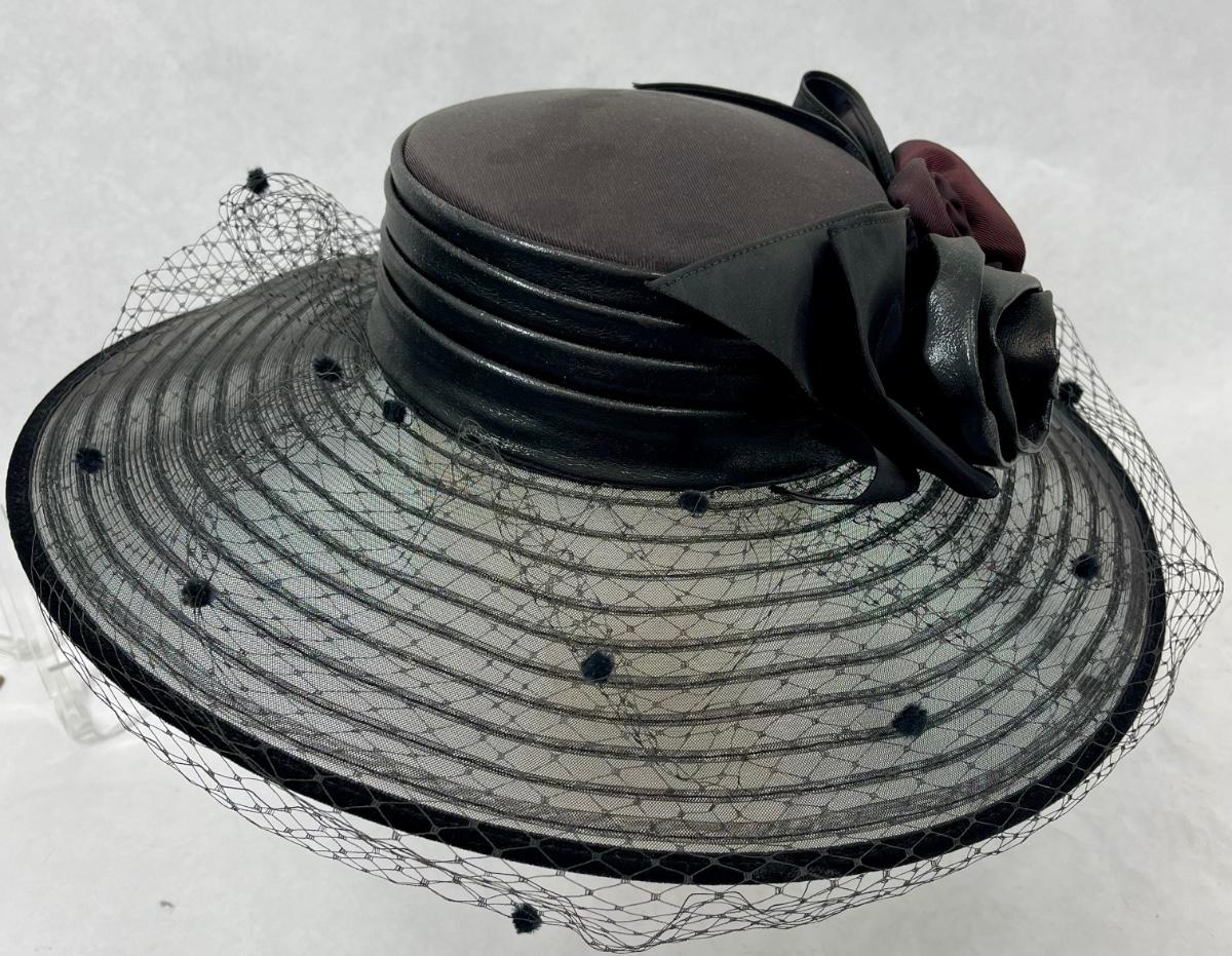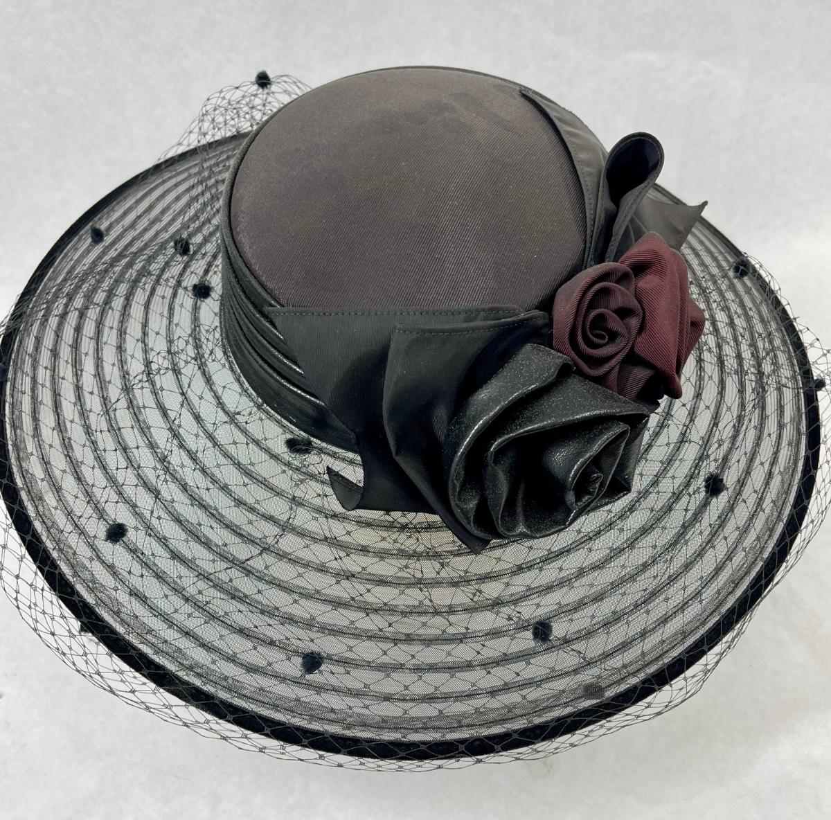 Whittall & Shon Vintage wide brim Hat black & maroon leather roses trim on hatband