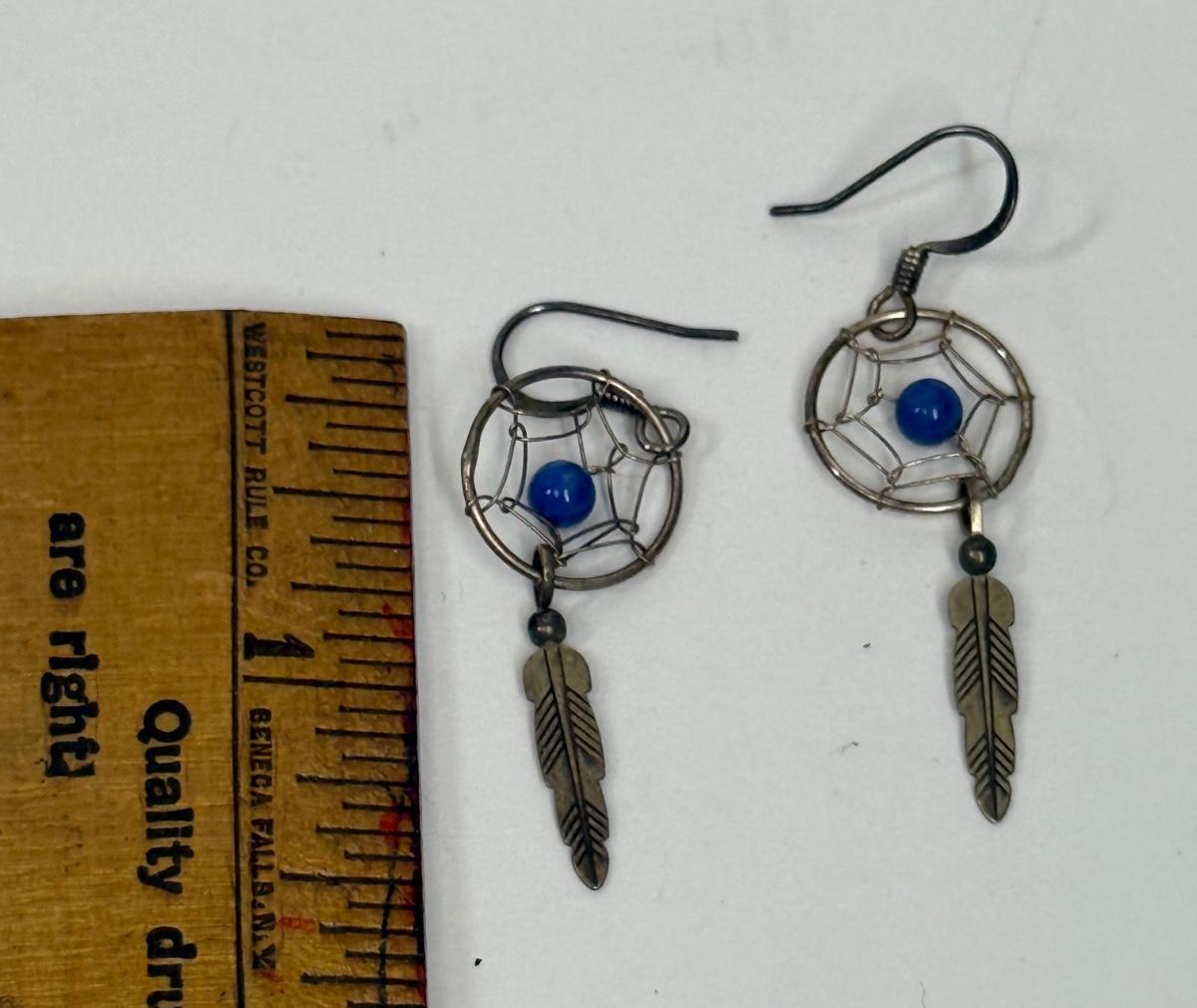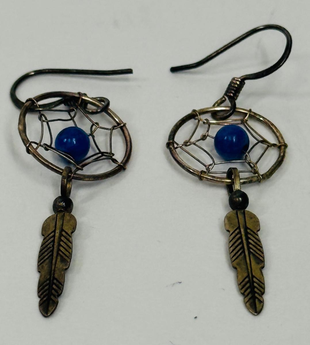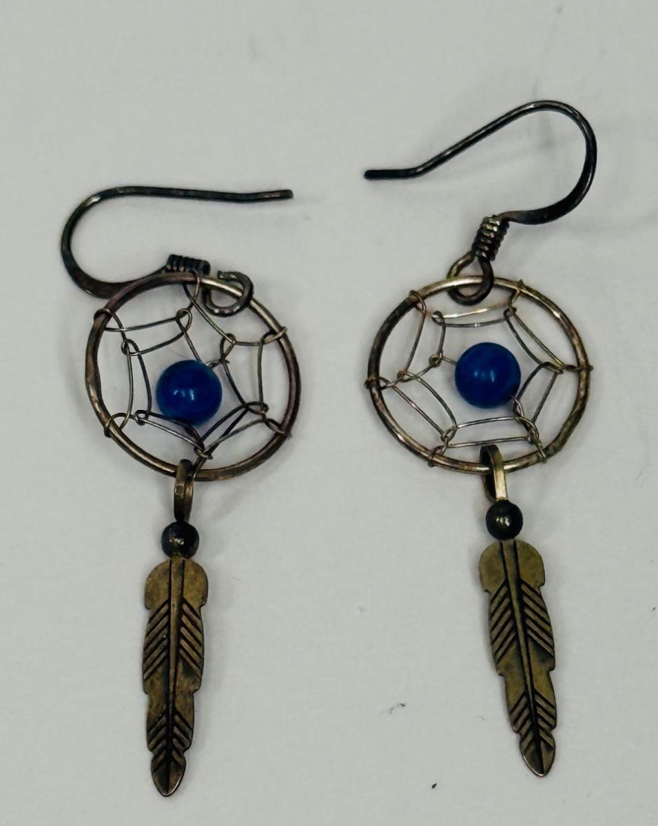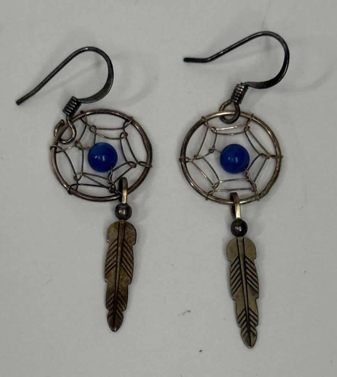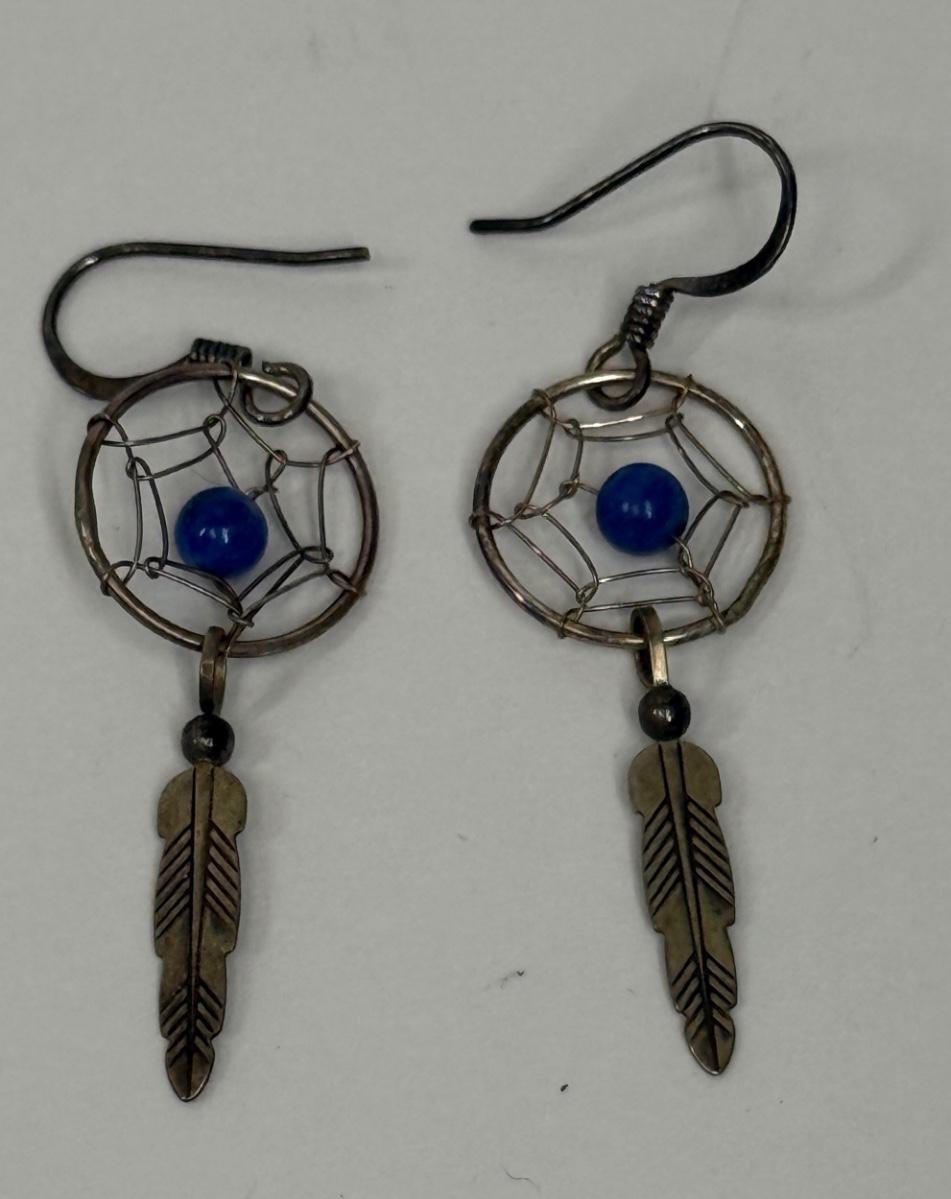 Silver-tome with blue stone in the center of the dreamcatcher. Good condition.