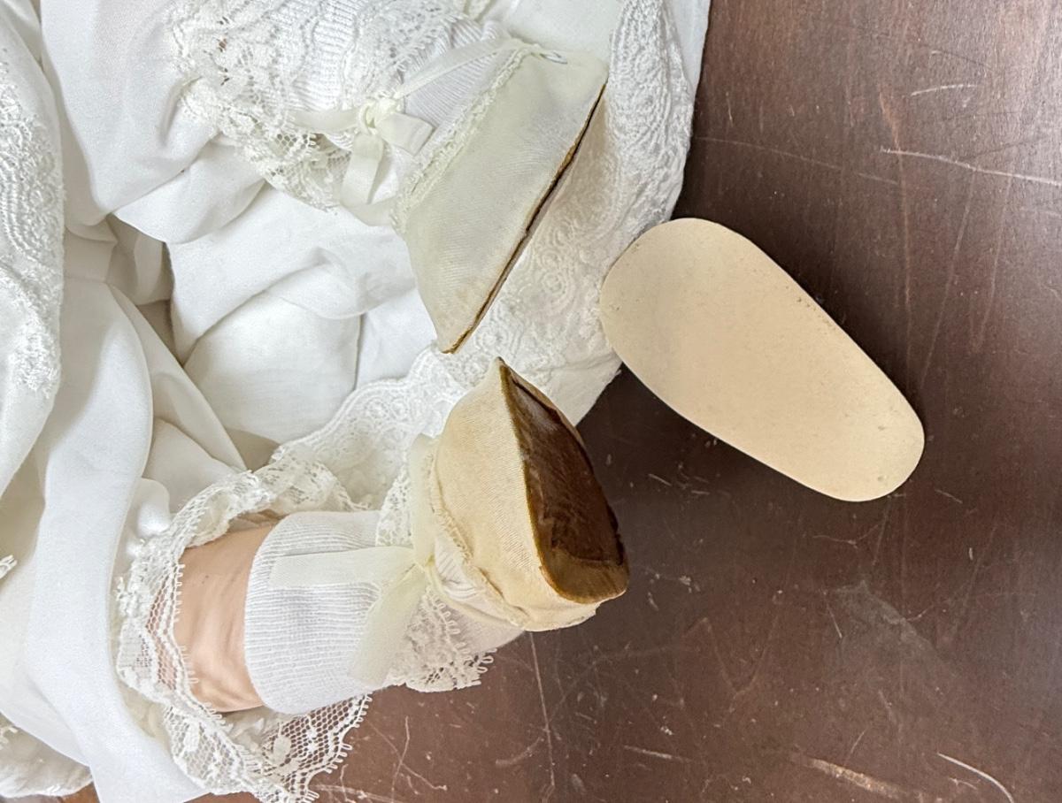 Cloth Body, Porcelain arms, legs, neck, and head. Stored in original box. In good previously owned condition. Opened and stored, but never displayed.