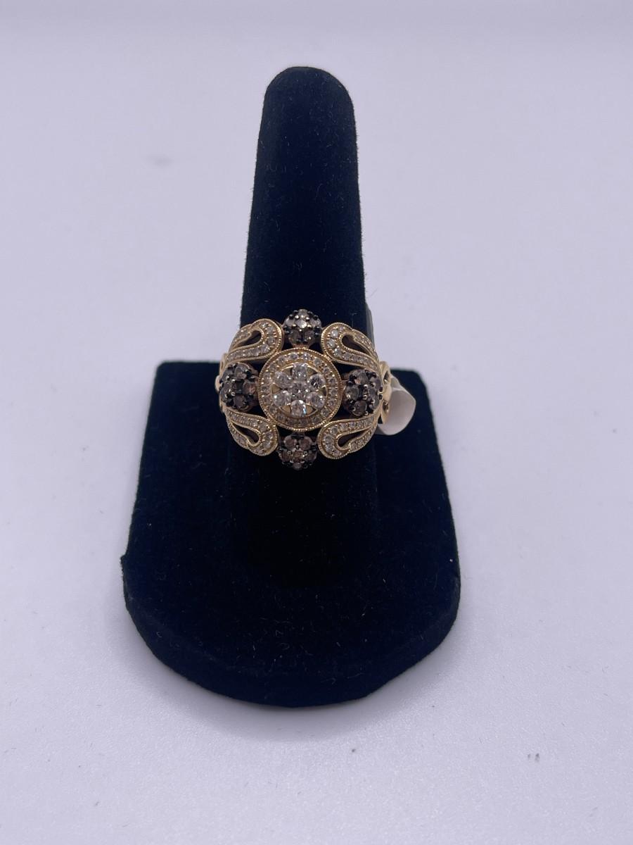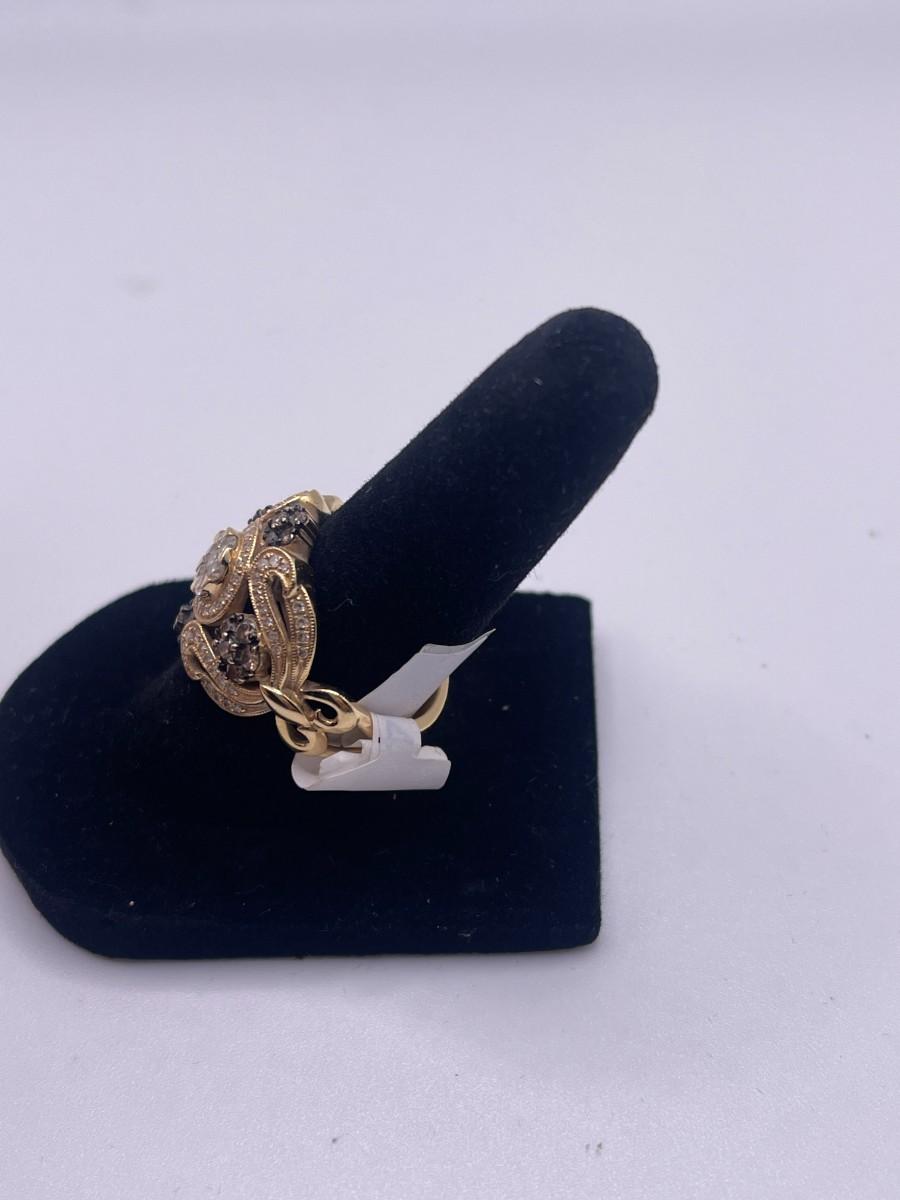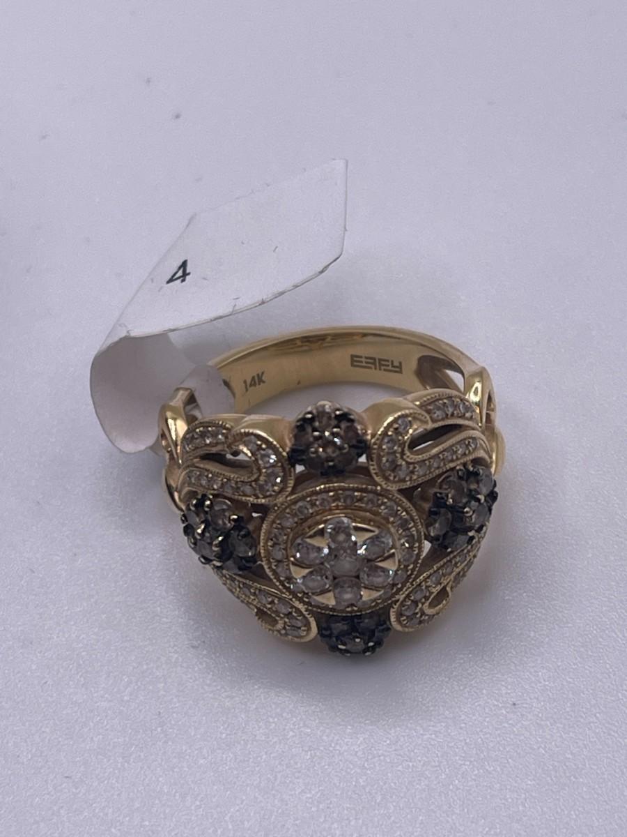 Effy 14k yellow gold ring with espresso and white diamonds. Very good condition with some scratching throughout. Stamped 14k and EFFY. Size 7.