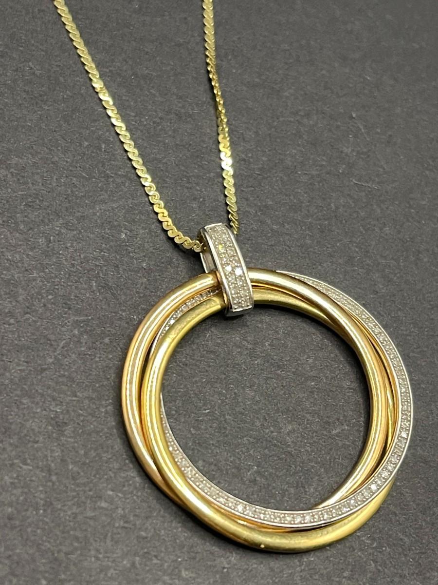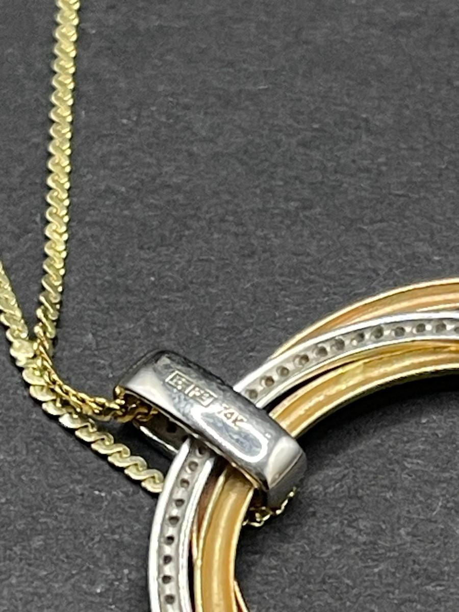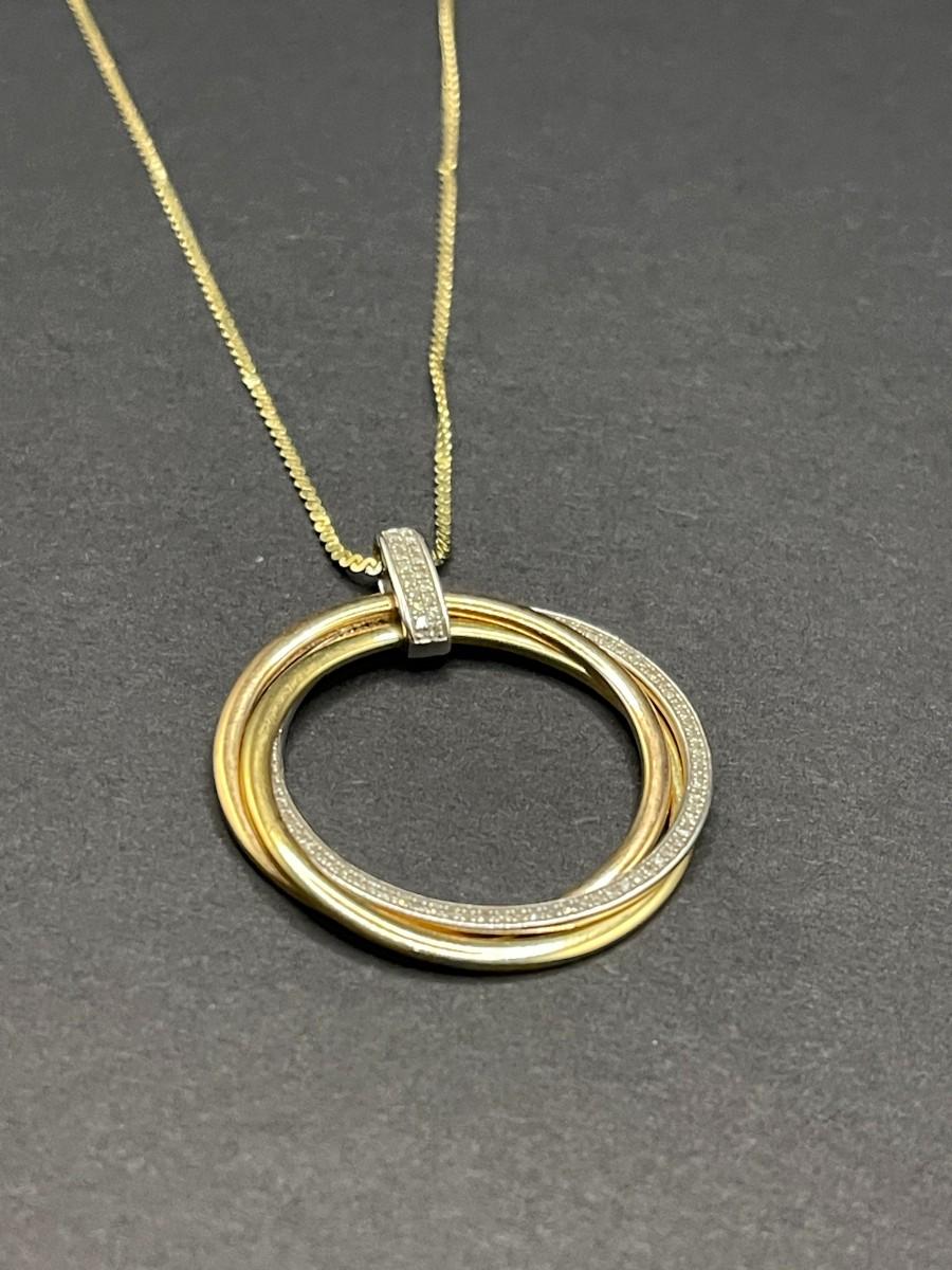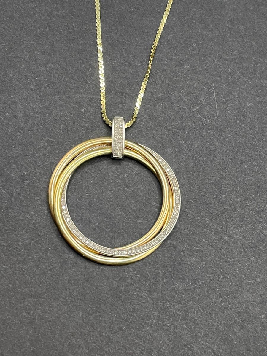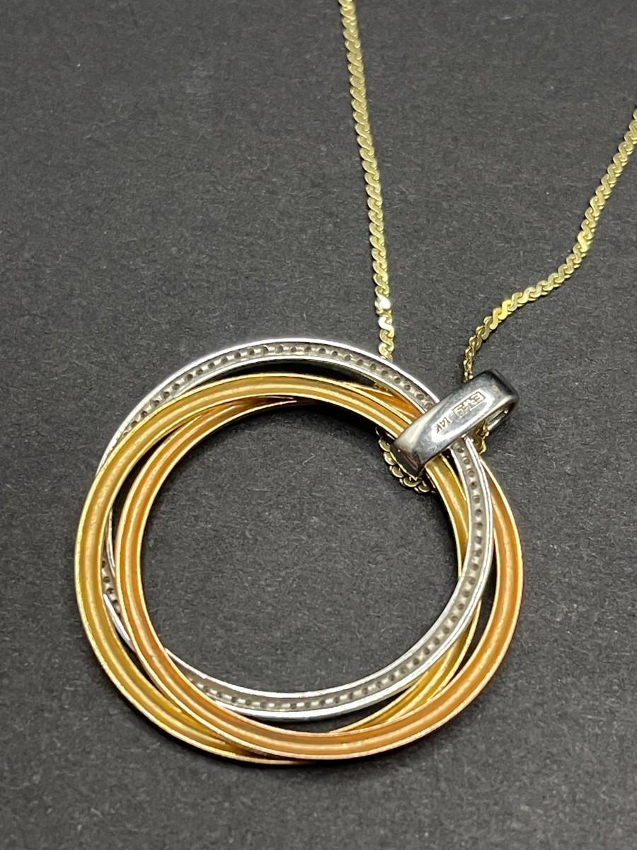 EFFY 14K Tri Color Gold 1/3 ctw Diamond Trio Circle Pendant with Chain. 30" chain. Good condition.