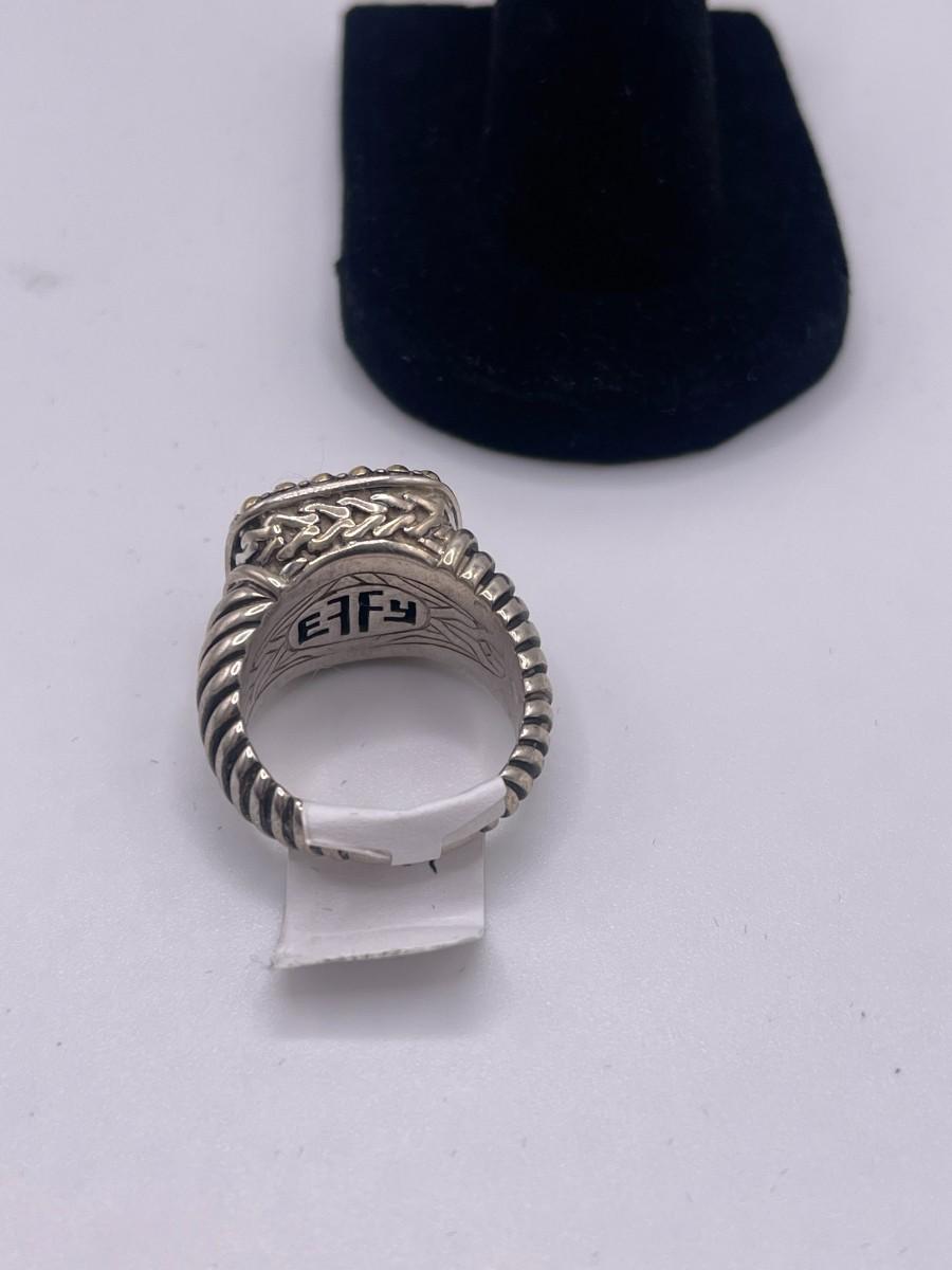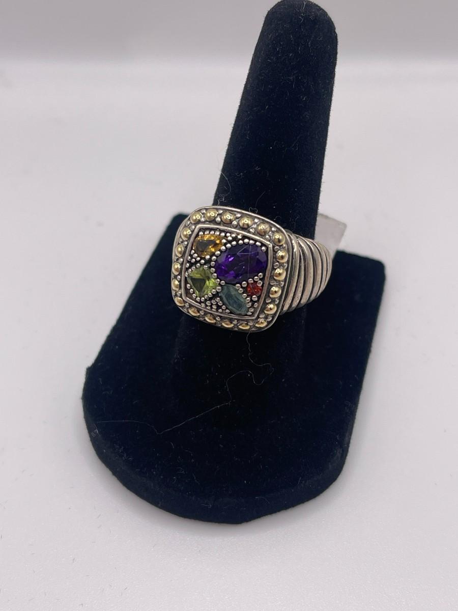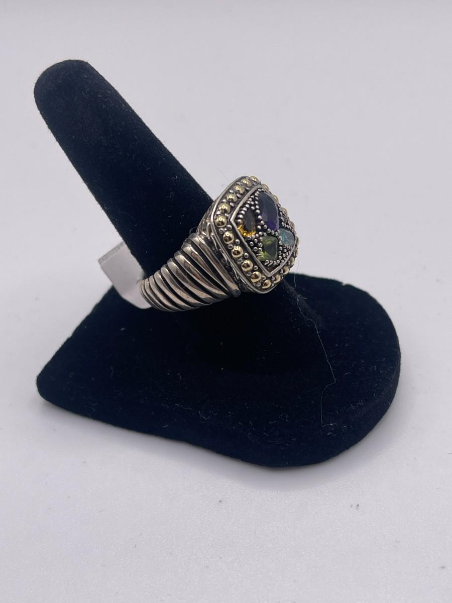Effy Sterling Silver ring with 18K gold accents. Stones: Blue Topaz, Oval Citrine, Round Garnet, Square Peridot. Top width: 5/8". 1.54 TCW. Good condition with some scratching throughout. Size 7