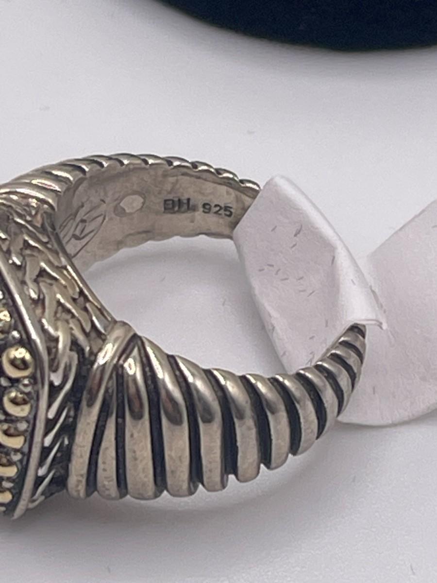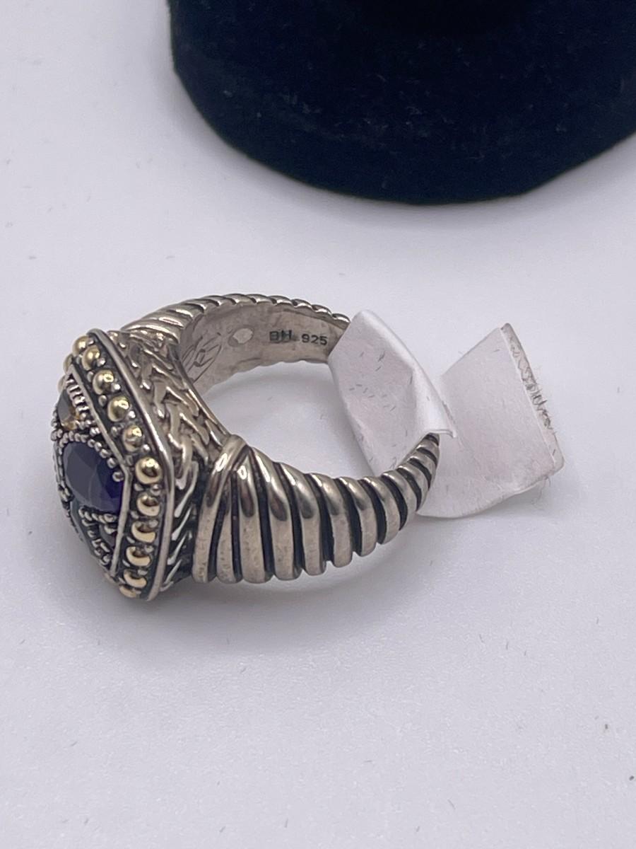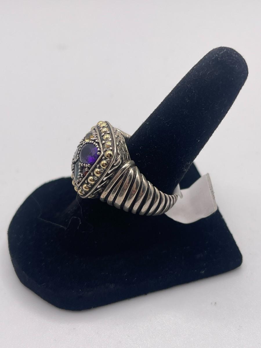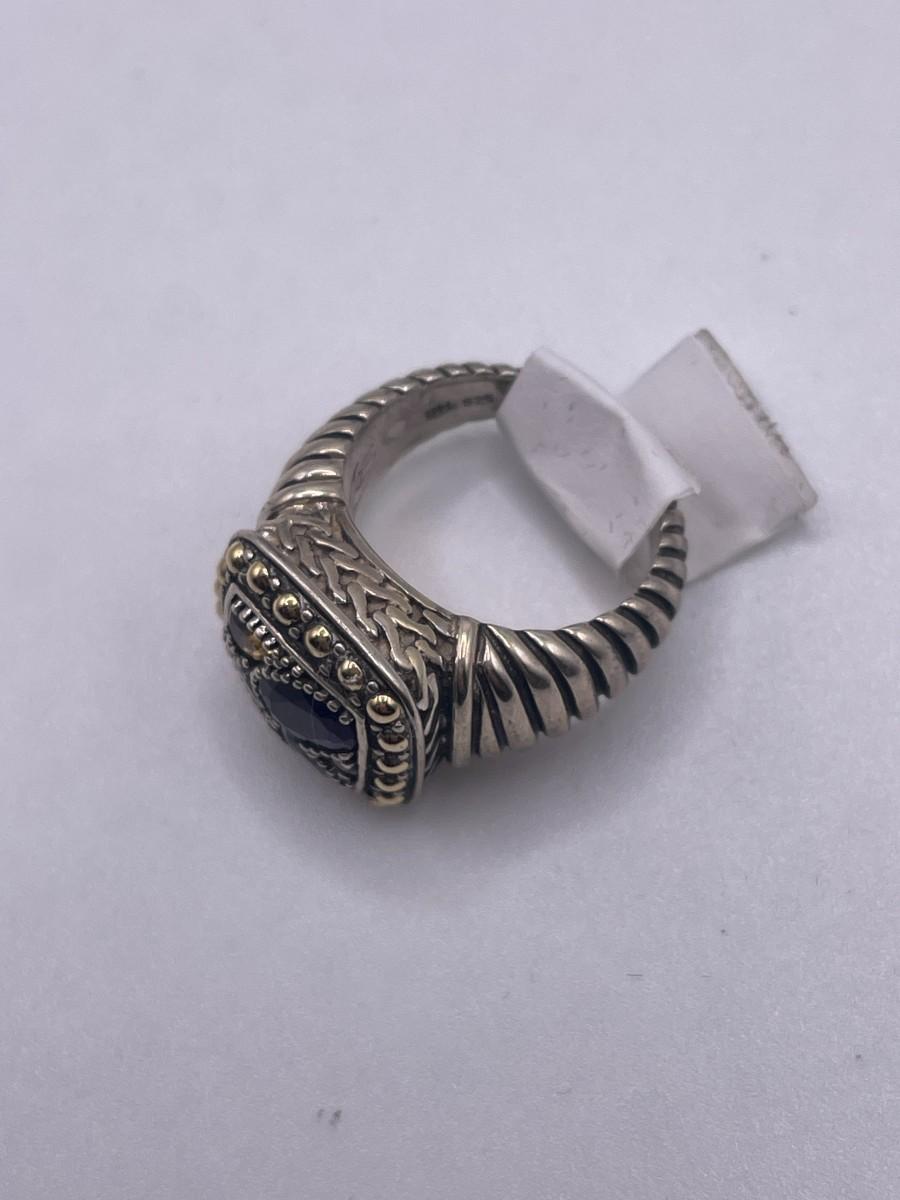 Effy Sterling Silver ring with 18K gold accents. Stones: Blue Topaz, Oval Citrine, Round Garnet, Square Peridot. Top width: 5/8". 1.54 TCW. Good condition with some scratching throughout. Size 7