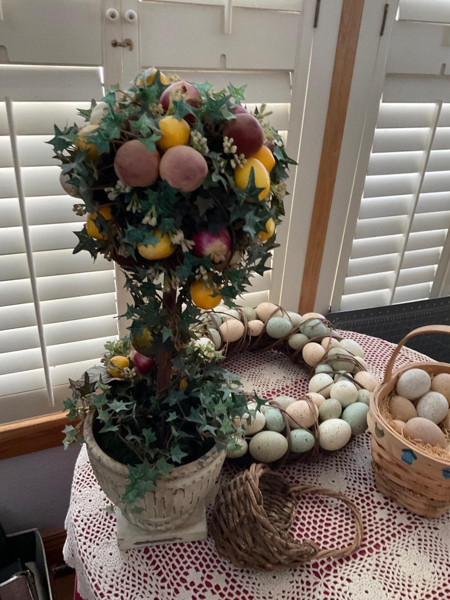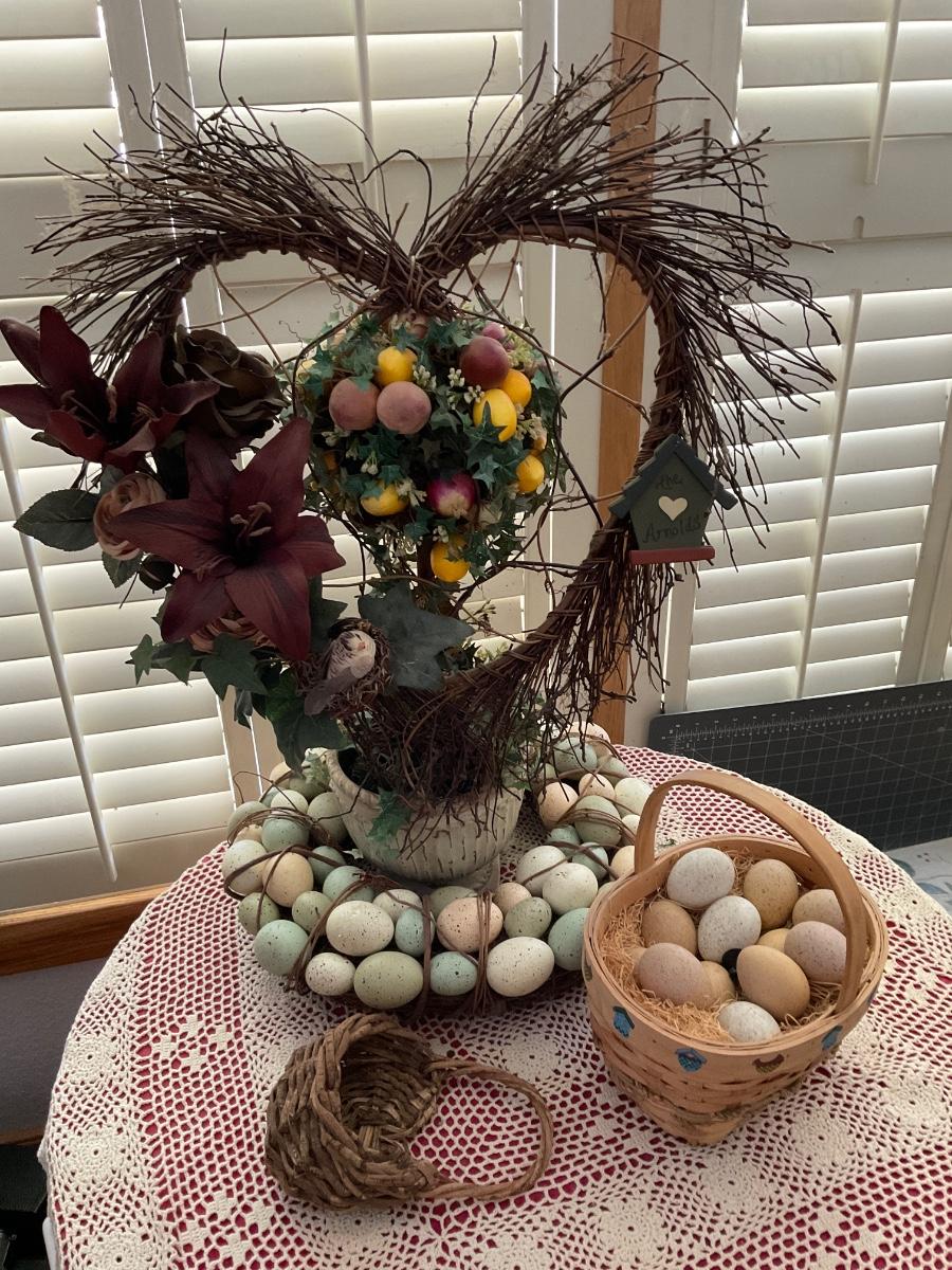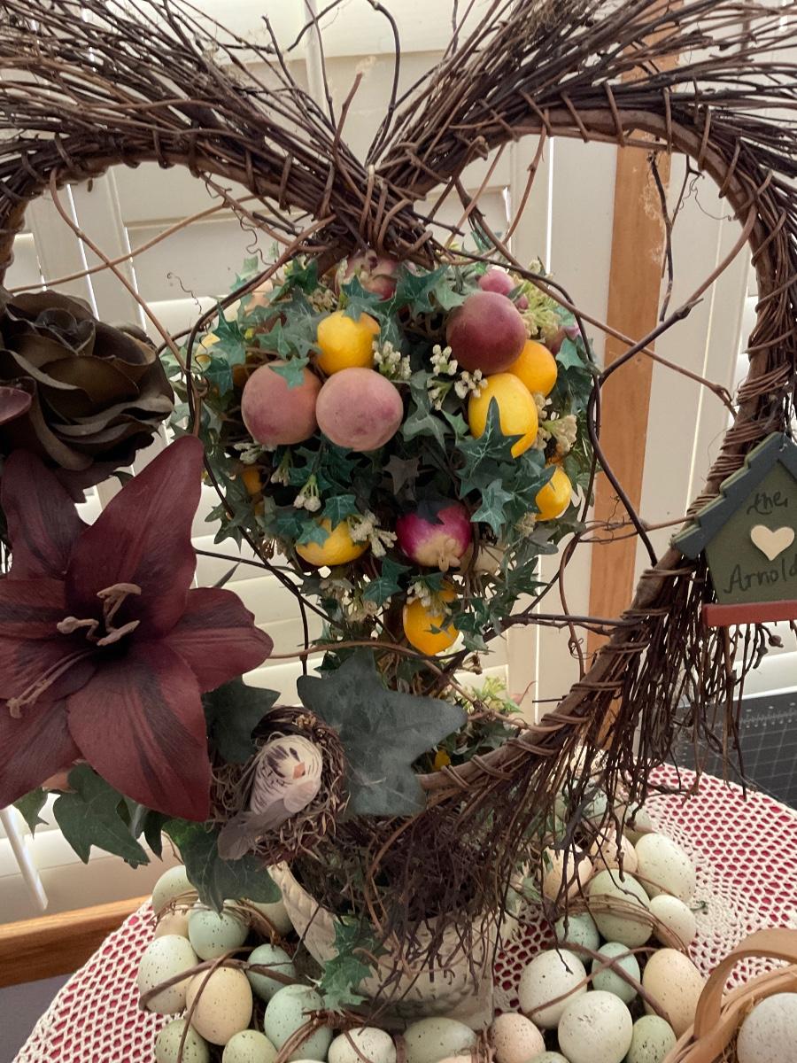 Egg Wreath, Egg Basket, Heart Wreath and pot of Fruit.