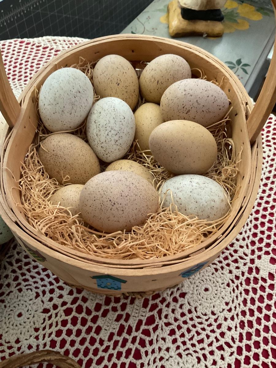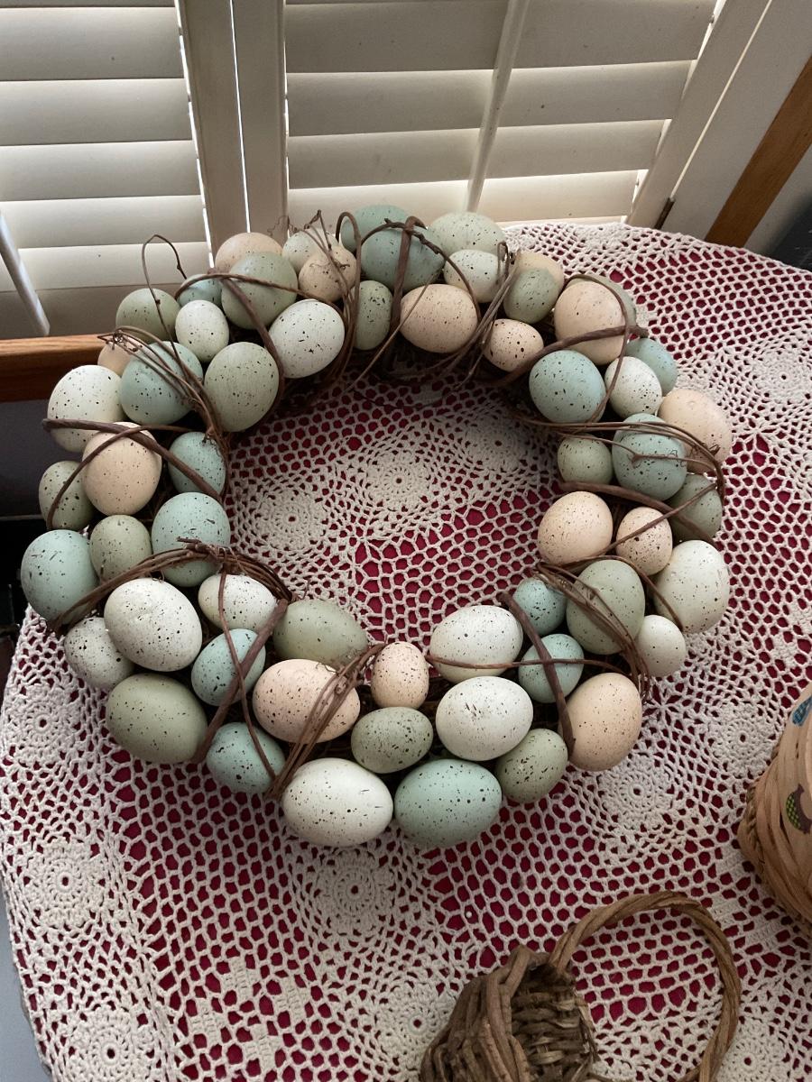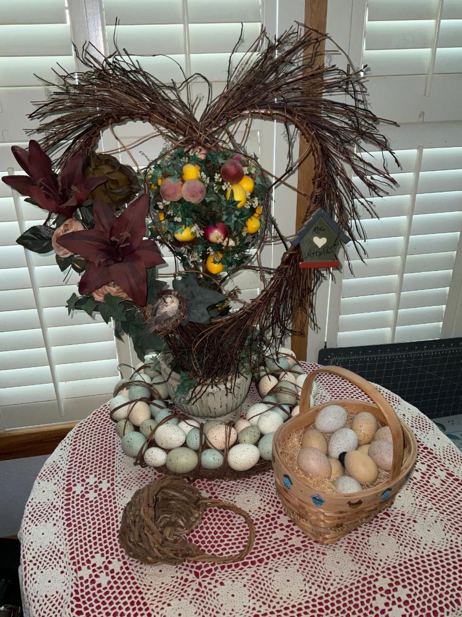 Egg Wreath, Egg Basket, Heart Wreath and pot of Fruit.