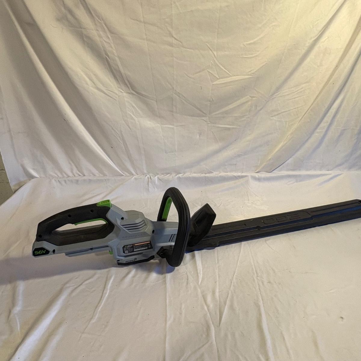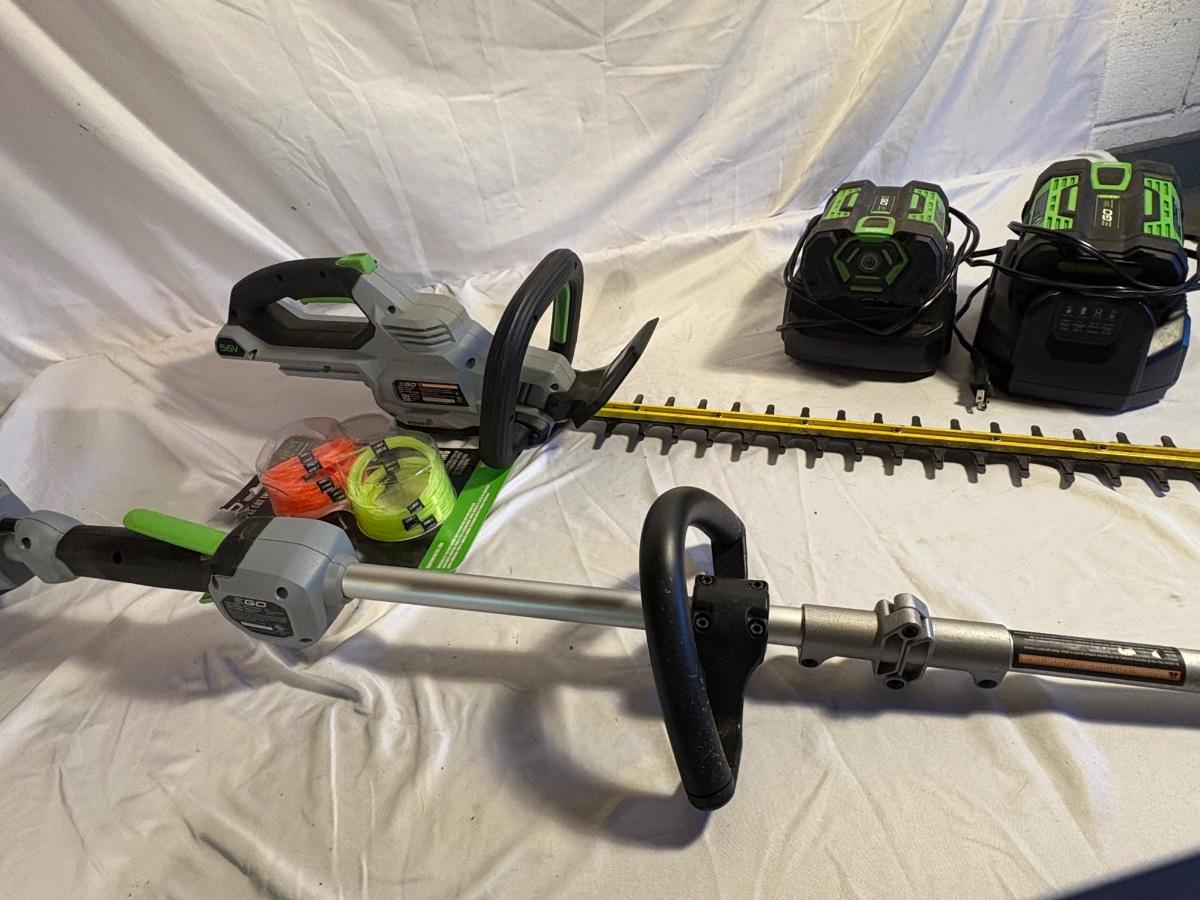 Two 56V ARC lithium batteries with chargers that powered on when plugged in. Brushless hedge trimmer and string trimmer with five refills of .095” twist line. String trimmer is approx. 71” long and shows signs of use. Both items turned on when battery was inserted.