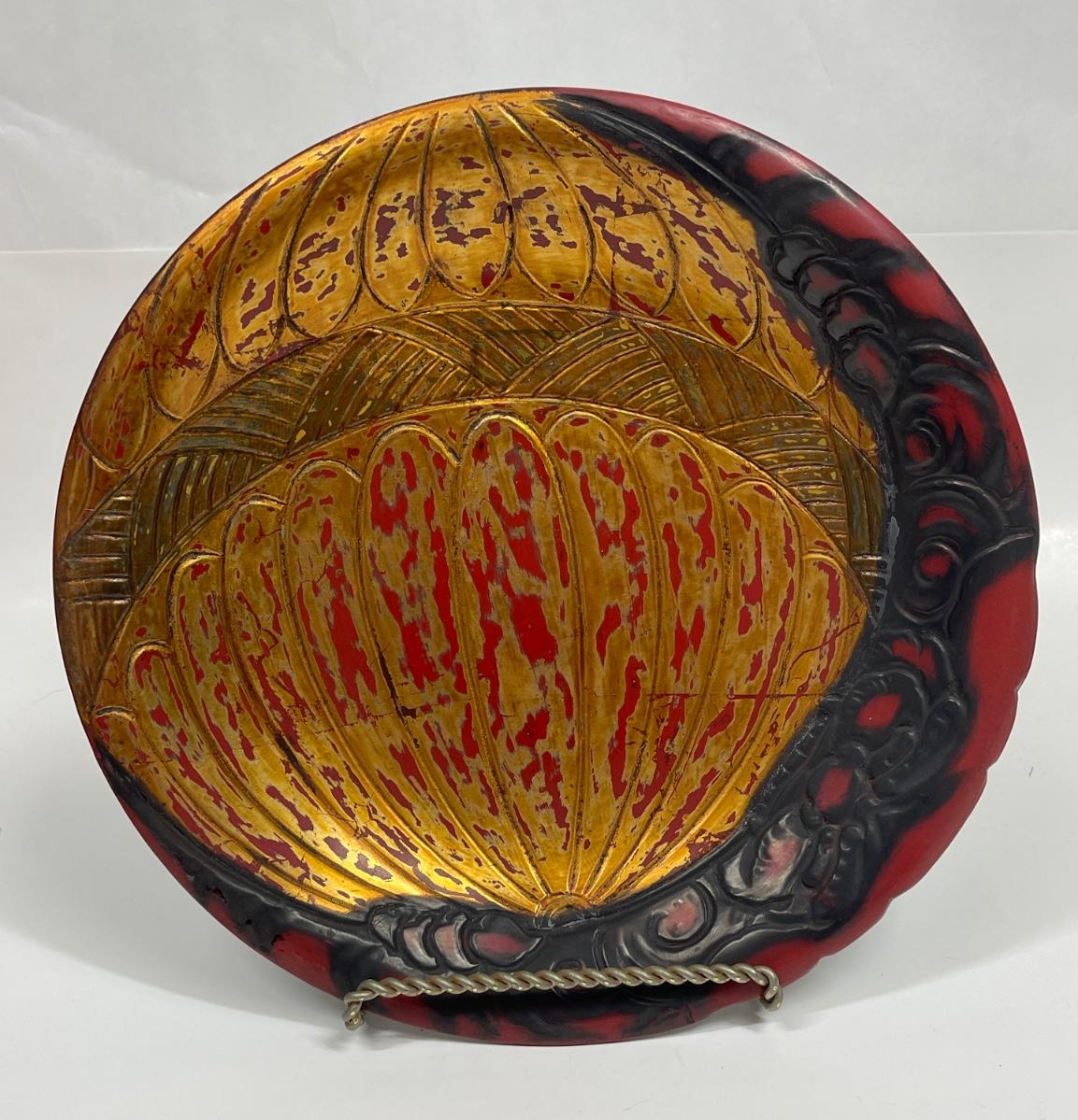 Vintage Gilded Wood Plate or Shallow Bowl with painted design
