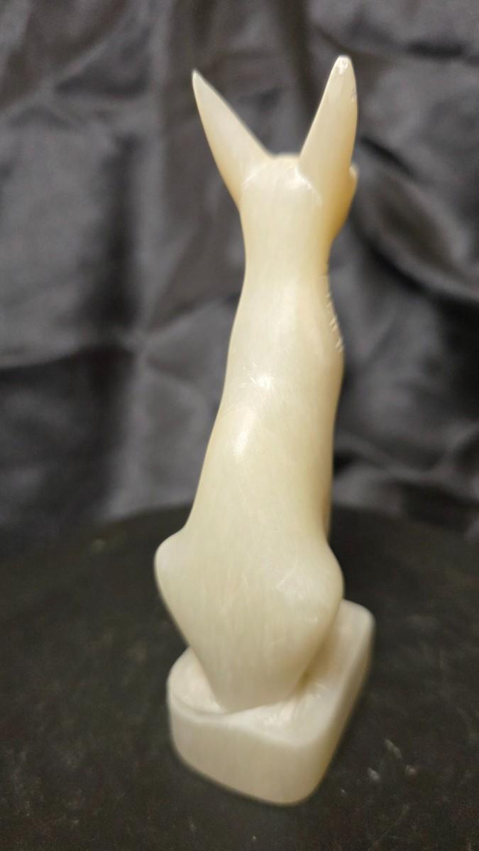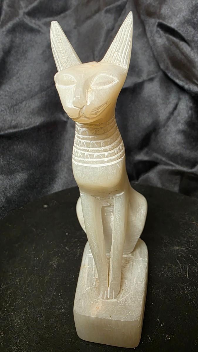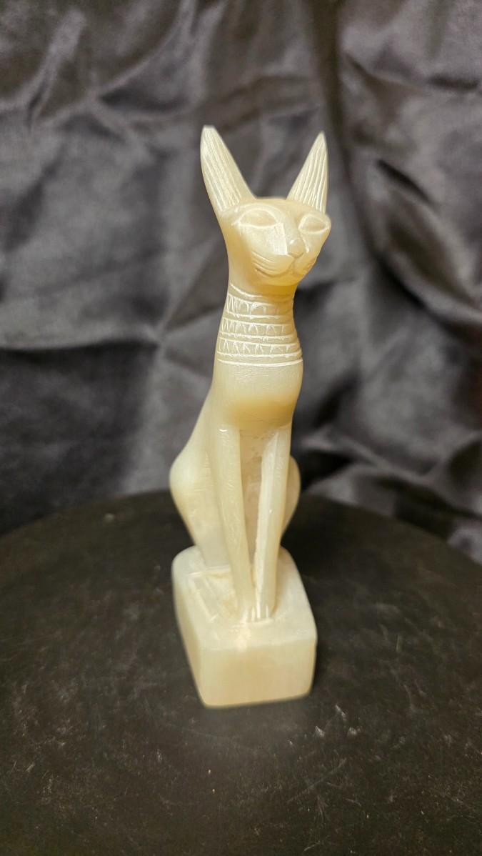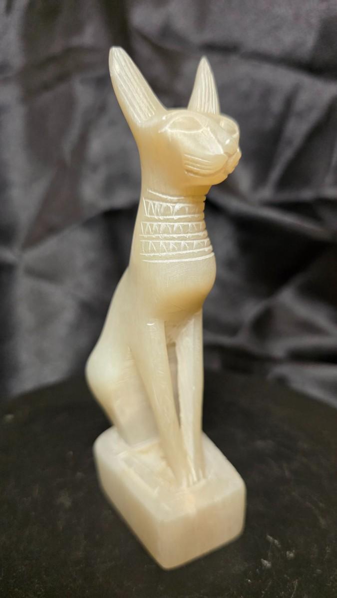 This elegant Egyptian cat figure captures the timeless presence of Bastet, the revered goddess of protection, harmony, and the home. Carved in a pale, semi-translucent natural stone, the sculpture presents the graceful seated feline form with elongated ears, softly defined facial features, and delicately incised decorative markings around the neck. The smooth polished surface and subtle internal glow of the stone create a quiet, refined presence that immediately draws the eye.