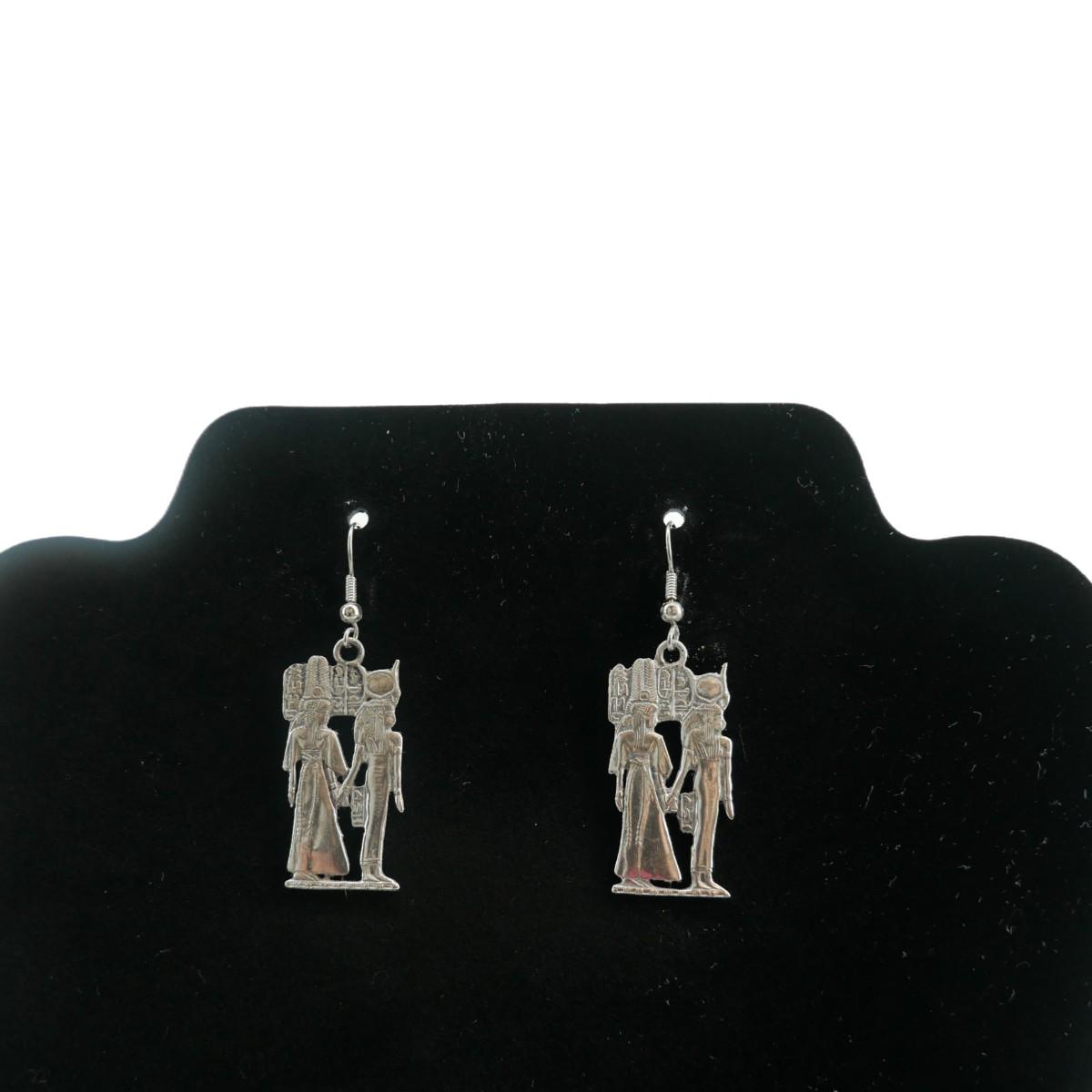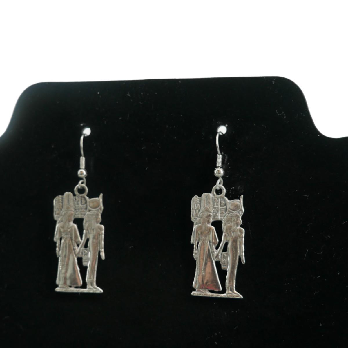 Egyptian figure drop silver earrings with makers mark on back. Measures approximately 1.75" x 1.75", total weight is 12g.
