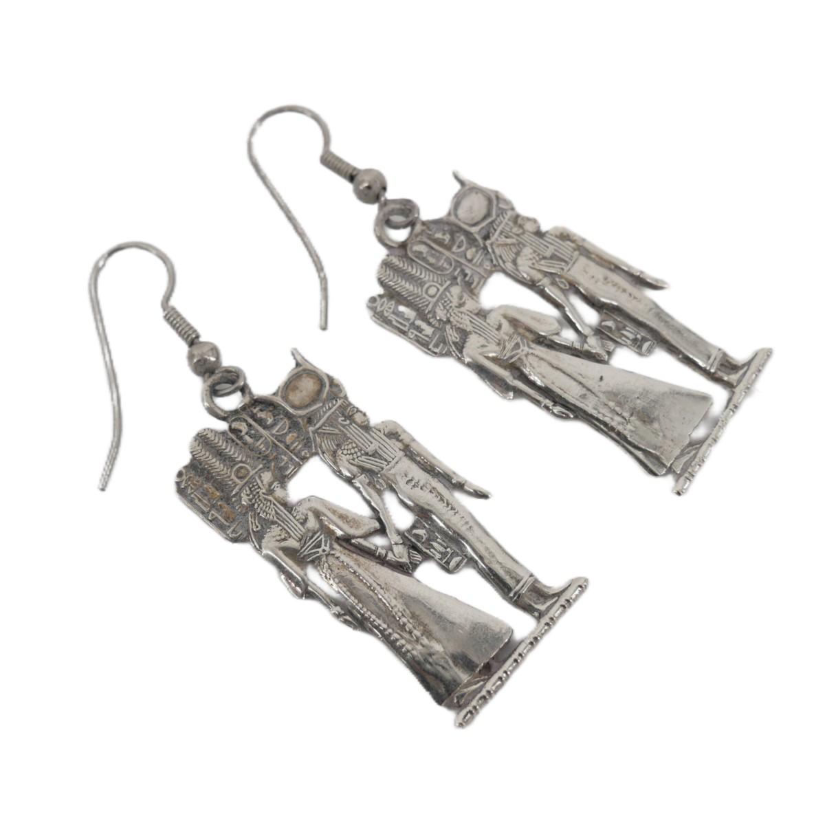 Egyptian figure drop silver earrings with makers mark on back. Measures approximately 1.75" x 1.75", total weight is 12g.