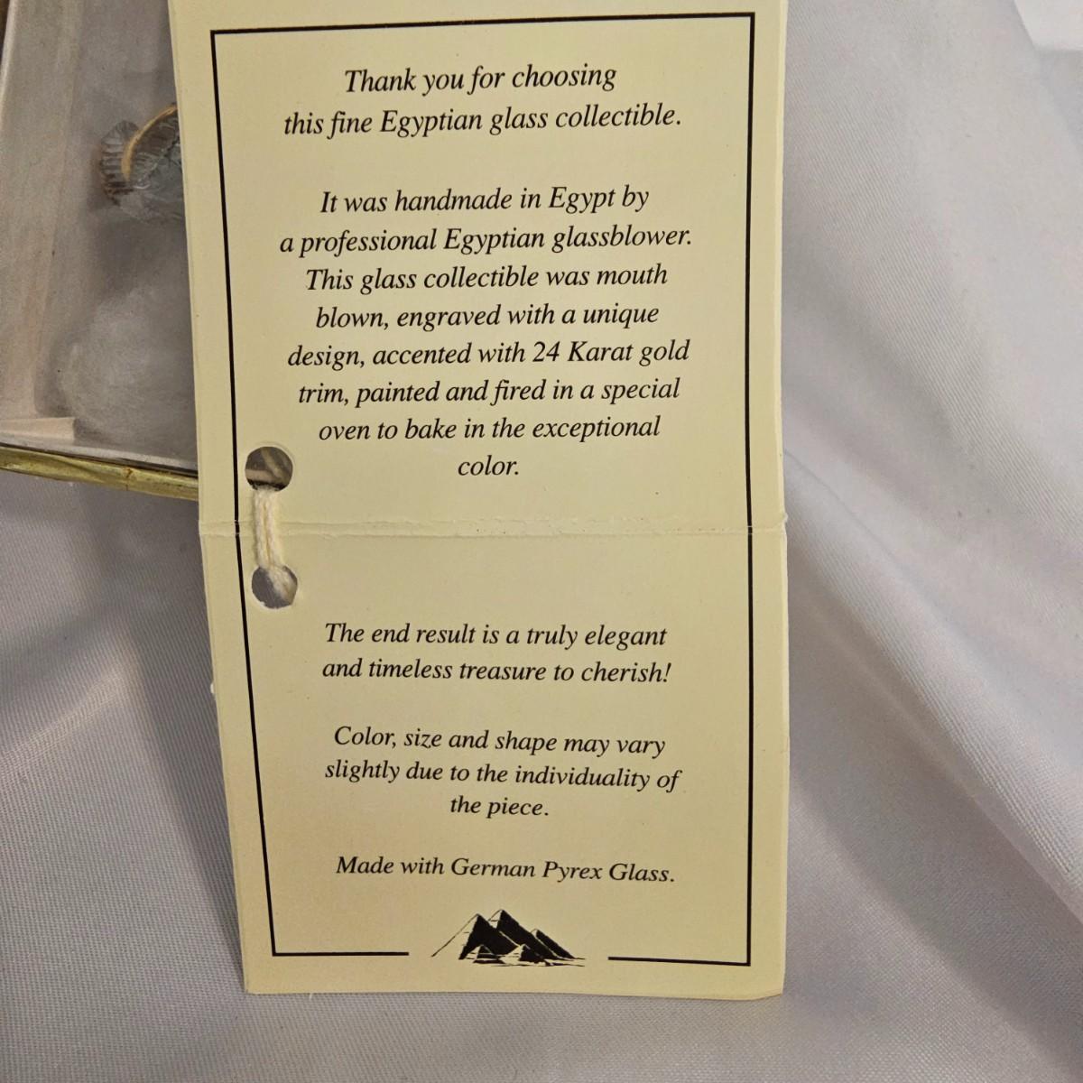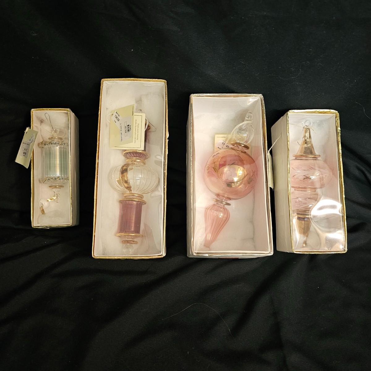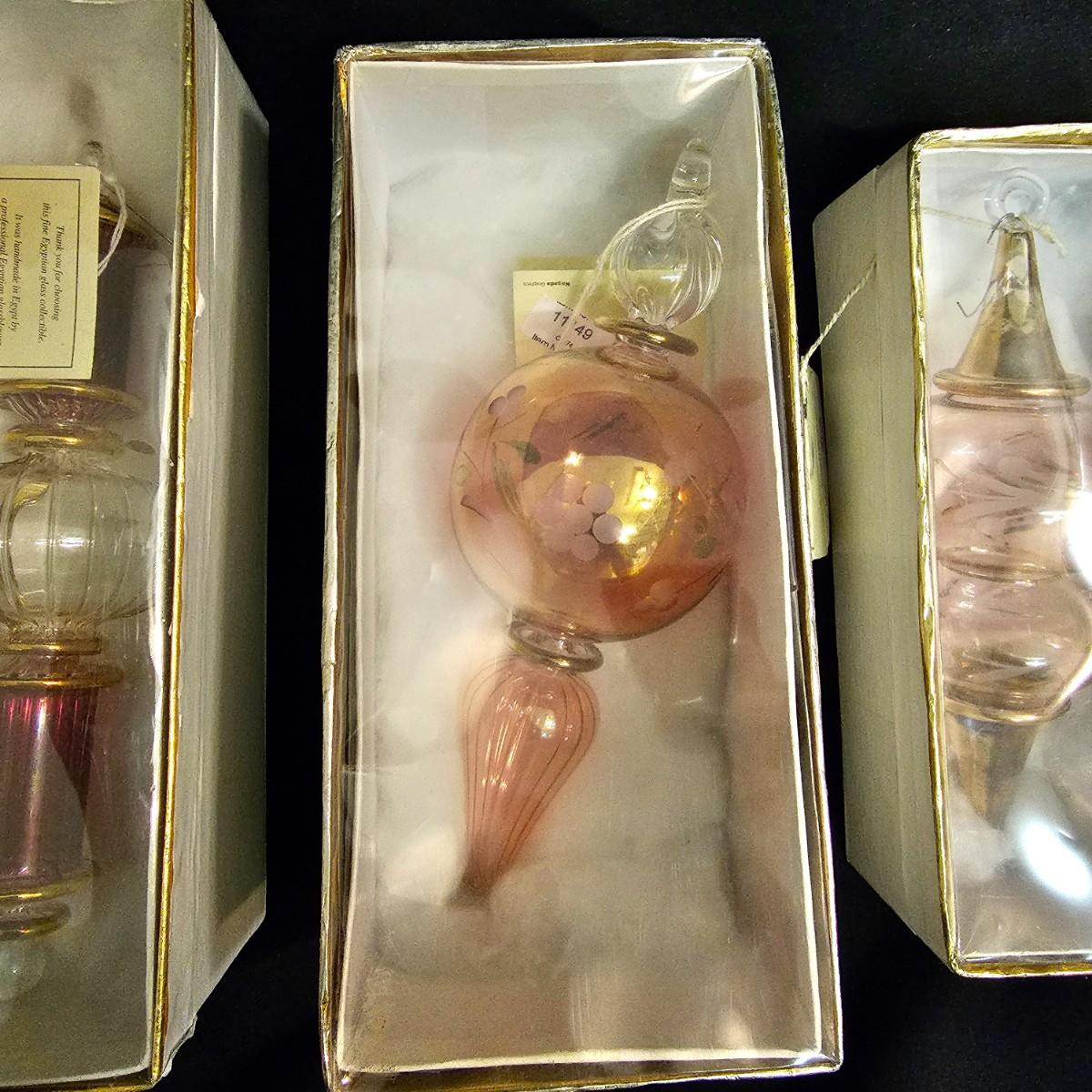 Four handblown Egyptian glass ornaments in boxes. Made from German Pyrex glass and decorated with 24k gold accents. Items are free from chips and nicks, there is some discoloring onbthe gold trim. See photos for details. Shipping available.