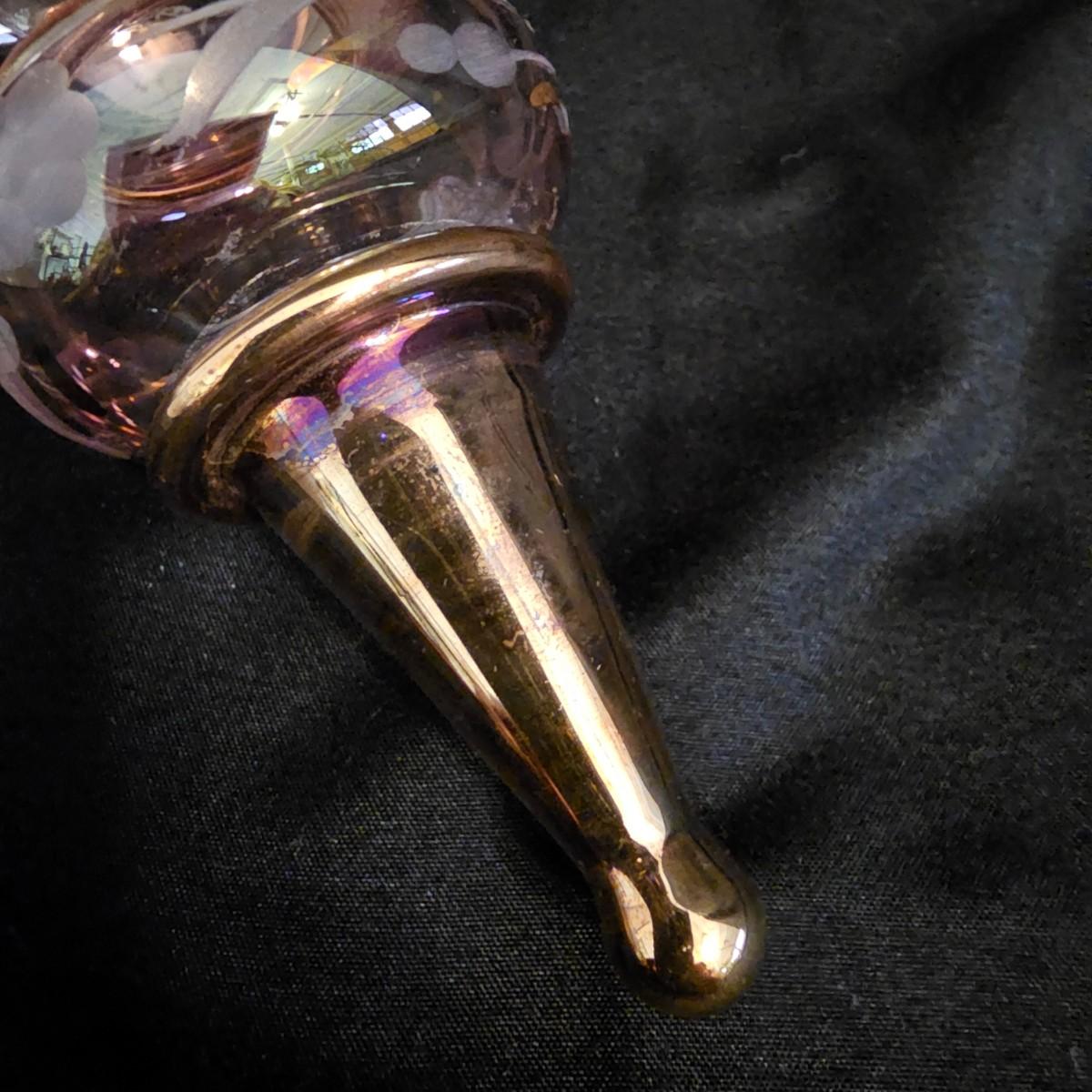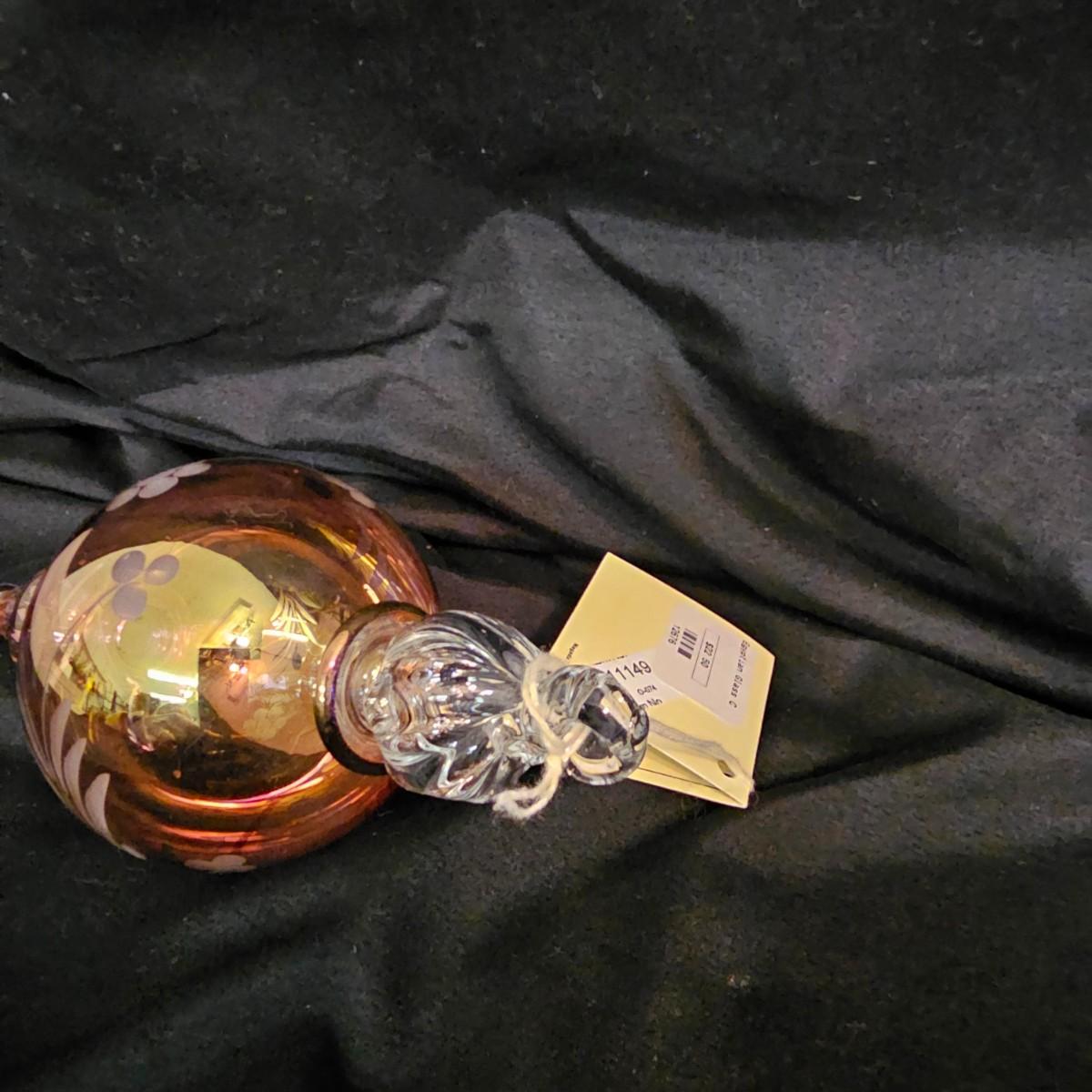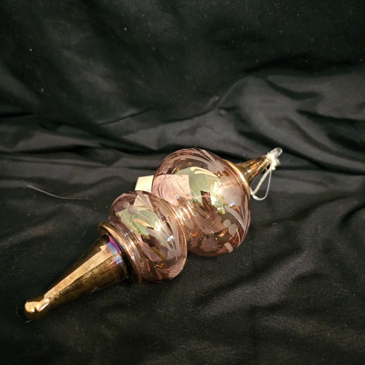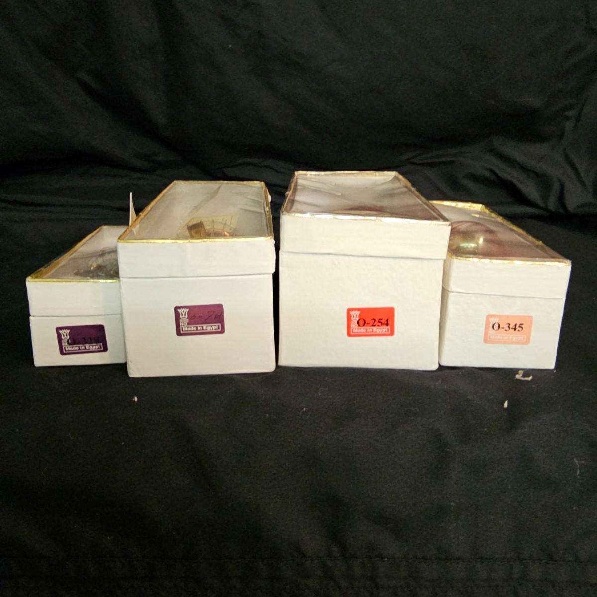 Four handblown Egyptian glass ornaments in boxes. Made from German Pyrex glass and decorated with 24k gold accents. Items are free from chips and nicks, there is some discoloring onbthe gold trim. See photos for details. Shipping available.