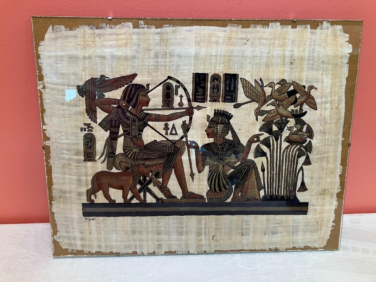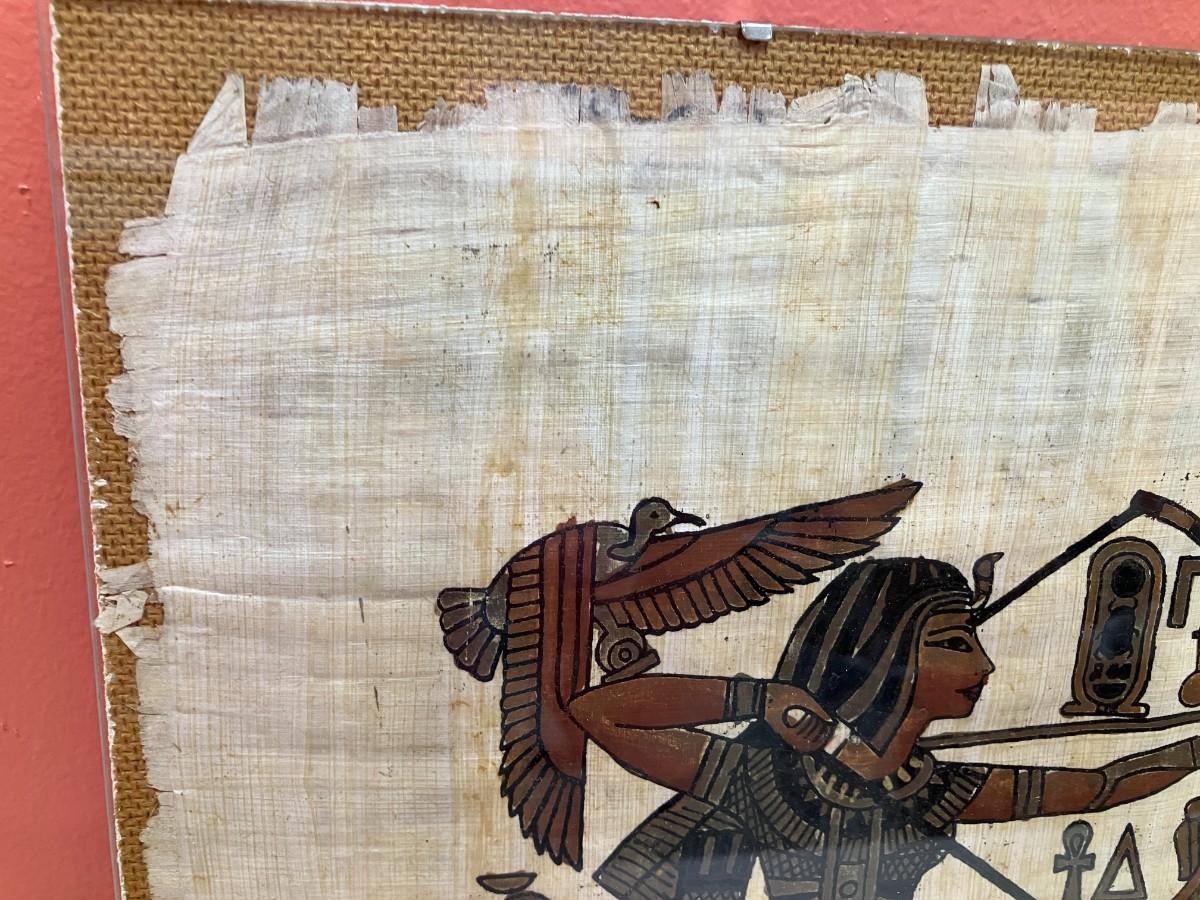 Egyptian art on papyrus paper, behind glass, in excellent condition. 14.5"H x 18"W