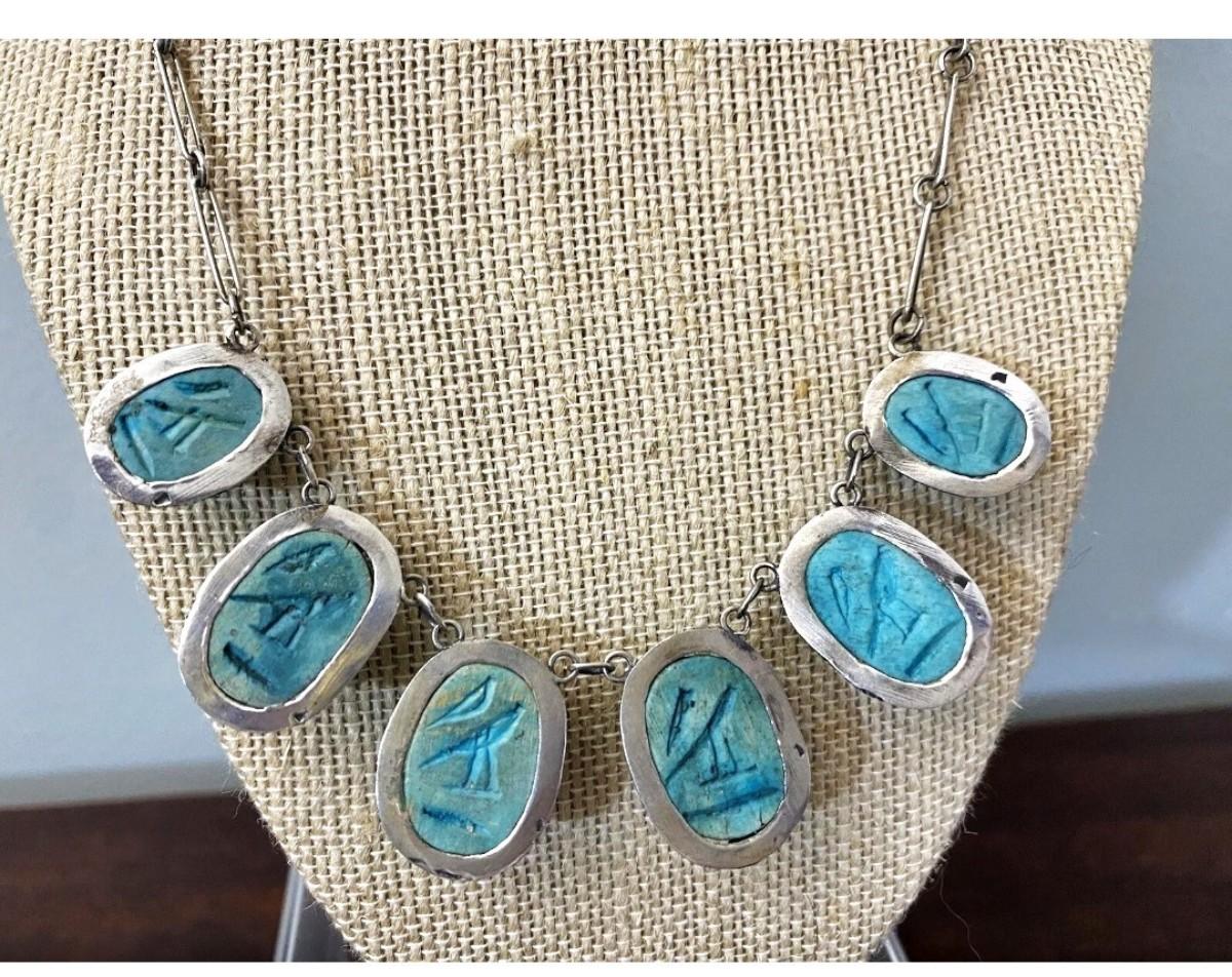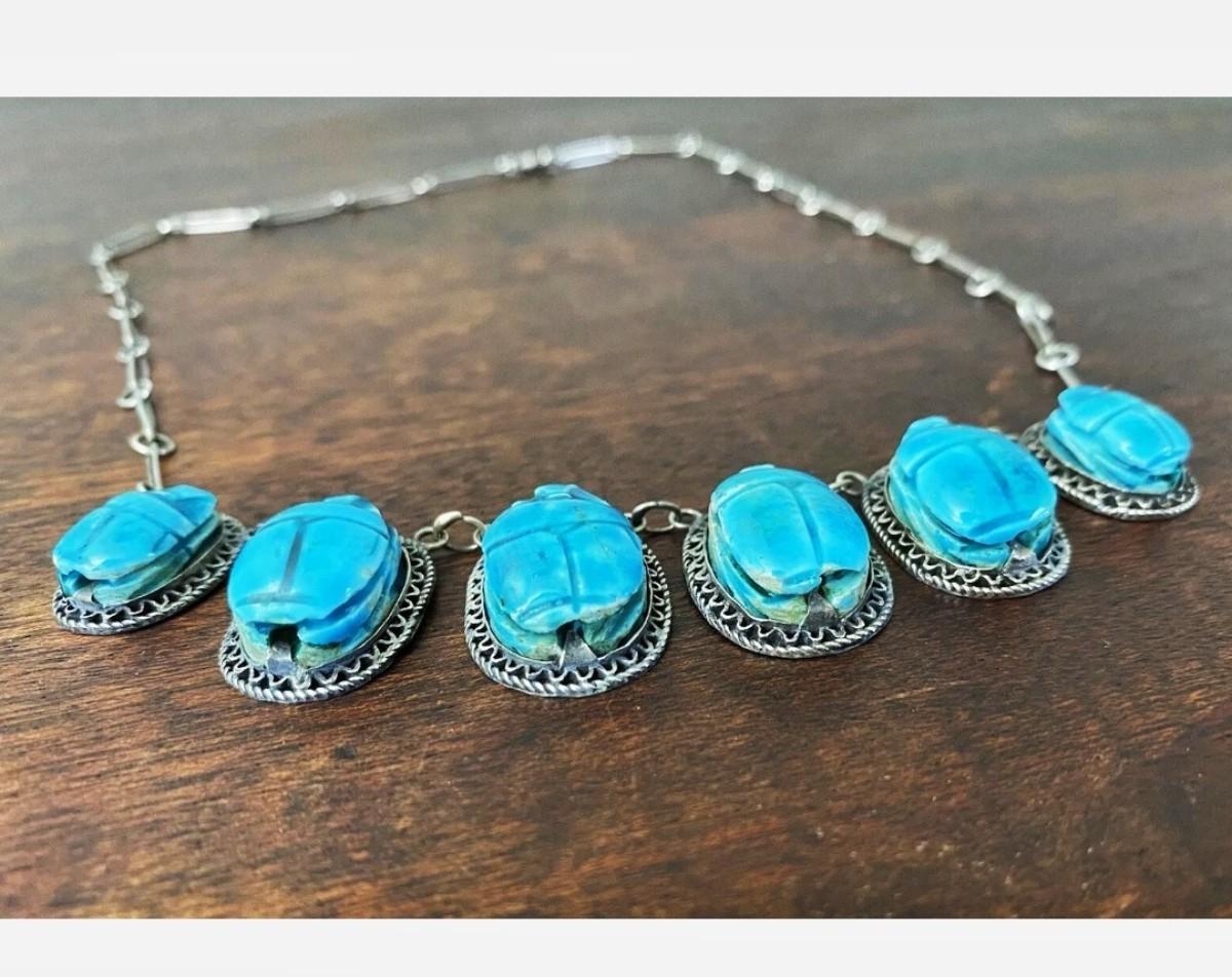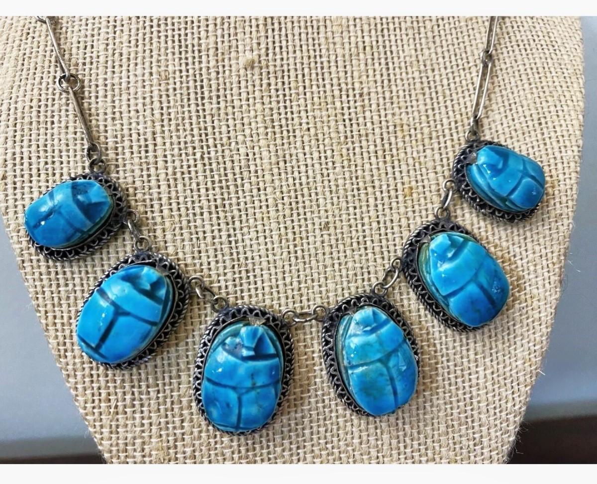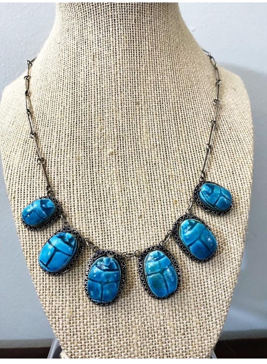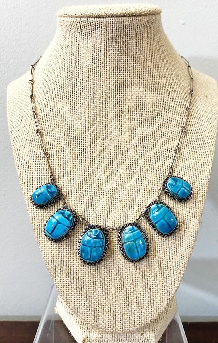 Egyptian Revival 1940's Statement Silver & Scarab Filigee Necklace