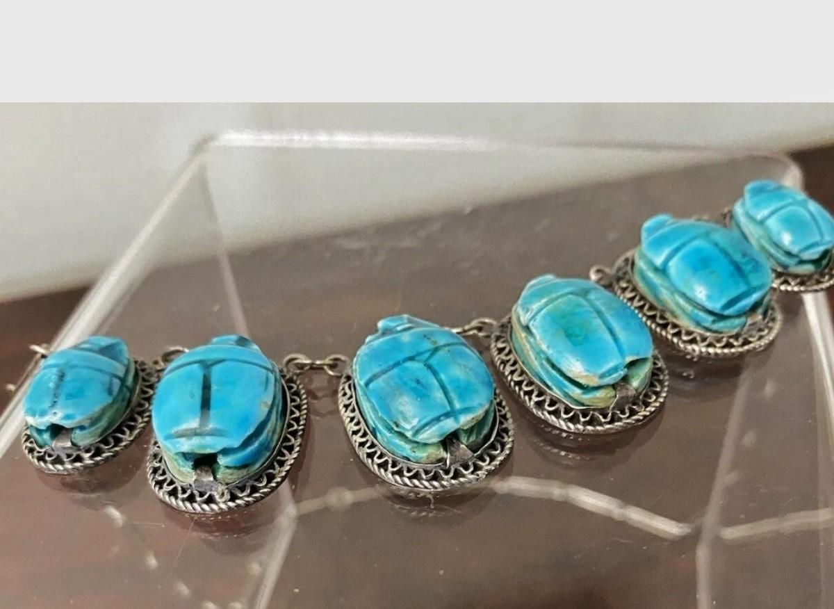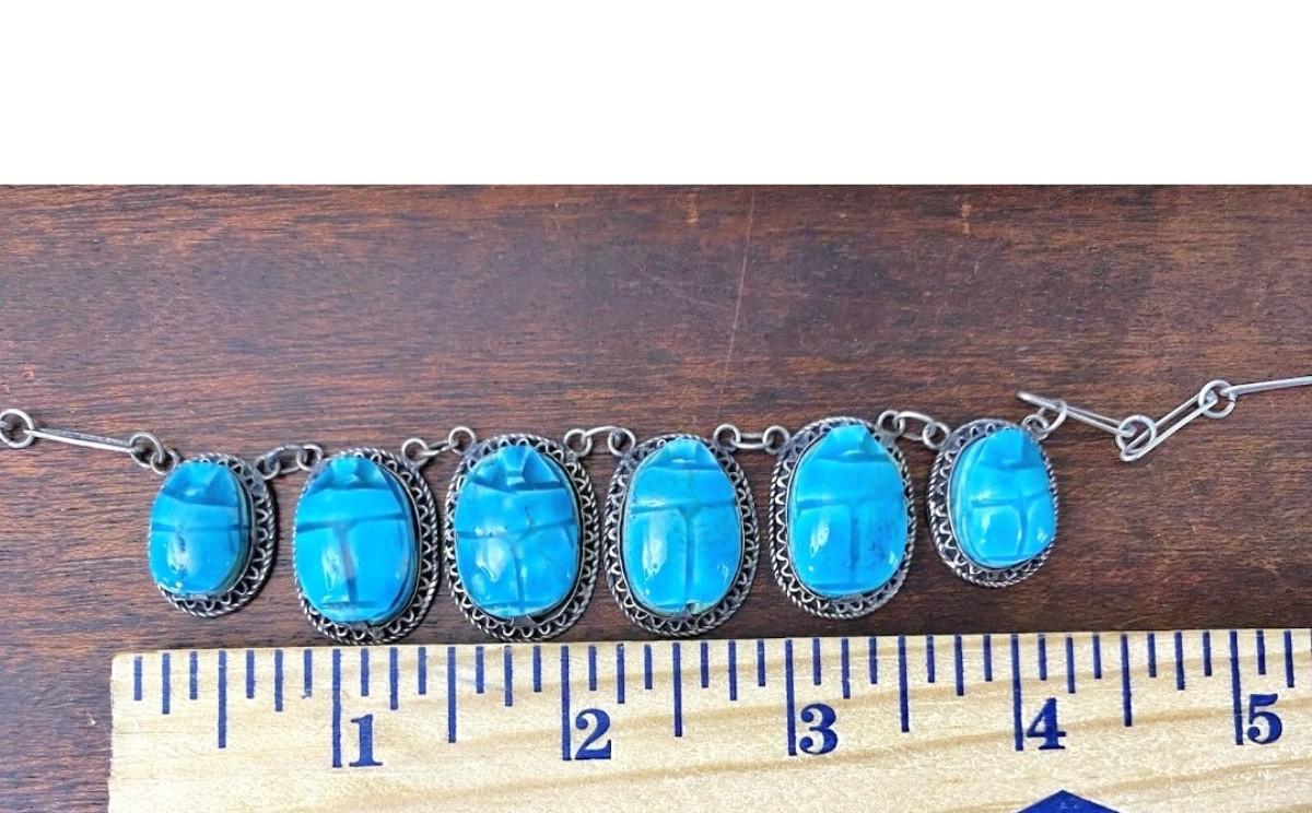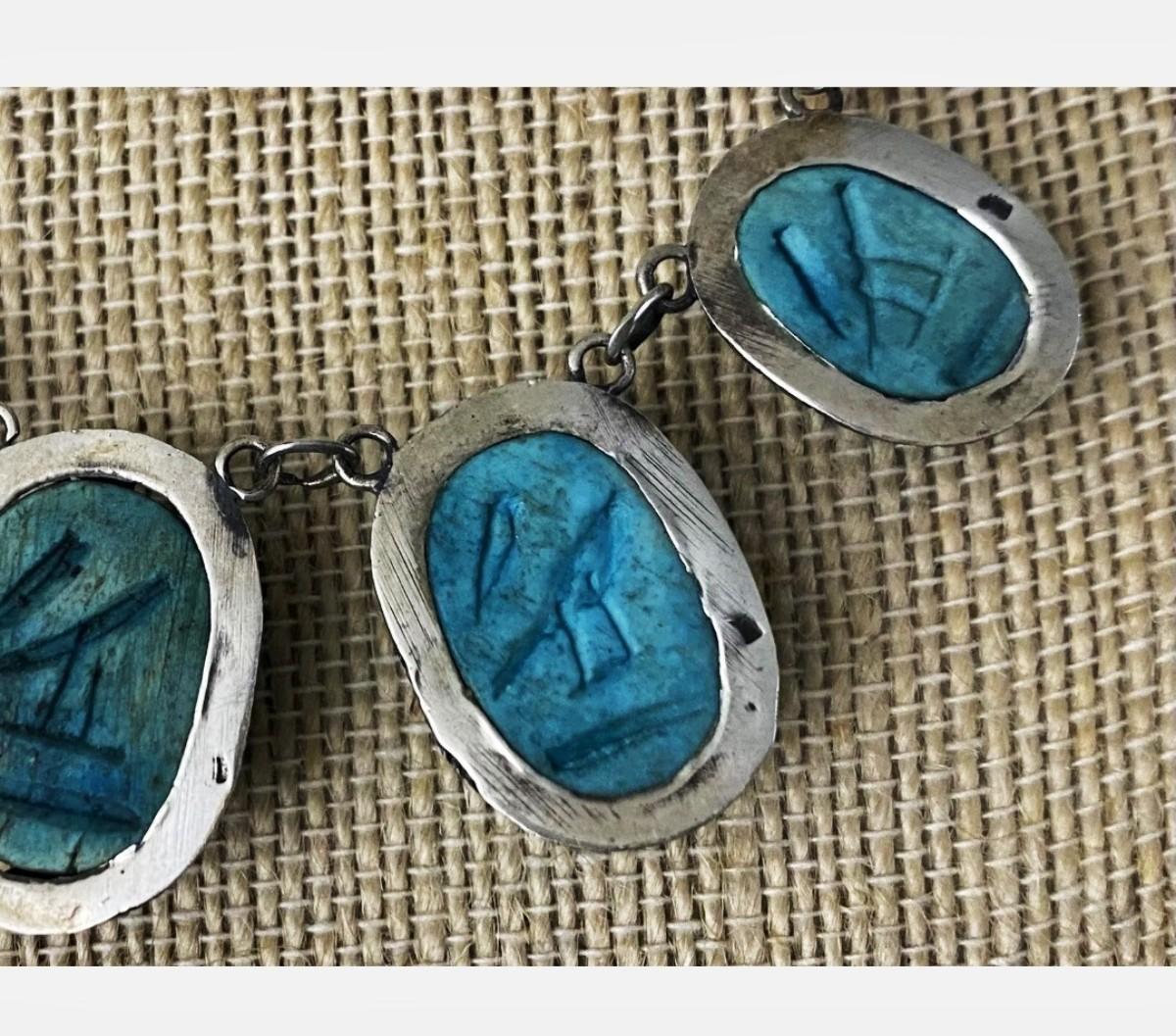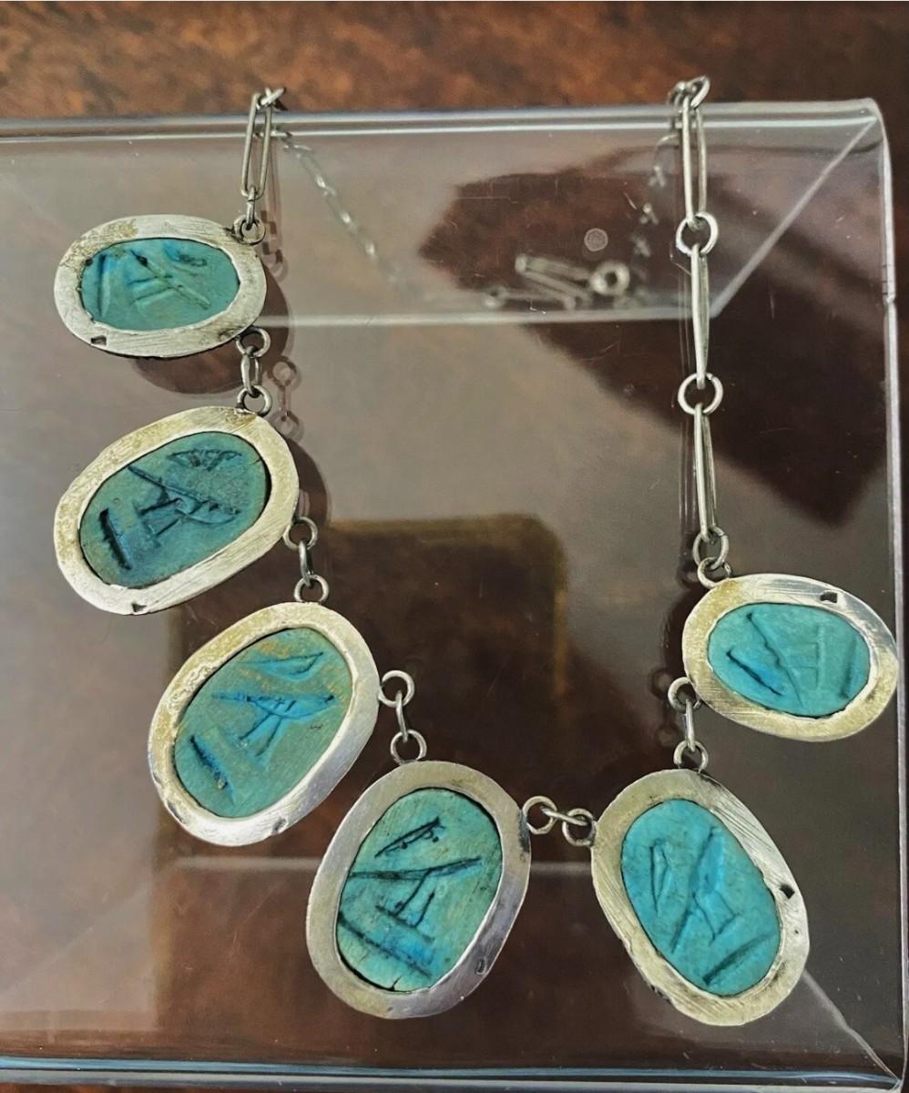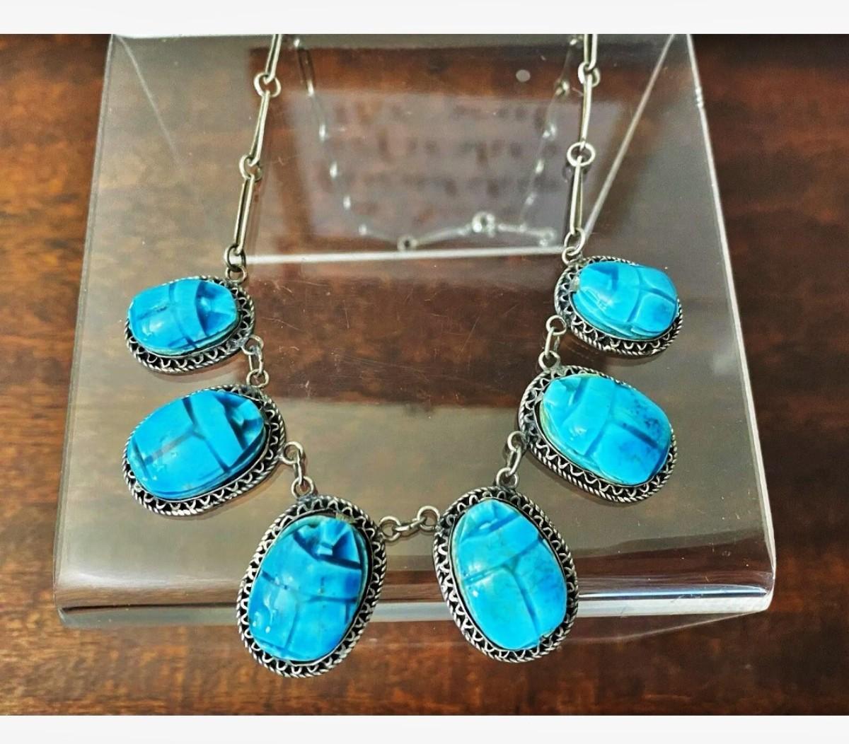 Egyptian Revival 1940's Statement Silver & Scarab Filigee Necklace