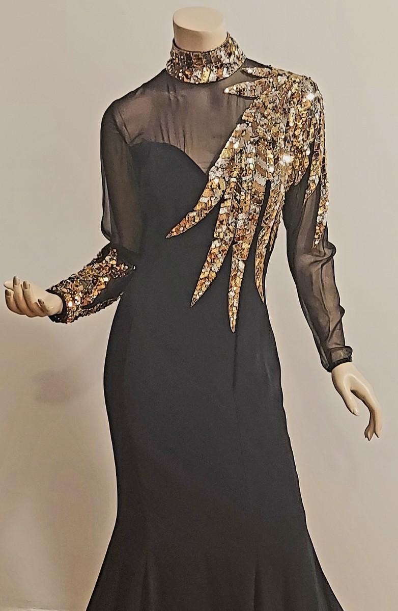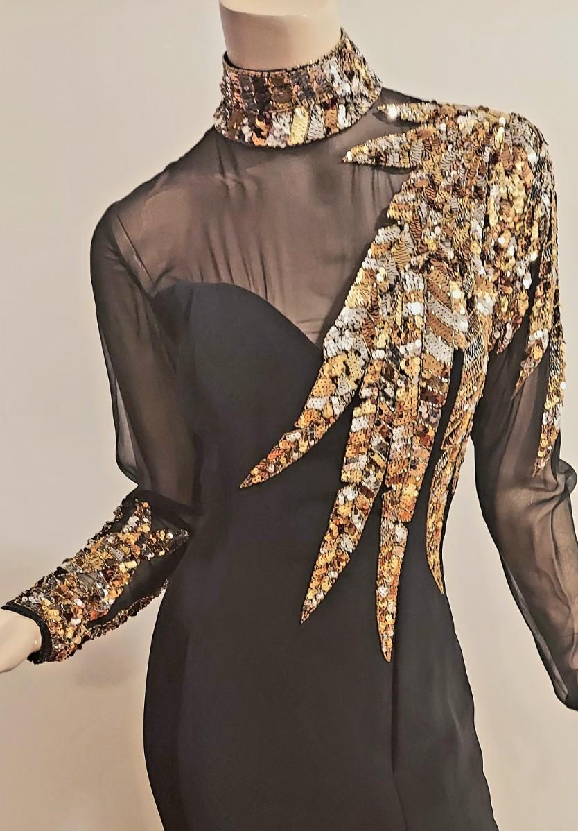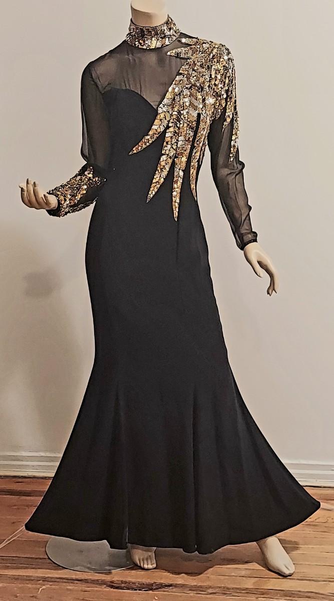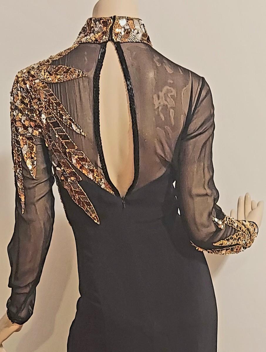 Vtg 1980s Oleg Cassini Crepe Maxi Gown with Gold Sequins Embellished Illusion Bodice. Oval back opening and back Zipper. This Stunning Festive Glamorous Gown is Drop Dead Gorgeous and in Amazing Vtg Condition almost like new.
