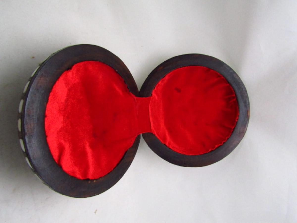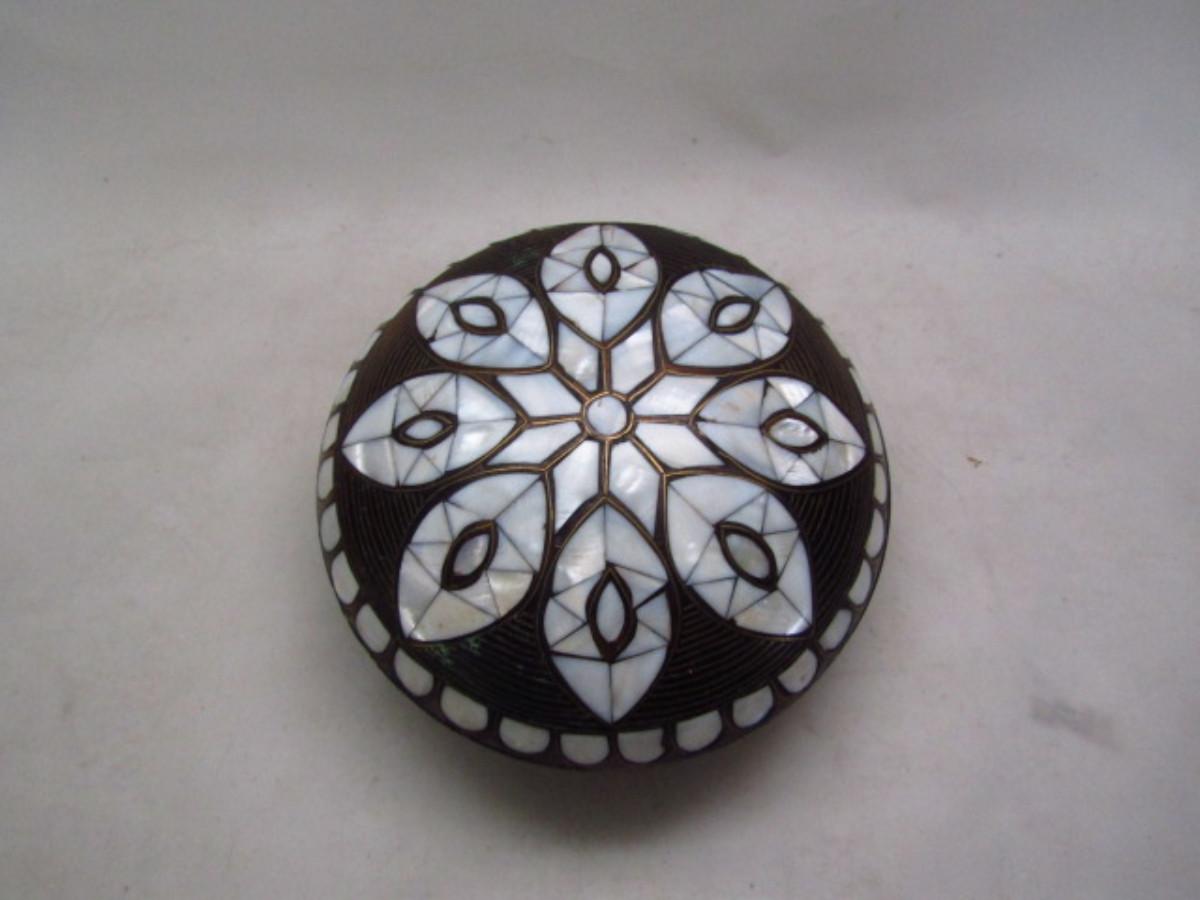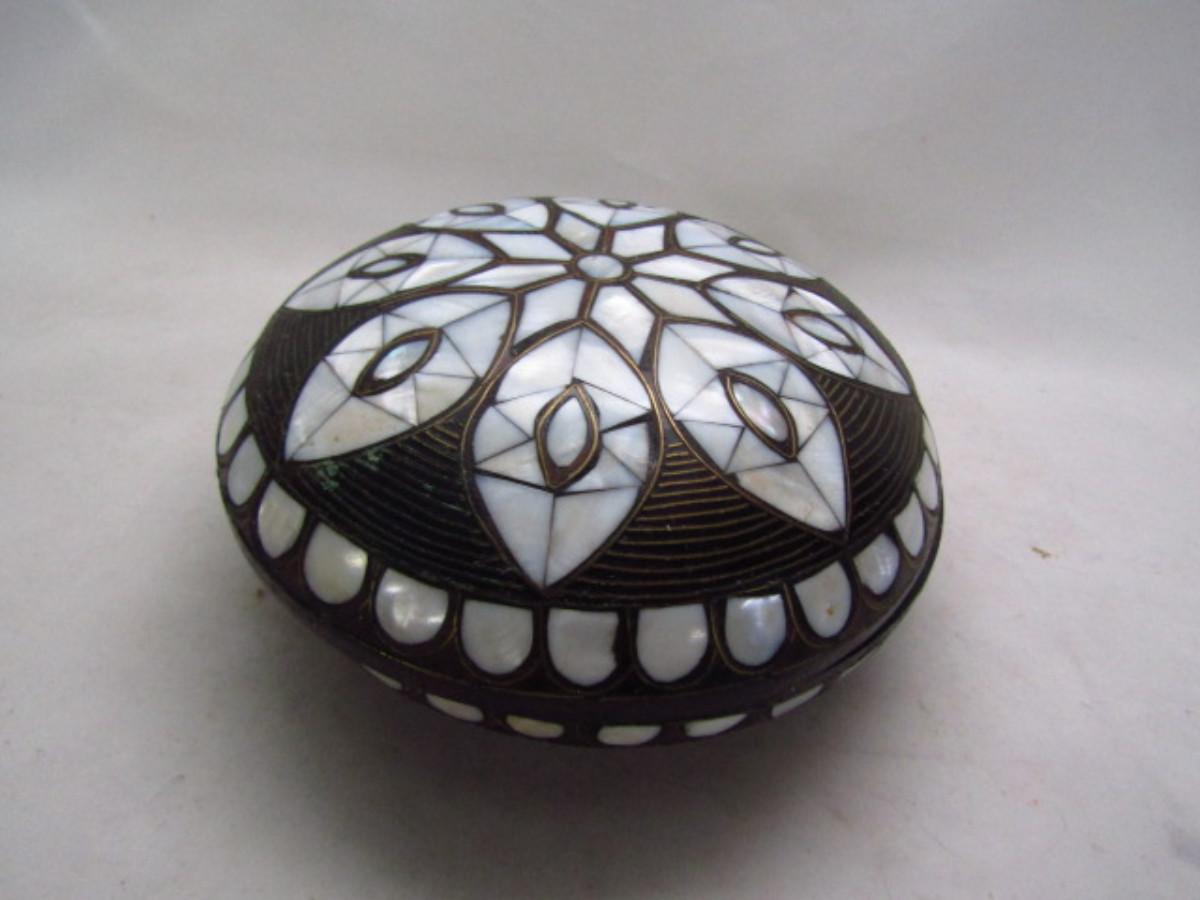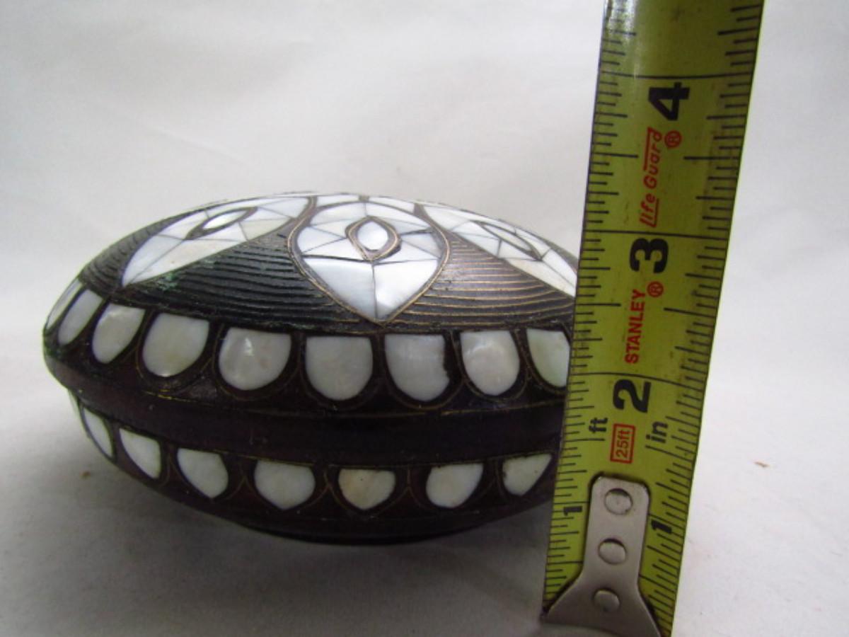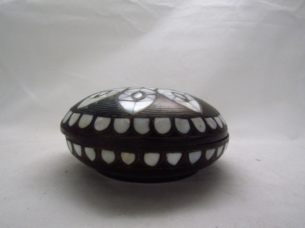 Egyptian Style Wooden Storage Box. Mother of pearl inlay. Lined interior.