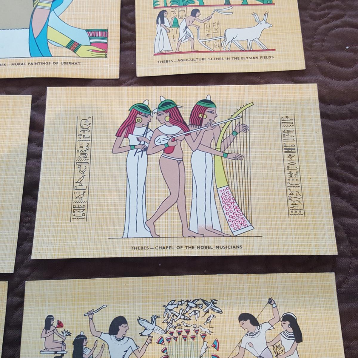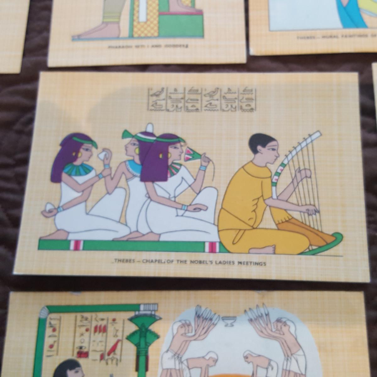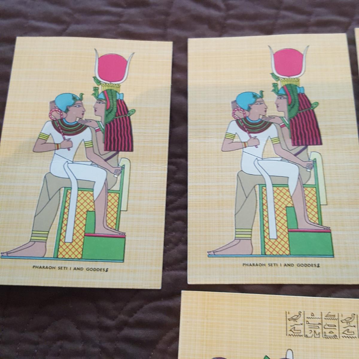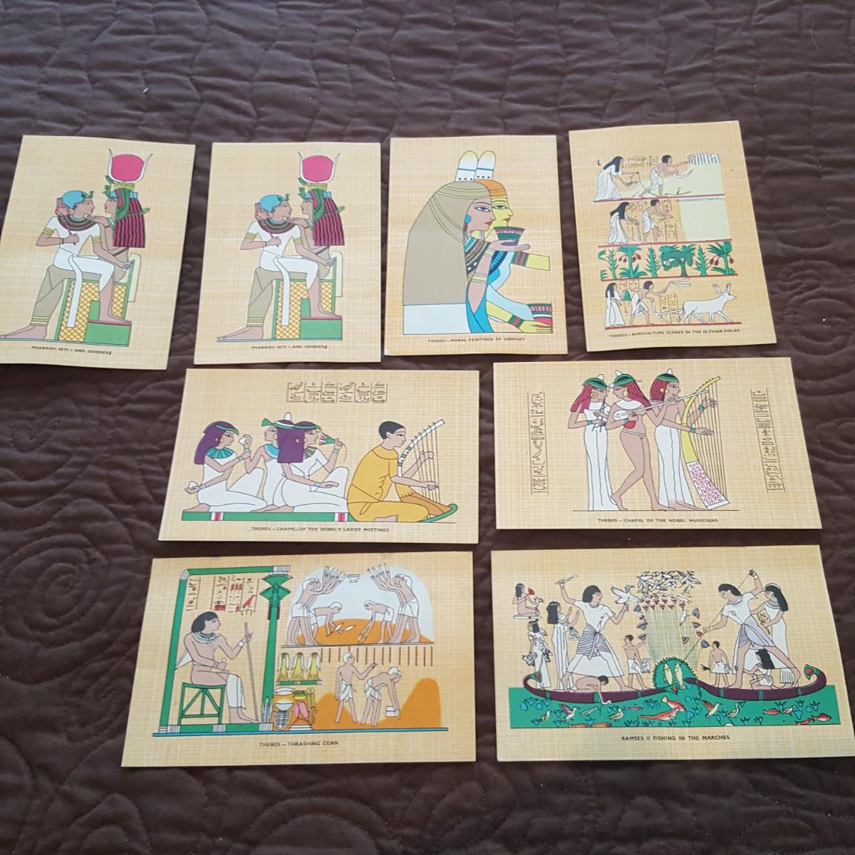 This auction lot is for a series of Egyptian Themed Postcards. These linen-feel cards sport 8 different designs, with one additional duplicate. Great to have, hold or use for any creative purpose. Vintage postcards made in Cairo - most probably a tourist purchase.
