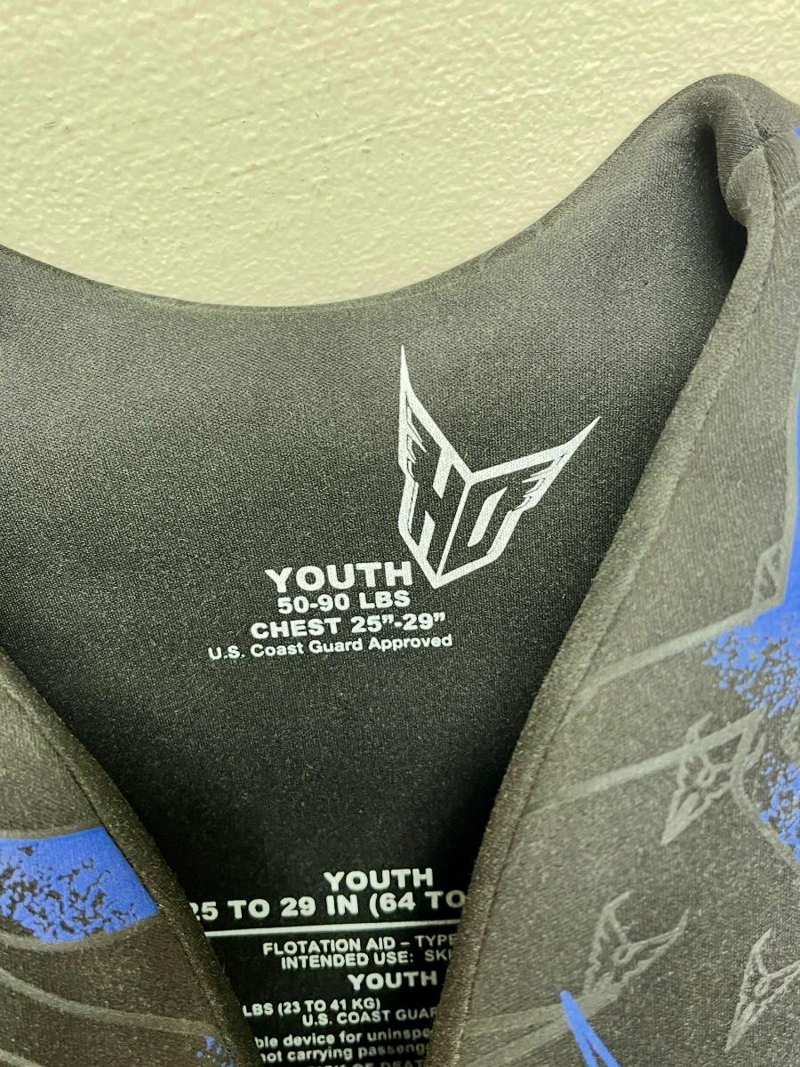 Youth size floatation vest, rated for 50-90 pounds. Chest size 25" to 29". US Coast guard approved.