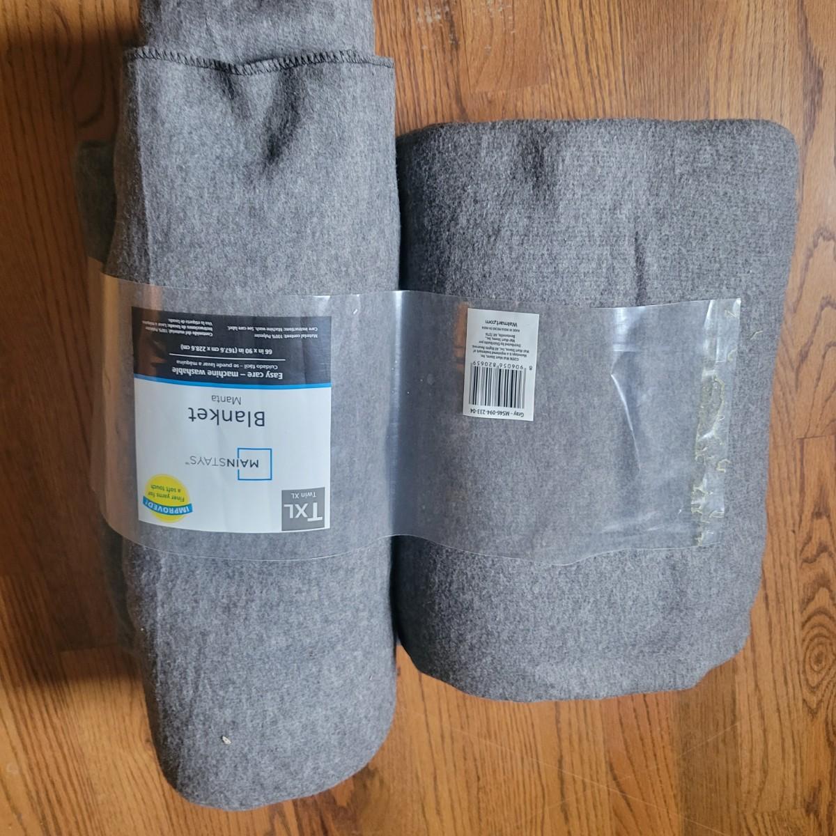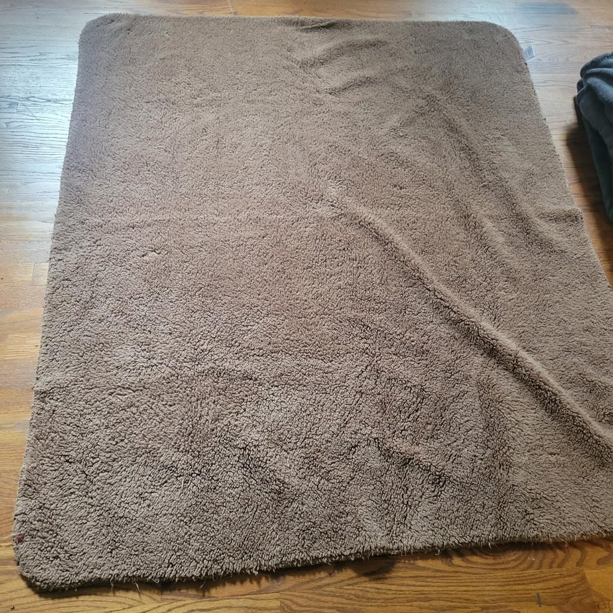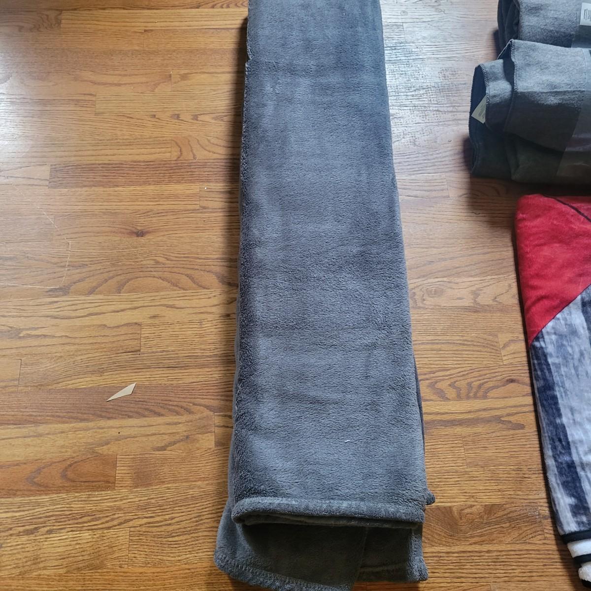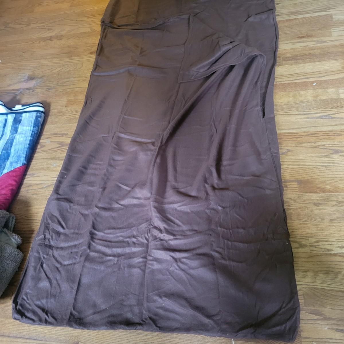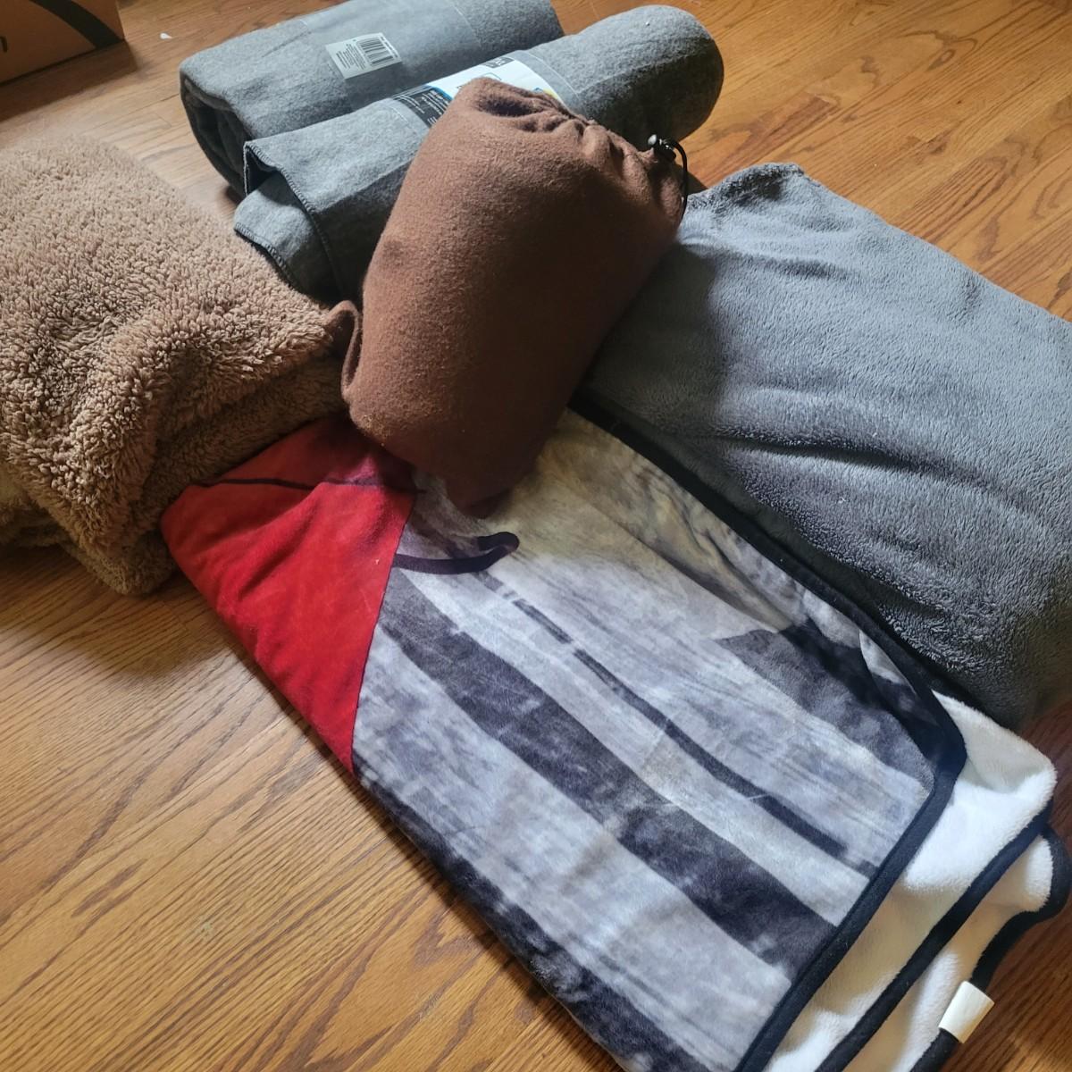 Eifel tower blanket appears unused. Measure approximately 50" x 57", 2 twin sized Mainstays soft blankets, 1 grey queen sized fleece blanket, 1 brown, shaggy fleece throw and 1 brown flannel sleeping bag liner with storage bag. Shipping available
