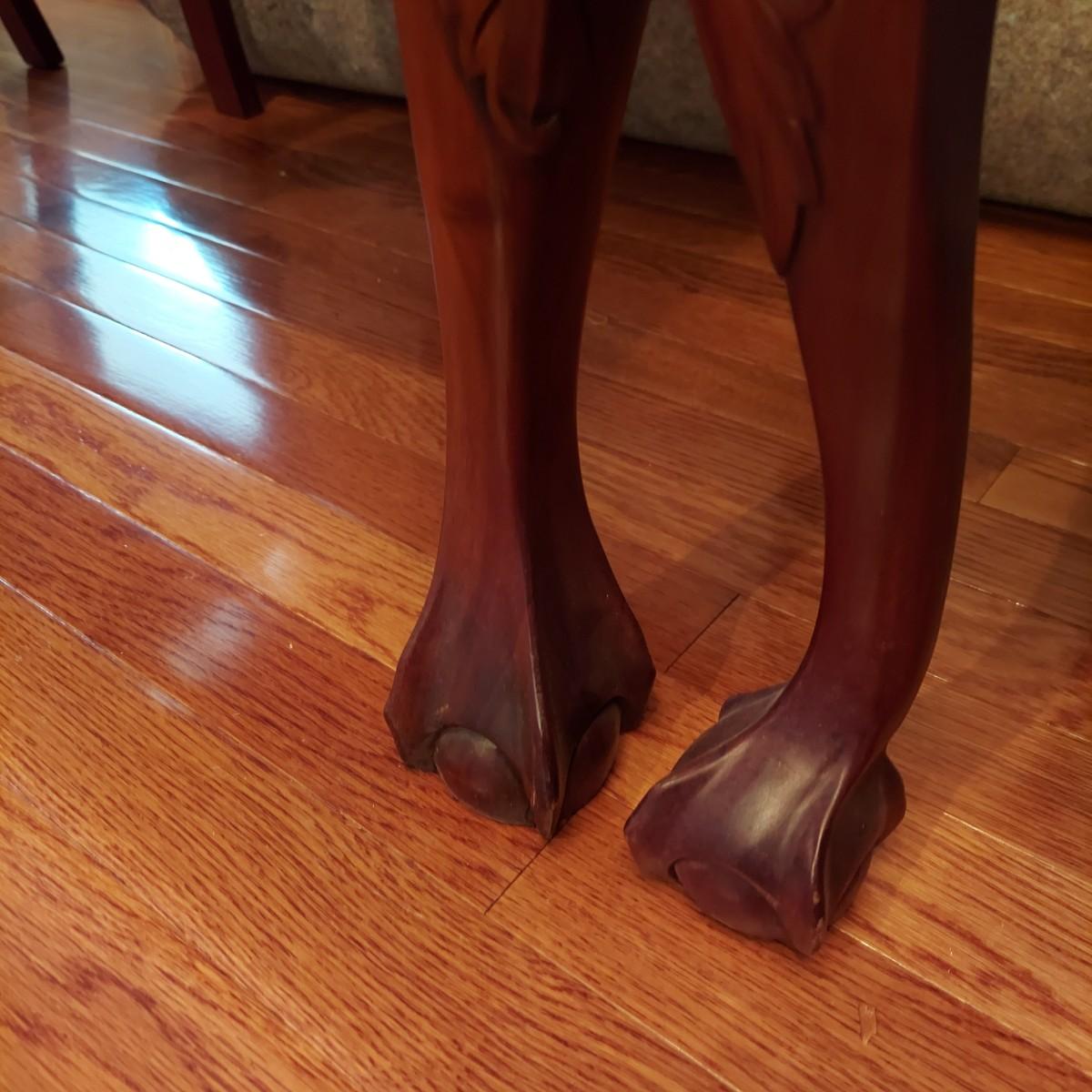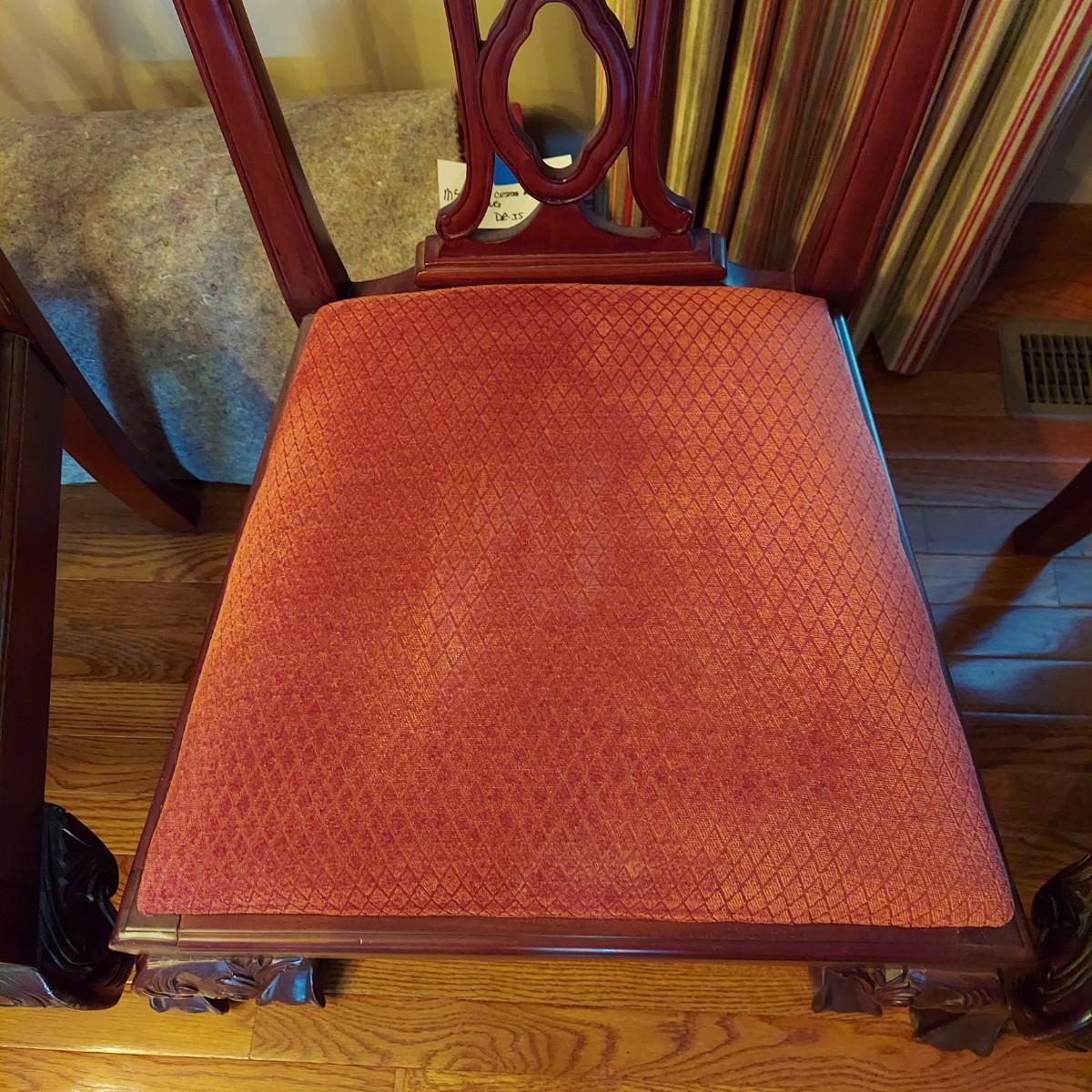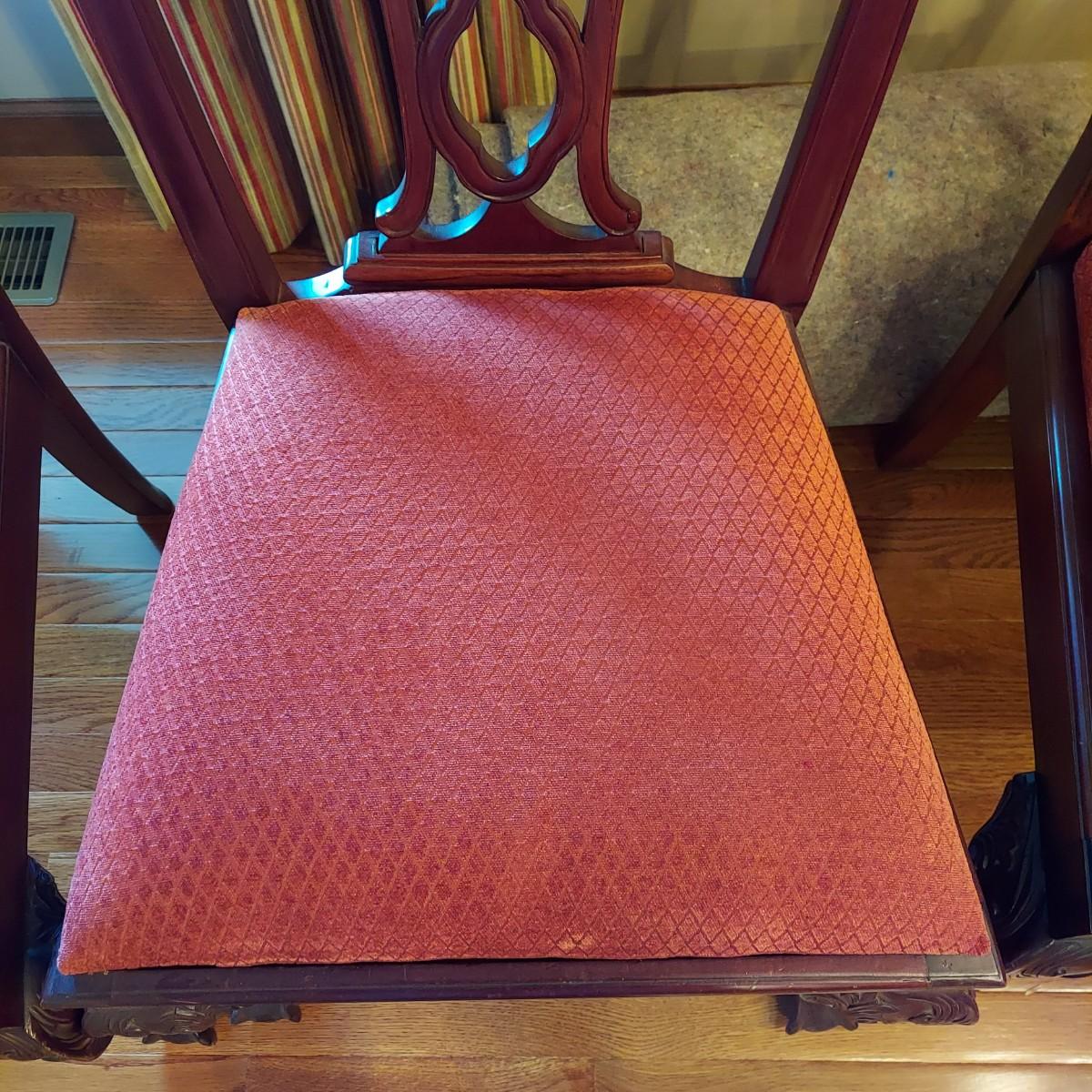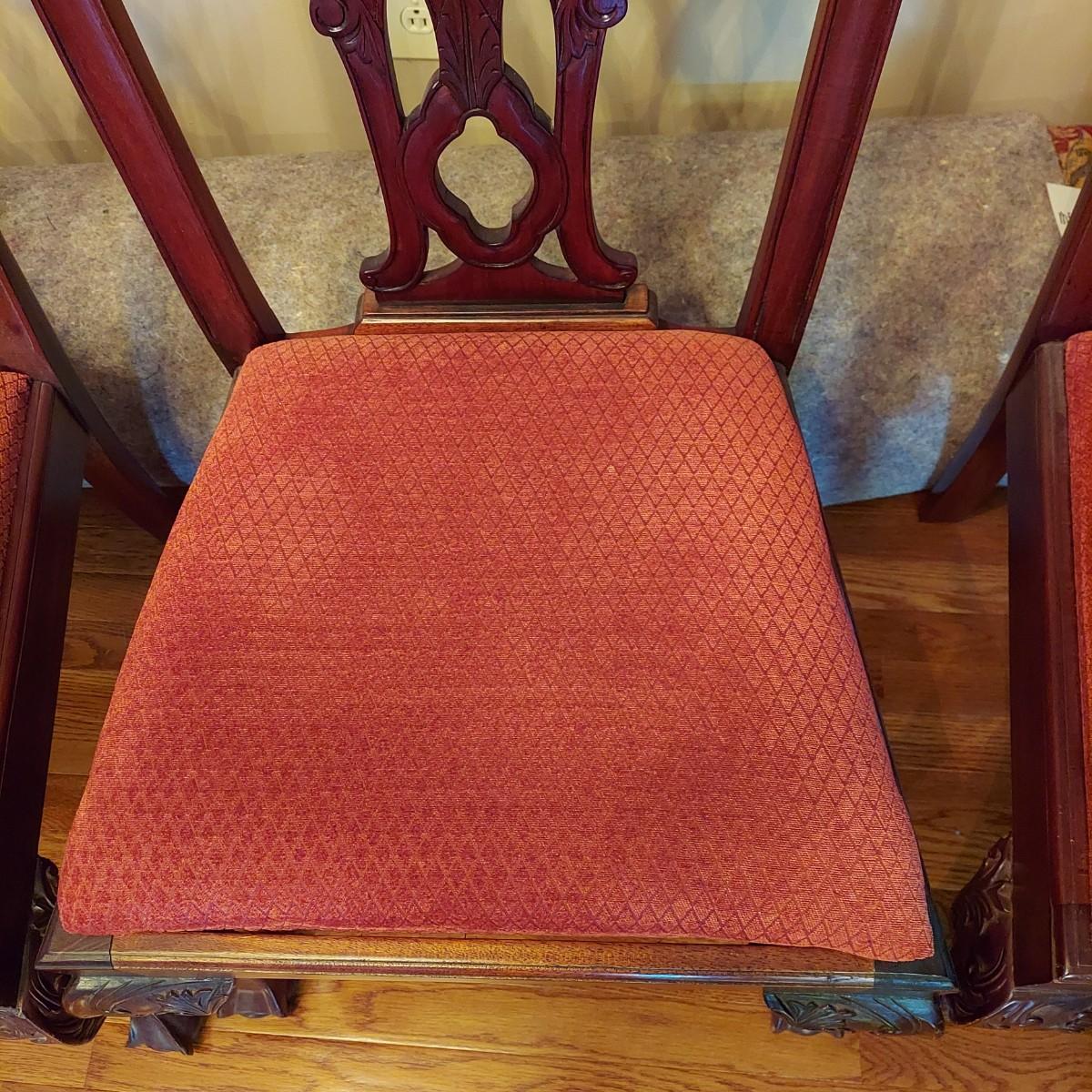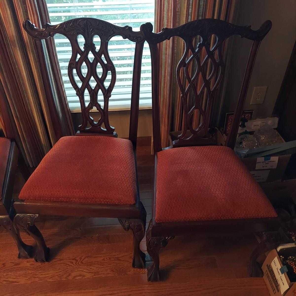 Eight Chippendale style chairs with seats that have been reupholstered. Each chair features a wide seat, ribbon back and clawfoot details. They measure 21" x 22" x 40"H with a seat height of 19". Local Pickup Only.