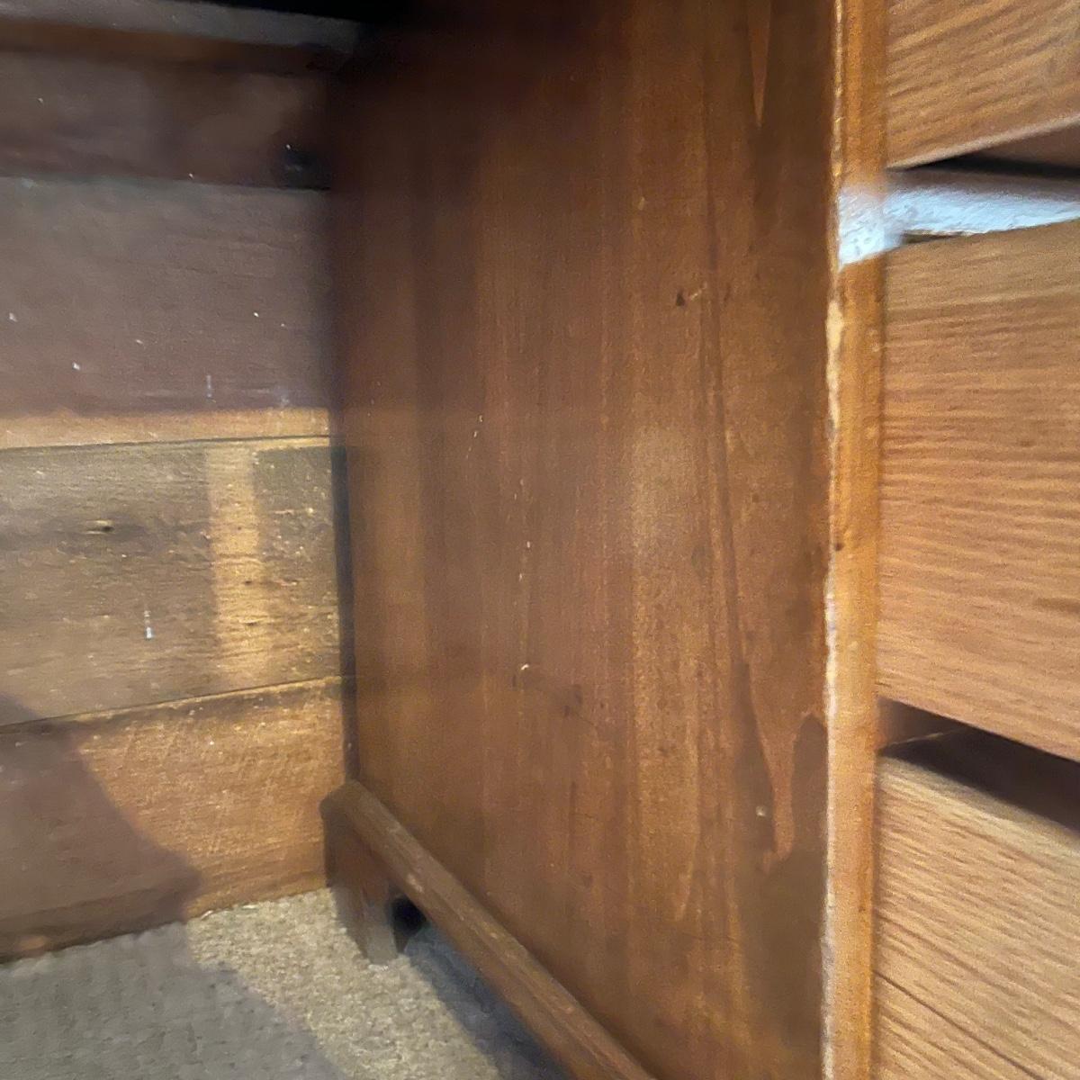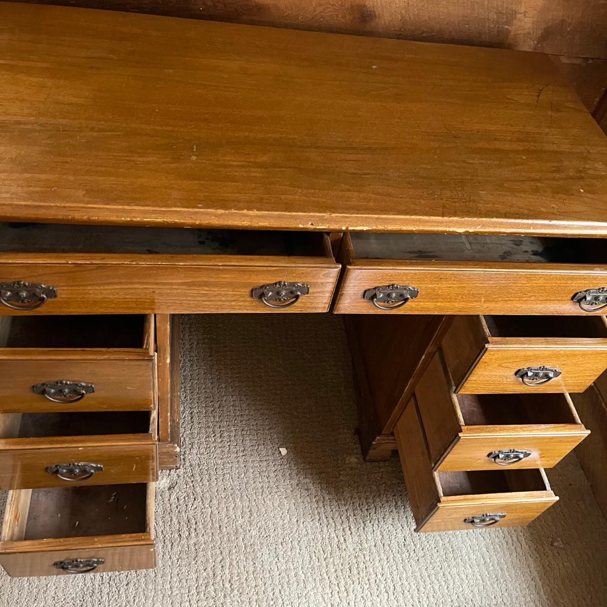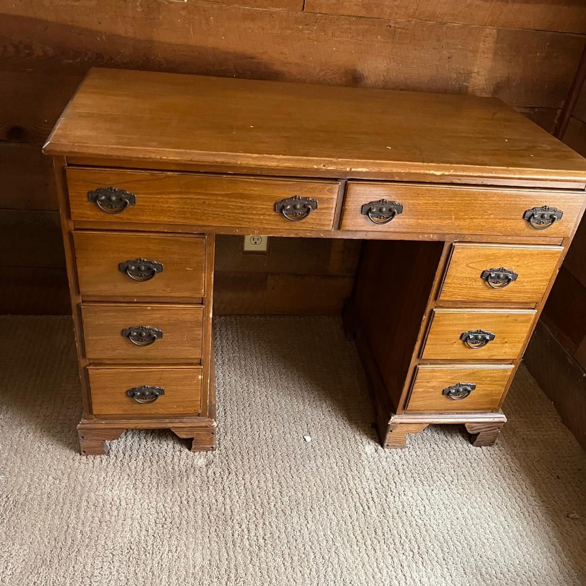 This wooden eight dovetailed drawer desk has some scratches and nicks, see but is otherwise in good condition and structurally sound. Desk measures 20” x 40” x 29.5”.