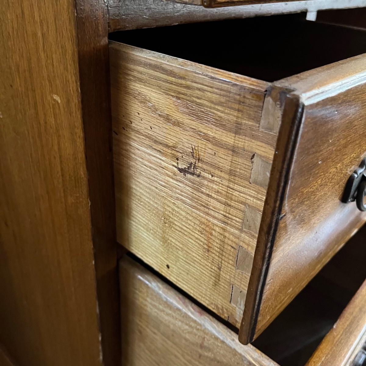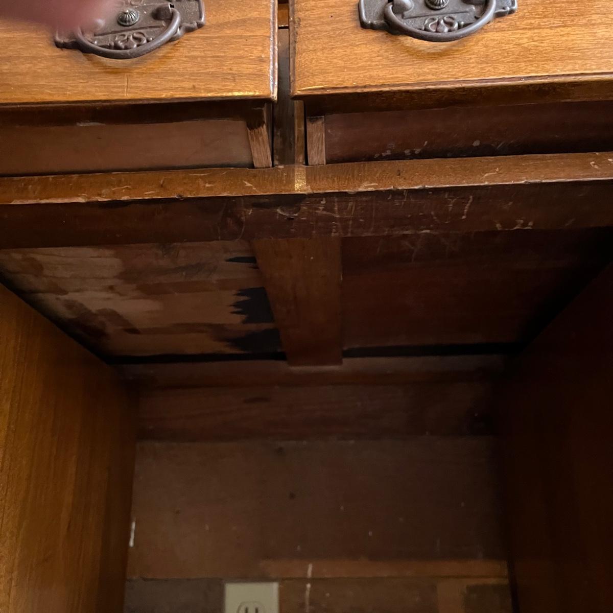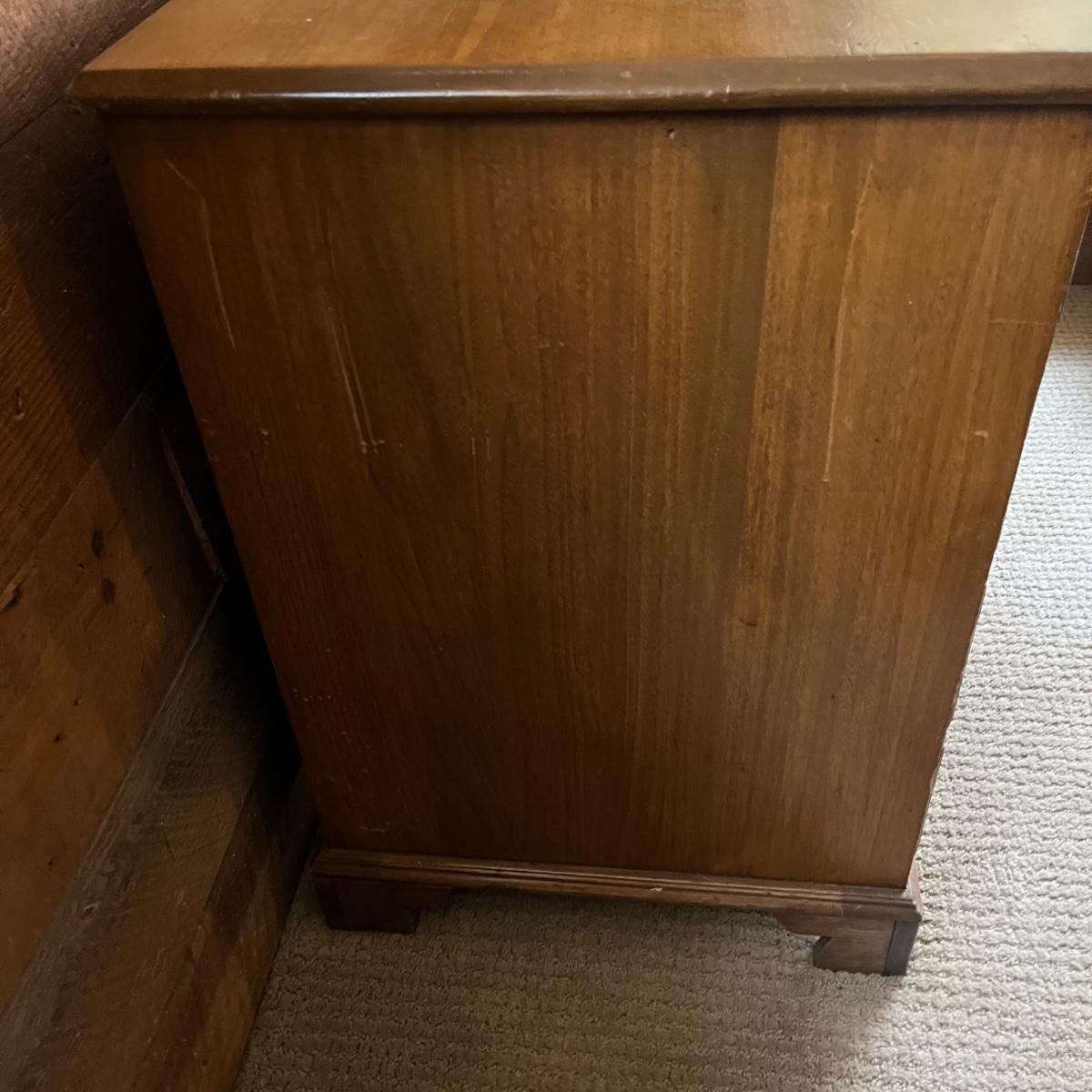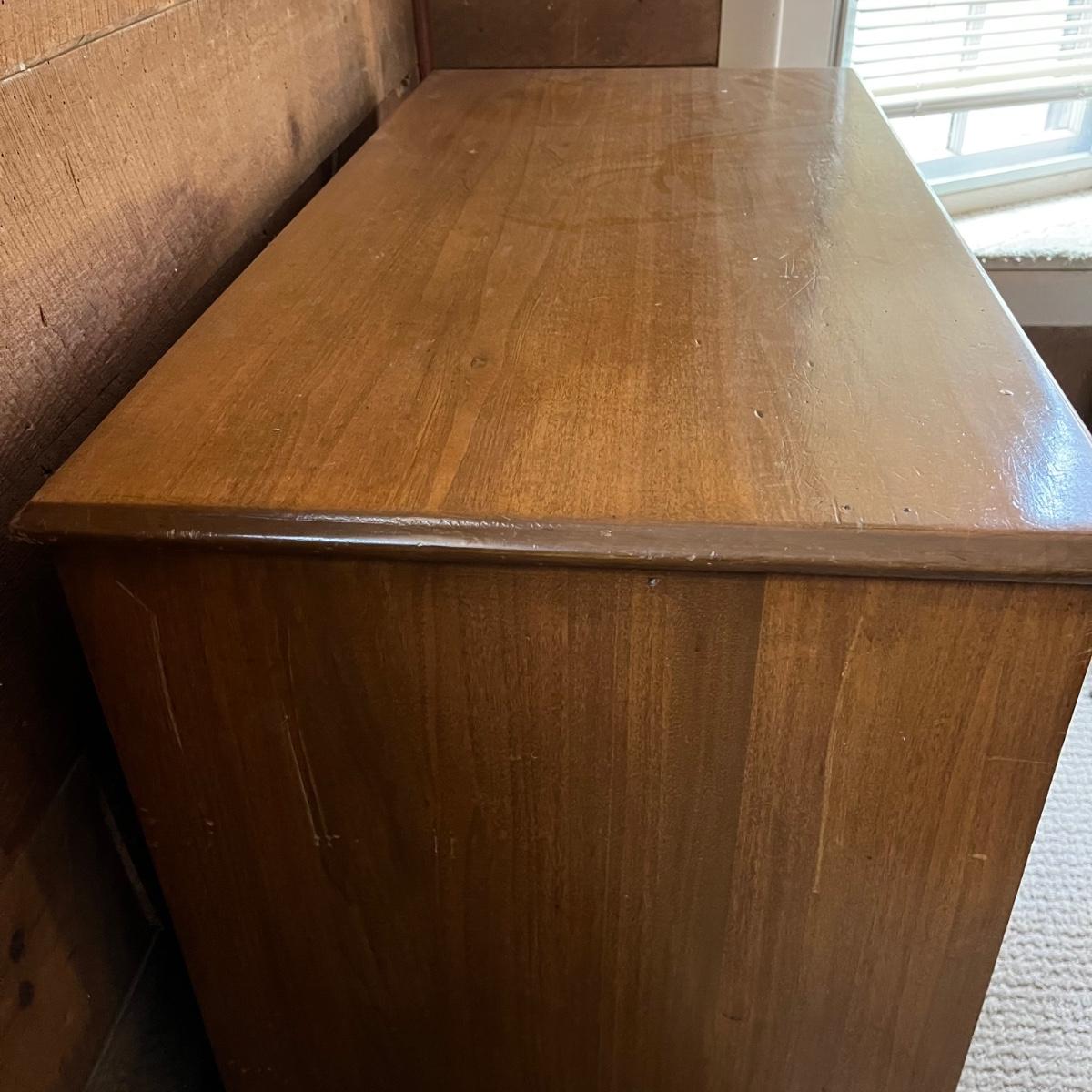 This wooden eight dovetailed drawer desk has some scratches and nicks, see but is otherwise in good condition and structurally sound. Desk measures 20” x 40” x 29.5”.