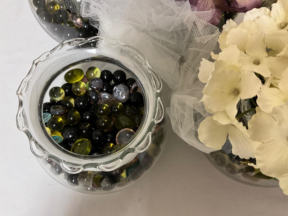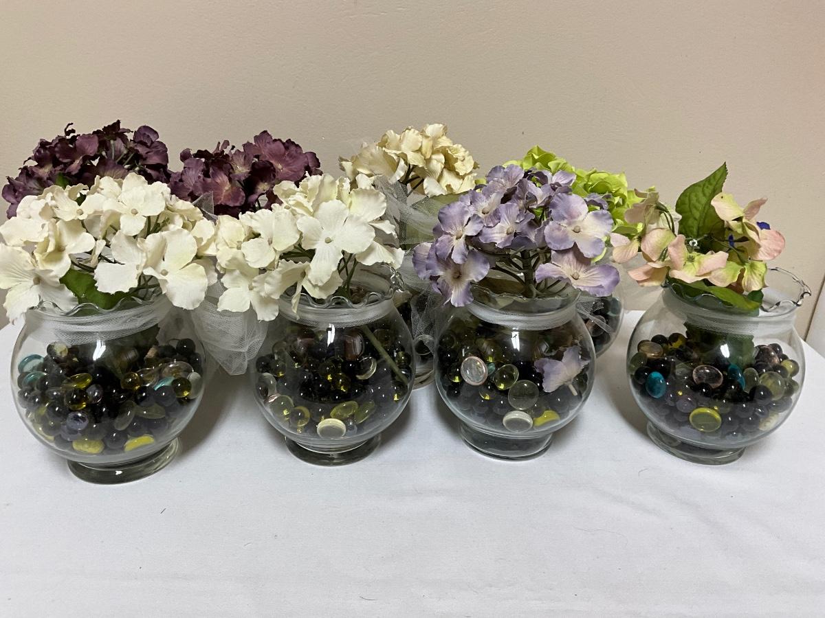 Eight Fish bowl vases filled with glass gem stone/marbles