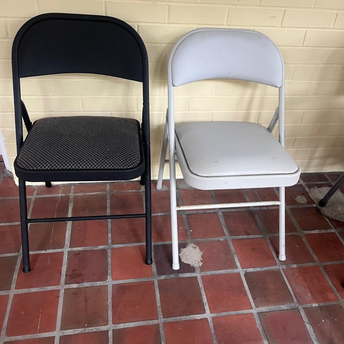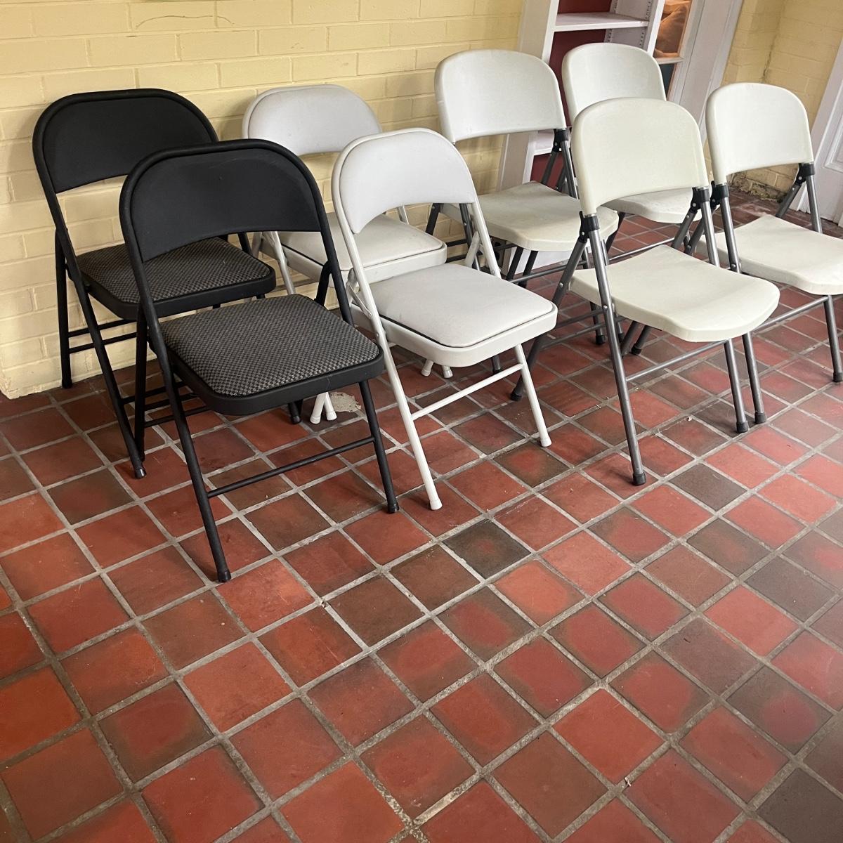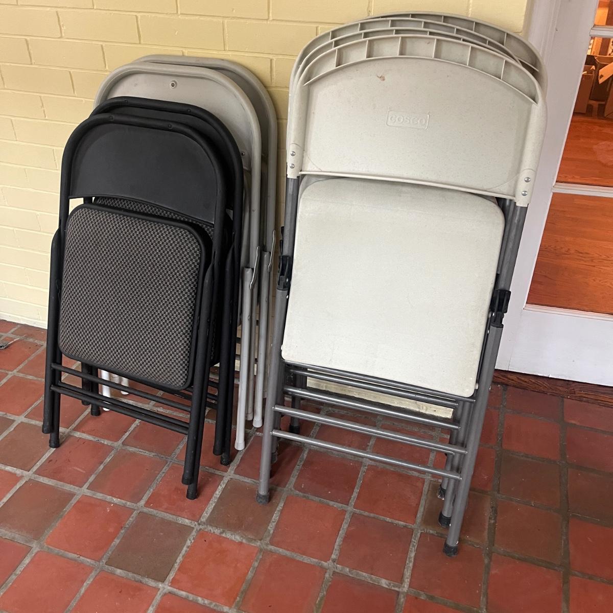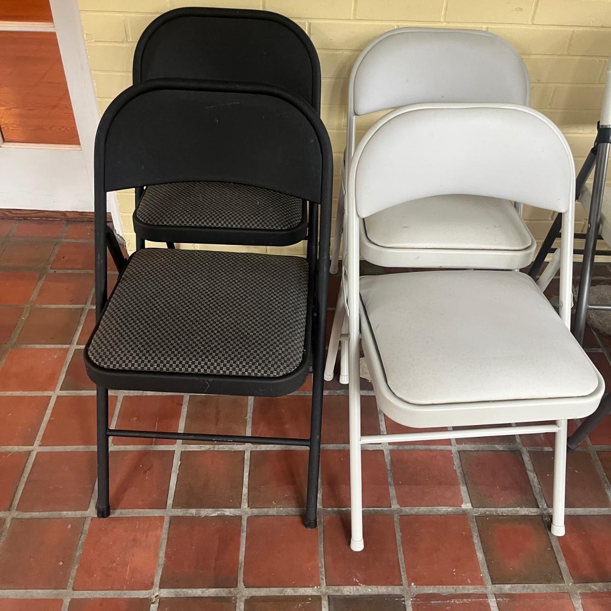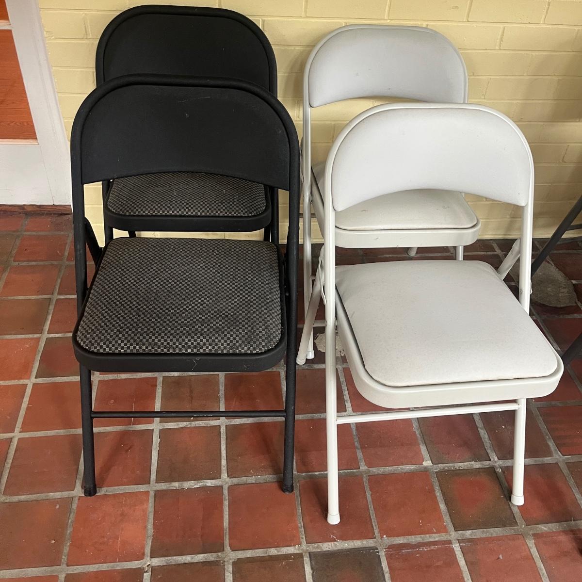 Lot includes four Cosco plastic folding chairs, two padded vinyl seat and back folding chairs, and two padded fabric seat and back folding chairs. A few of the Cosco chairs have spots, see pictures. The spots appear to be removable with some scrubbing. Local Pickup Only