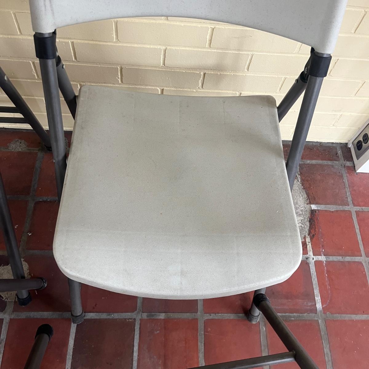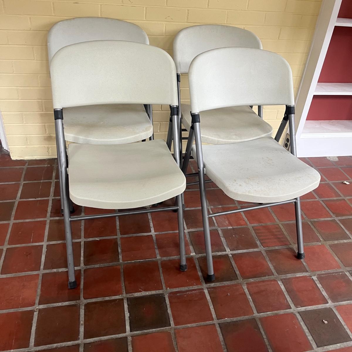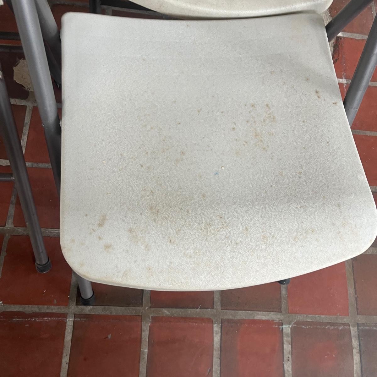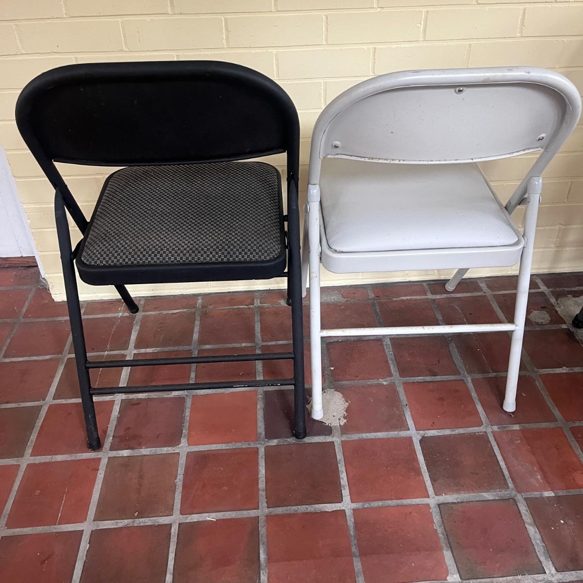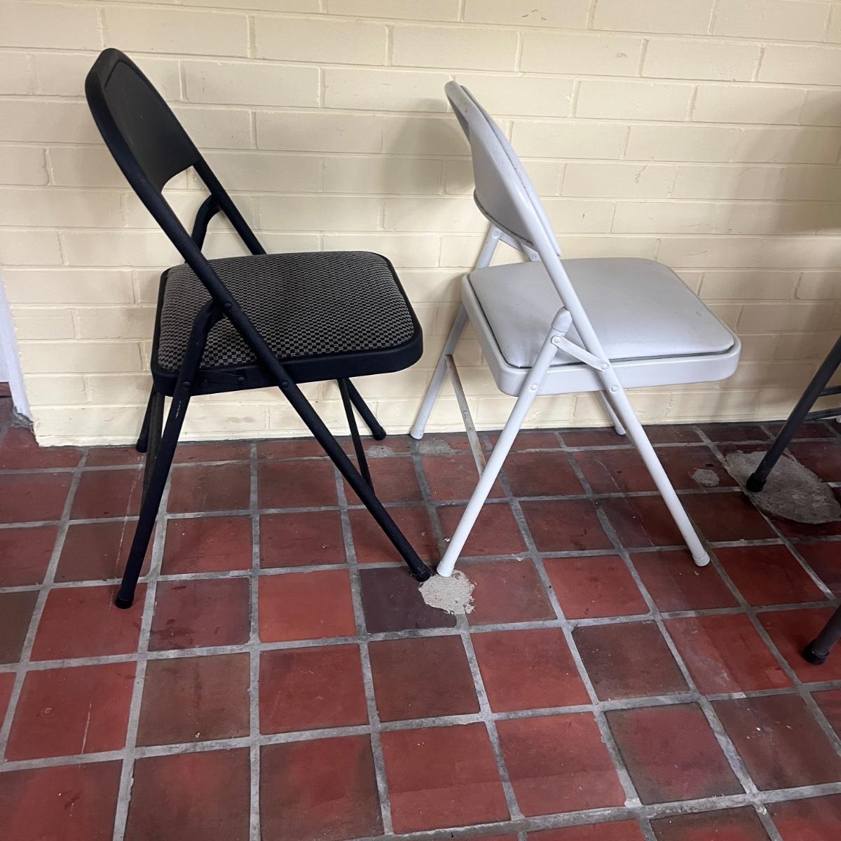 Lot includes four Cosco plastic folding chairs, two padded vinyl seat and back folding chairs, and two padded fabric seat and back folding chairs. A few of the Cosco chairs have spots, see pictures. The spots appear to be removable with some scrubbing. Local Pickup Only