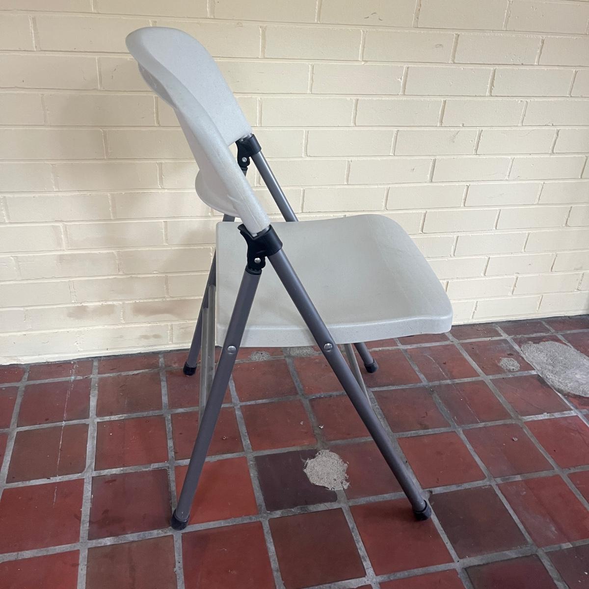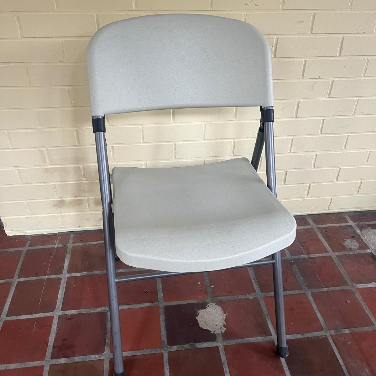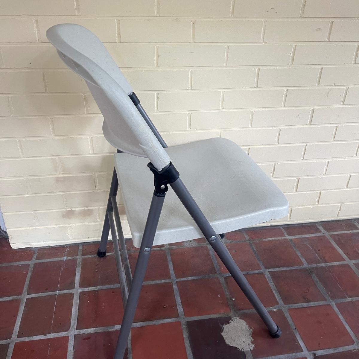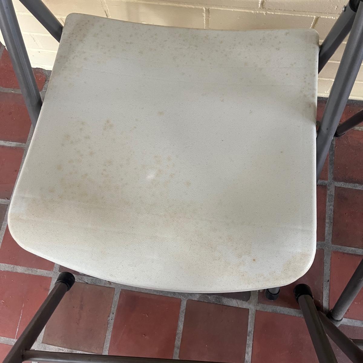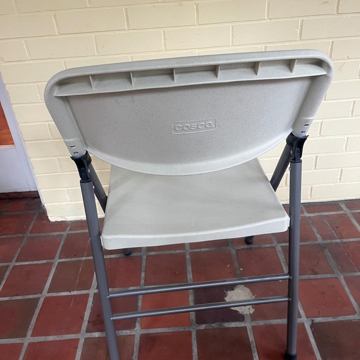 Lot includes four Cosco plastic folding chairs, two padded vinyl seat and back folding chairs, and two padded fabric seat and back folding chairs. A few of the Cosco chairs have spots, see pictures. The spots appear to be removable with some scrubbing. Local Pickup Only