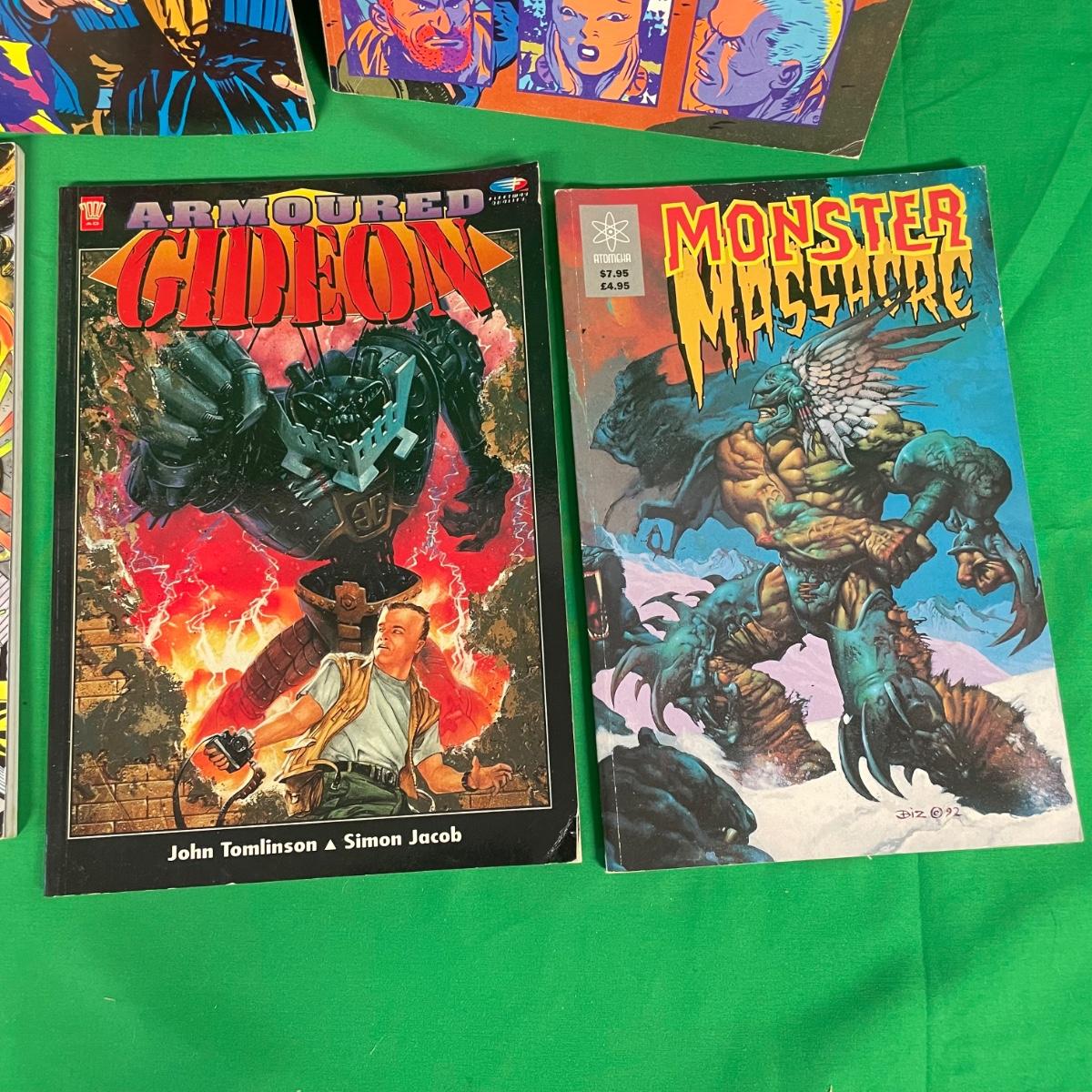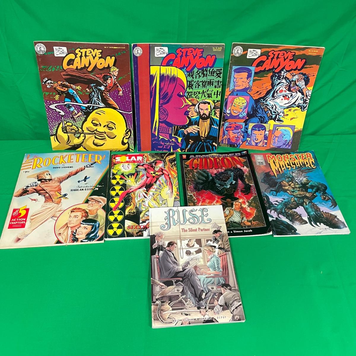 A variety of graphic novels spanning genres and publishers. Three issues of Steve Canyon, Ruse The Silent Partner, Solar Man of the Atom, The Rocketeer, Armoured Gideon, and Monster Massacre. See images. Items are sold as-is. No returns or refunds. Please bid accordingly.