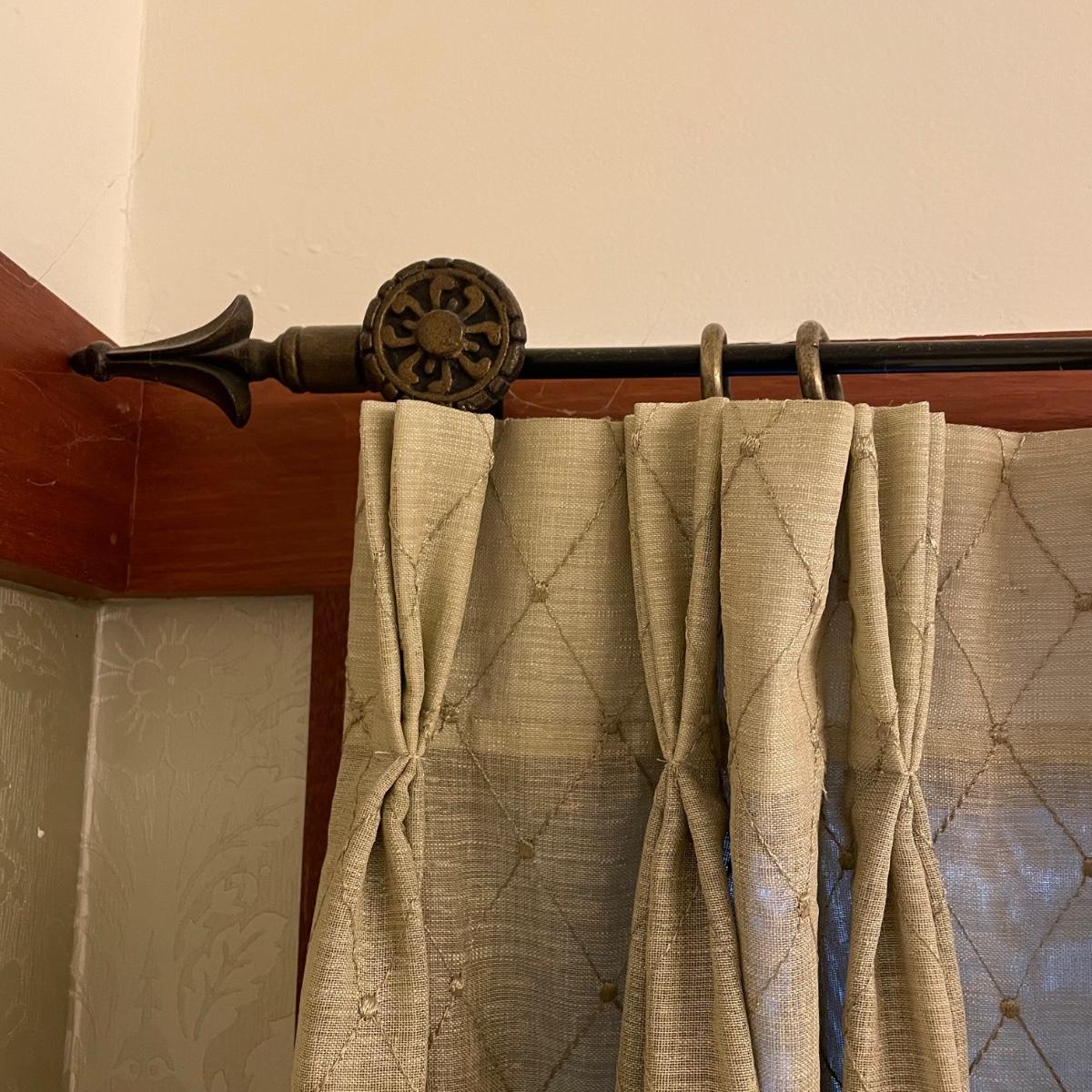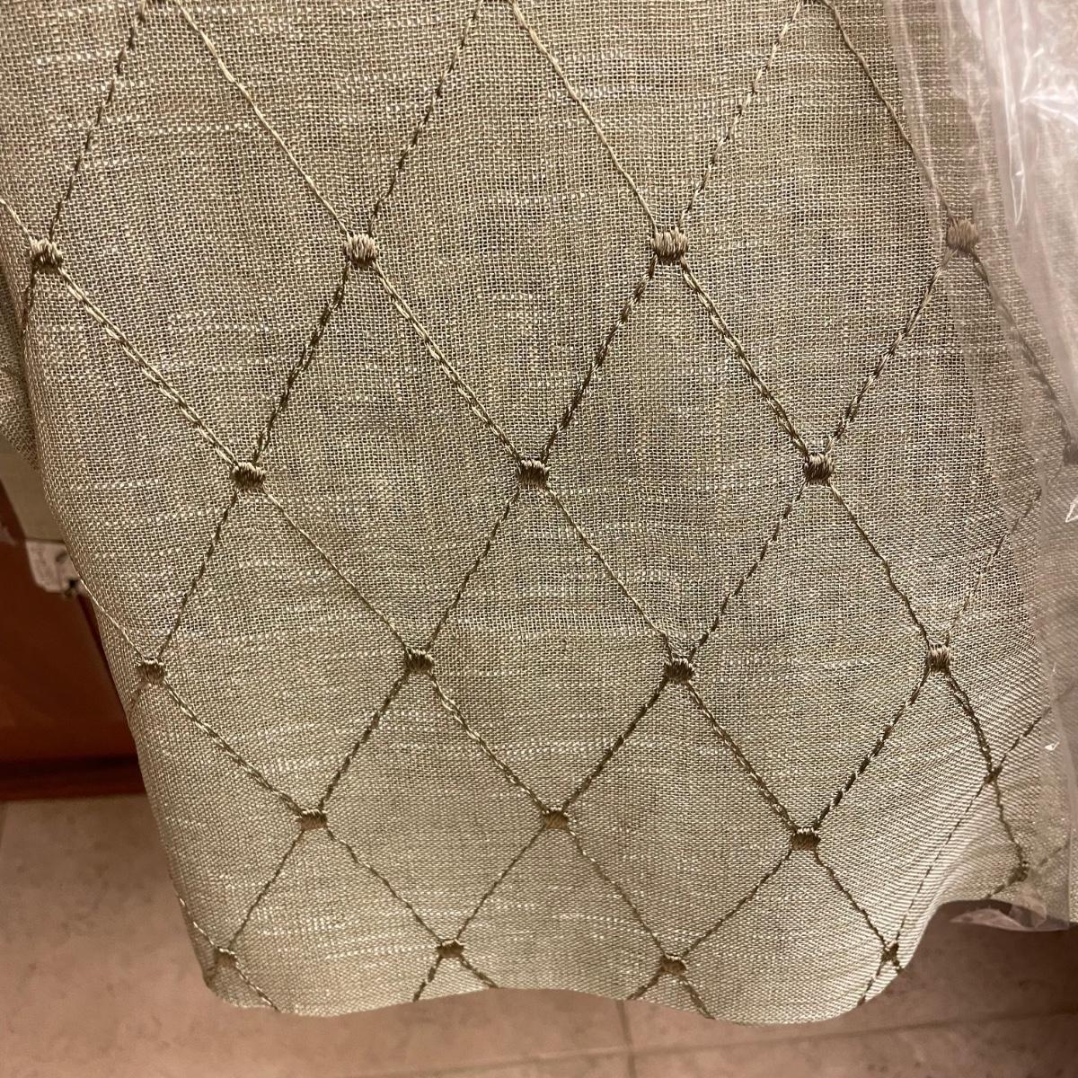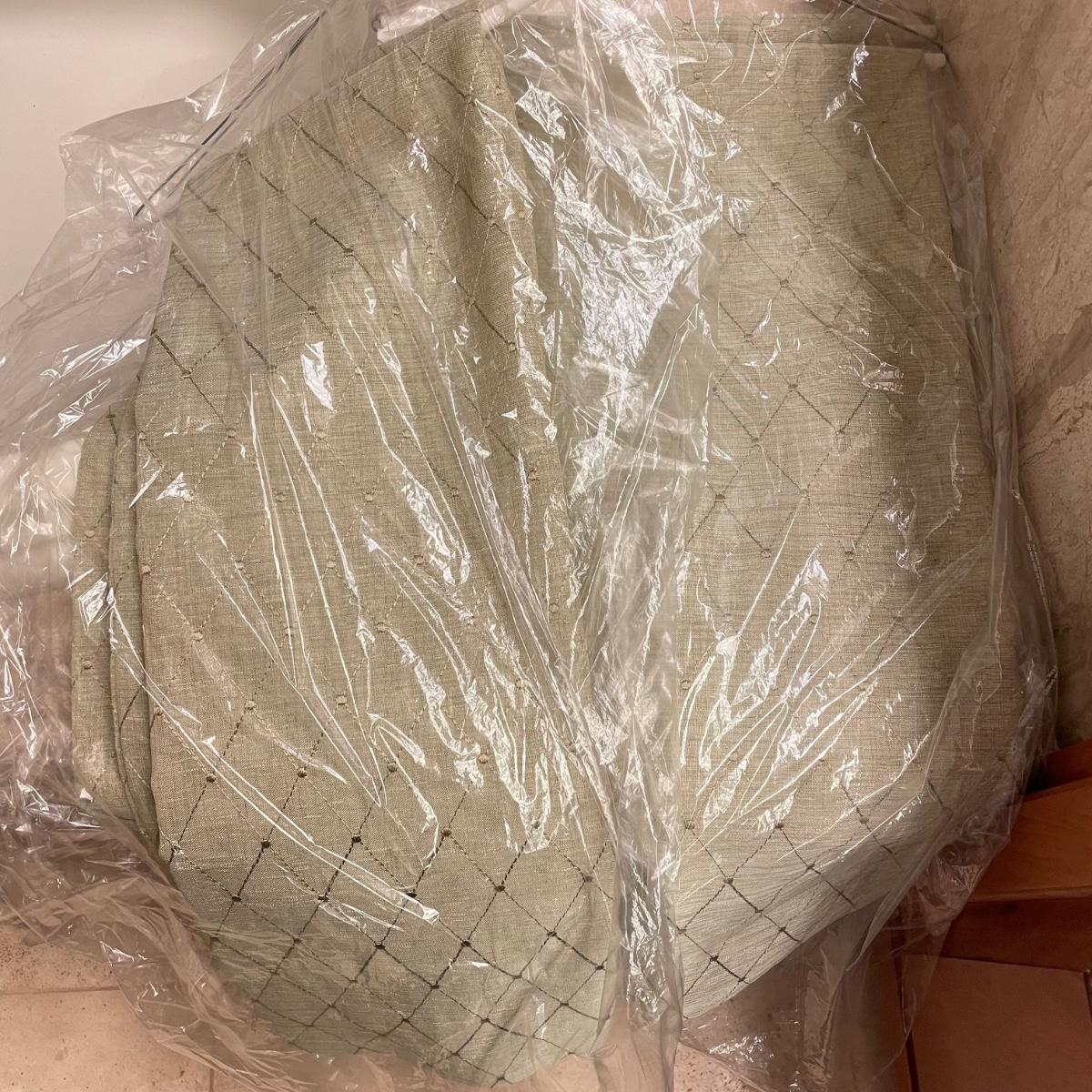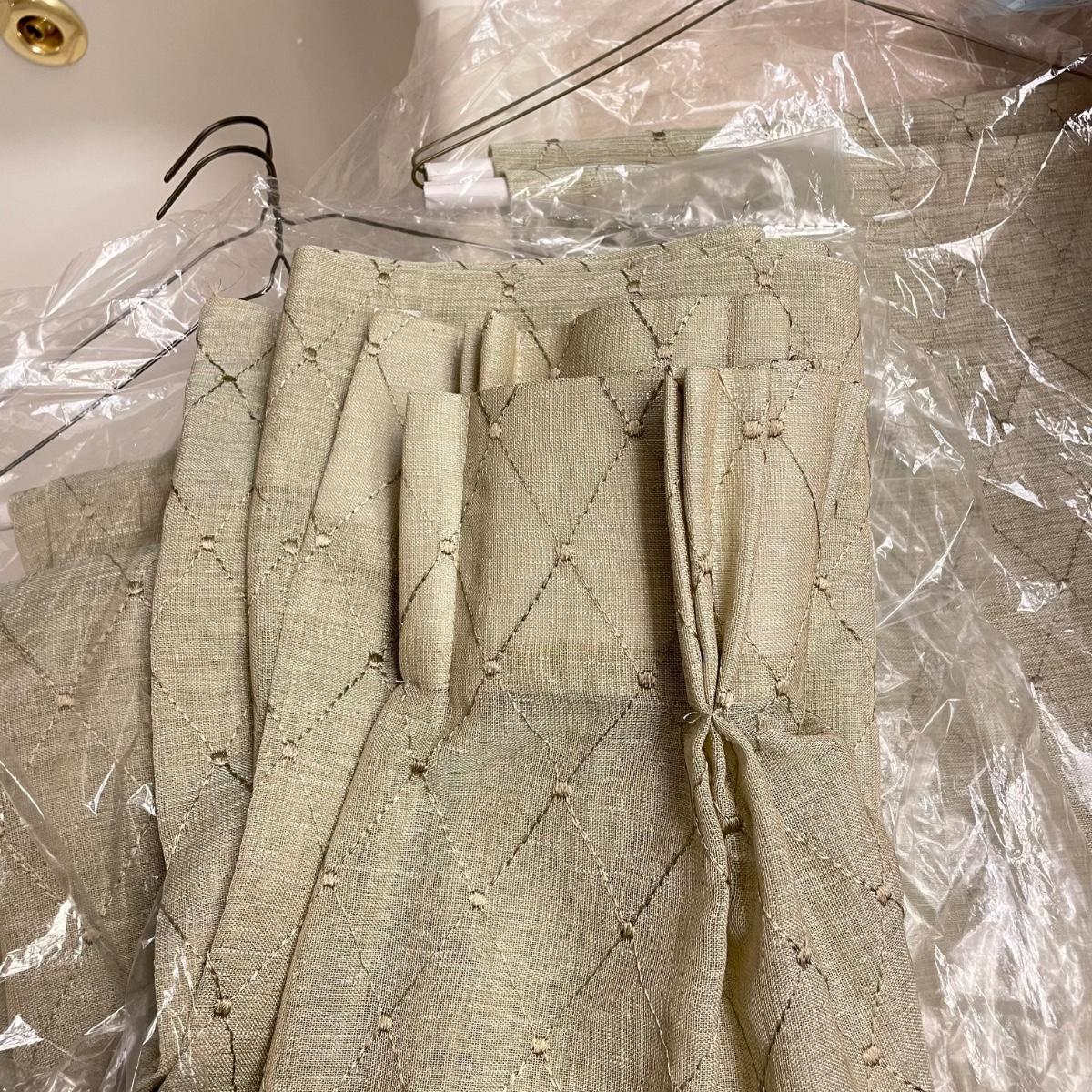 Eight matching olive colored panels. The two largest panels are above the garden tub, they measure approximately 102” x 62”H each. These two also have two sheer panels that appear to be sewn in. The two panels displayed over the smaller window measure approximately 50” x 56”H, these are single layer without the sheer panels. Lastly, four bagged panels on hangers measure approximately 72” x 60”H. Lot includes three rods, all hooks and hangers shown in photos. Hardware appears to be metal. Winning buyer is responsible for removing hardware with a Phillips head screwdriver. Please bring a ladder to remove, curtains are hung over 8ft high. Local pick up only.