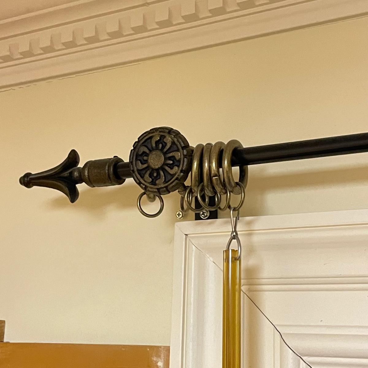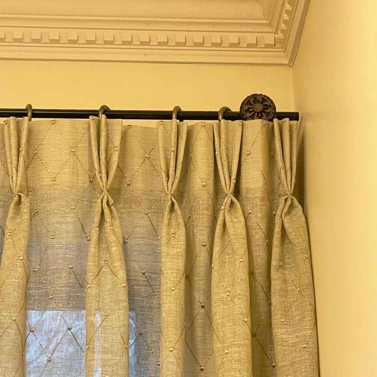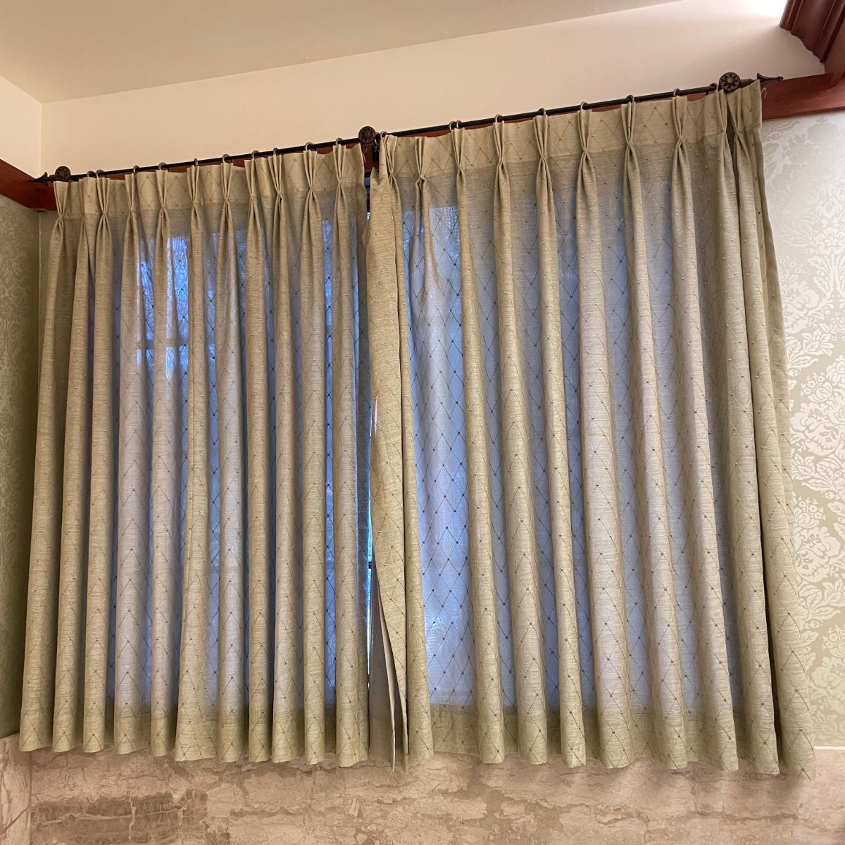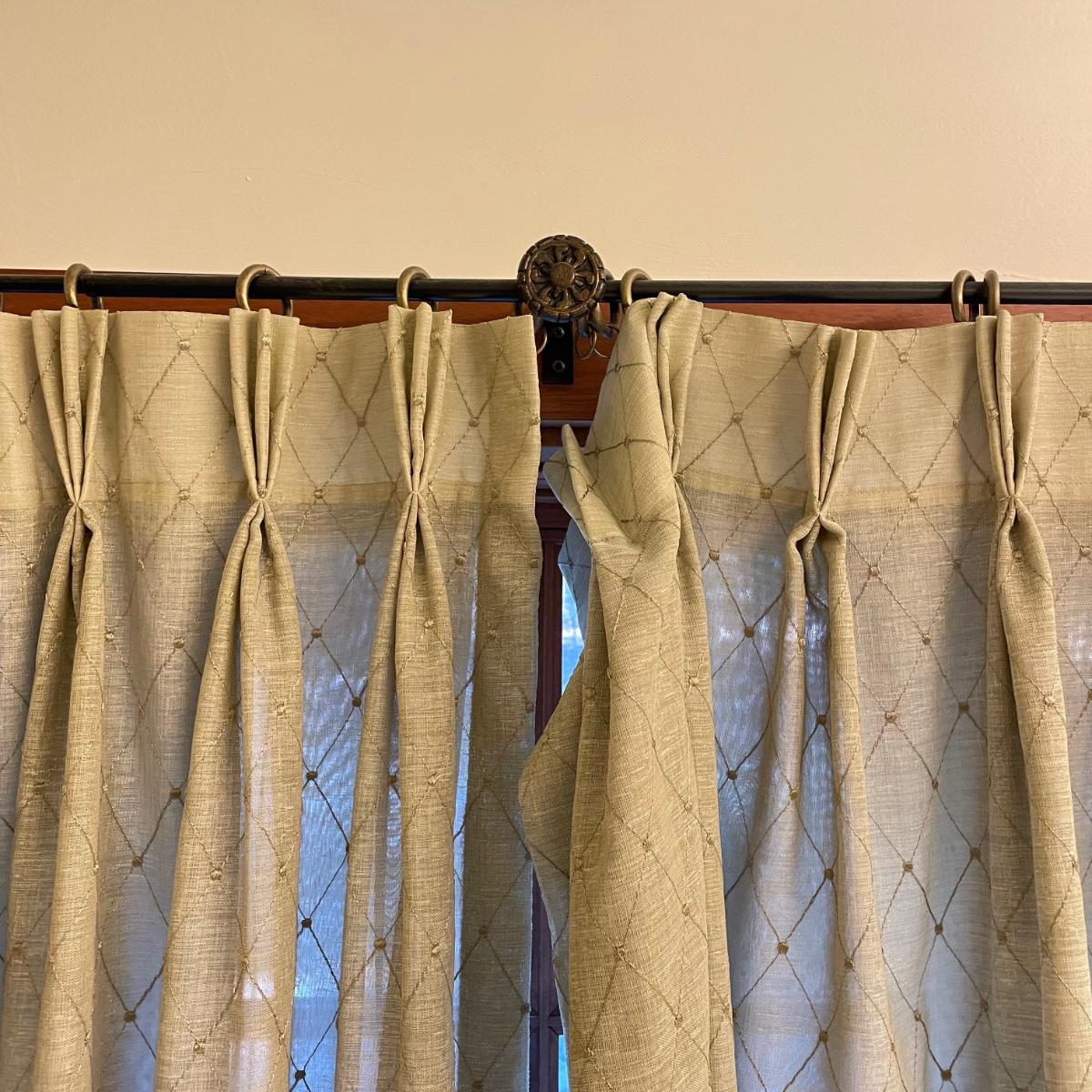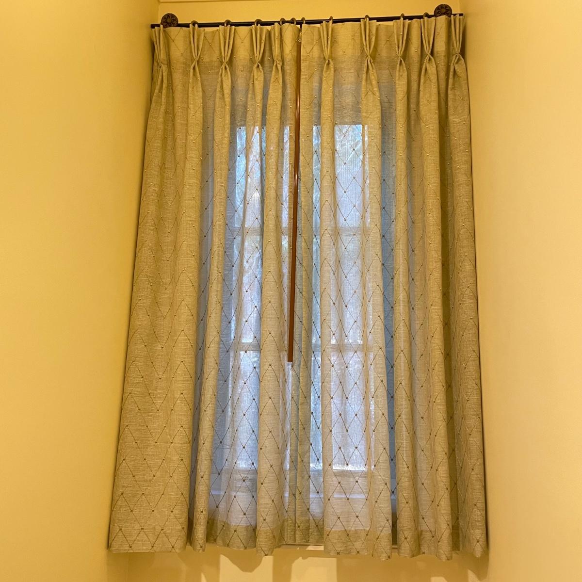 Eight matching olive colored panels. The two largest panels are above the garden tub, they measure approximately 102” x 62”H each. These two also have two sheer panels that appear to be sewn in. The two panels displayed over the smaller window measure approximately 50” x 56”H, these are single layer without the sheer panels. Lastly, four bagged panels on hangers measure approximately 72” x 60”H. Lot includes three rods, all hooks and hangers shown in photos. Hardware appears to be metal. Winning buyer is responsible for removing hardware with a Phillips head screwdriver. Please bring a ladder to remove, curtains are hung over 8ft high. Local pick up only.