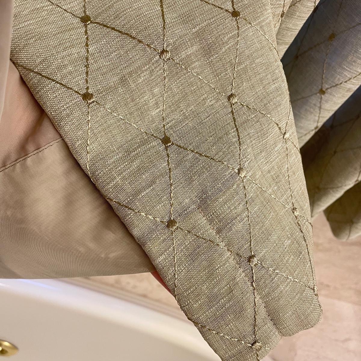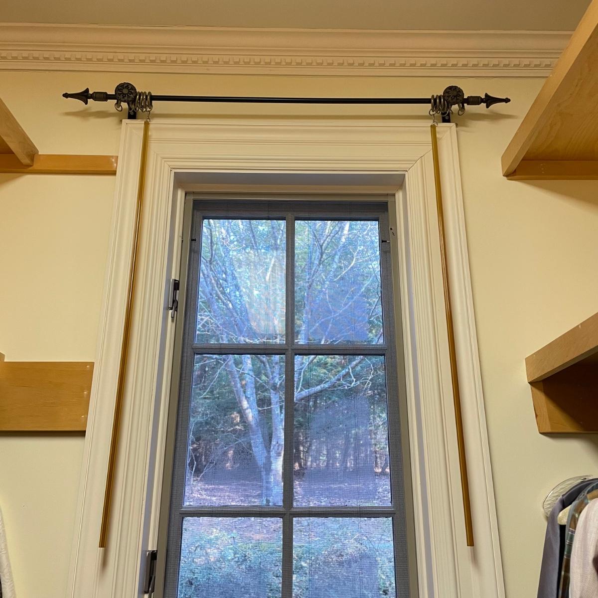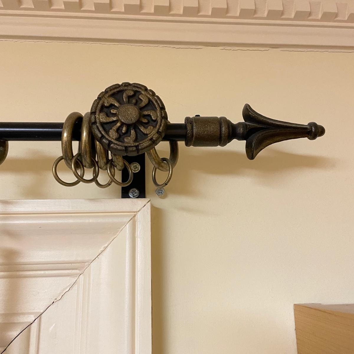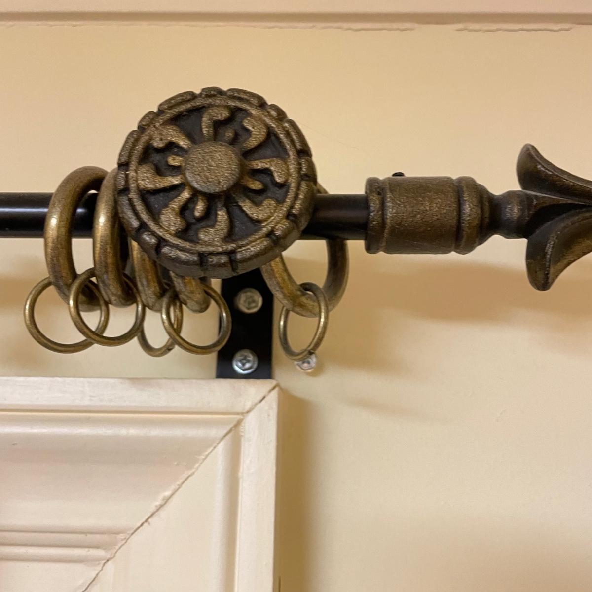 Eight matching olive colored panels. The two largest panels are above the garden tub, they measure approximately 102” x 62”H each. These two also have two sheer panels that appear to be sewn in. The two panels displayed over the smaller window measure approximately 50” x 56”H, these are single layer without the sheer panels. Lastly, four bagged panels on hangers measure approximately 72” x 60”H. Lot includes three rods, all hooks and hangers shown in photos. Hardware appears to be metal. Winning buyer is responsible for removing hardware with a Phillips head screwdriver. Please bring a ladder to remove, curtains are hung over 8ft high. Local pick up only.