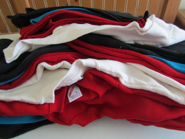 Eight New, Large Jerzees Brand Sweat Shirts- 3 Black, 1 Blue, 3 Red, 1 White