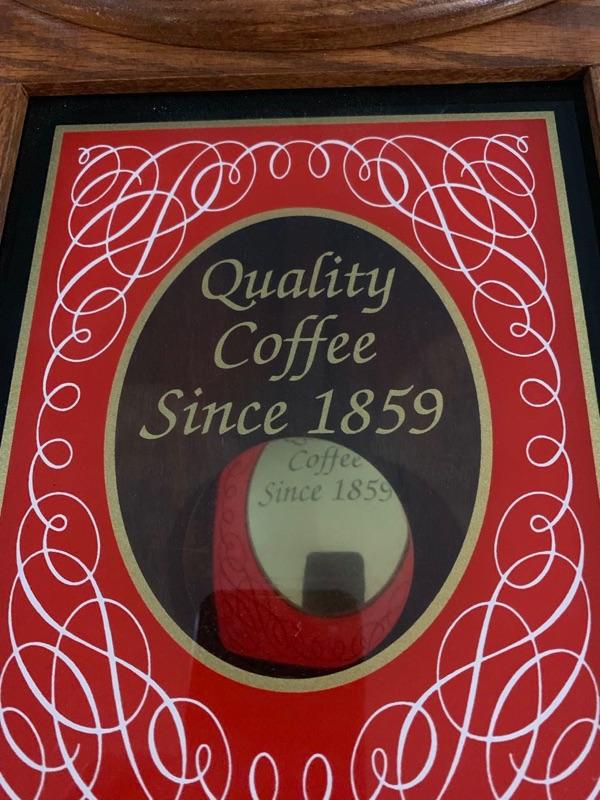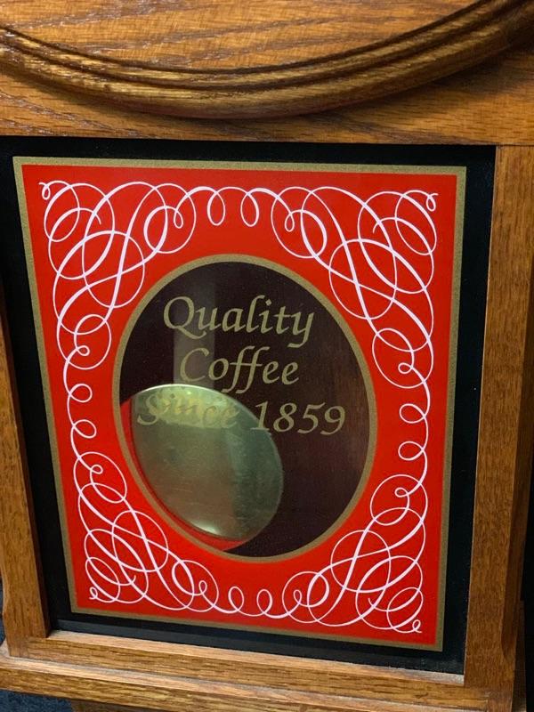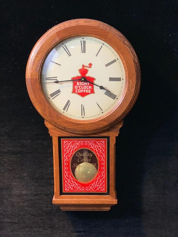 This is a beautiful Oak wood advertising Wall Clock, it is rare and in excellent working condition. On the front it says EIGHT O'CLOCK COFFEE on the perfect face, and Quality Coffee Since 1859 on the bottom glass. This quartz clock is all original and I have not seen another one around. It measures 27" tall x 15" wide x 4" deep, and weighs about 7 LBS. The condition is so good I can not find a bad thing, the wood finish is perfect, the face is bright & clean, the glass door is so nice it looks like new. This amazing clock is from the 1990s, It runs great, and if you like coffee you will love this old clock.