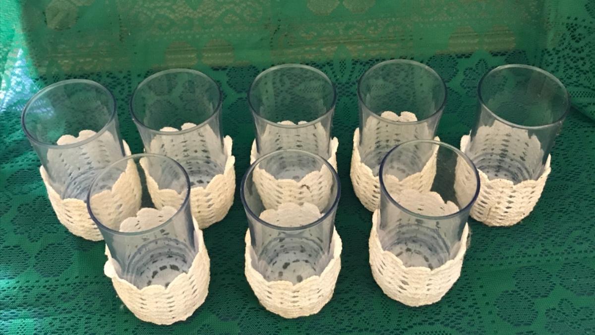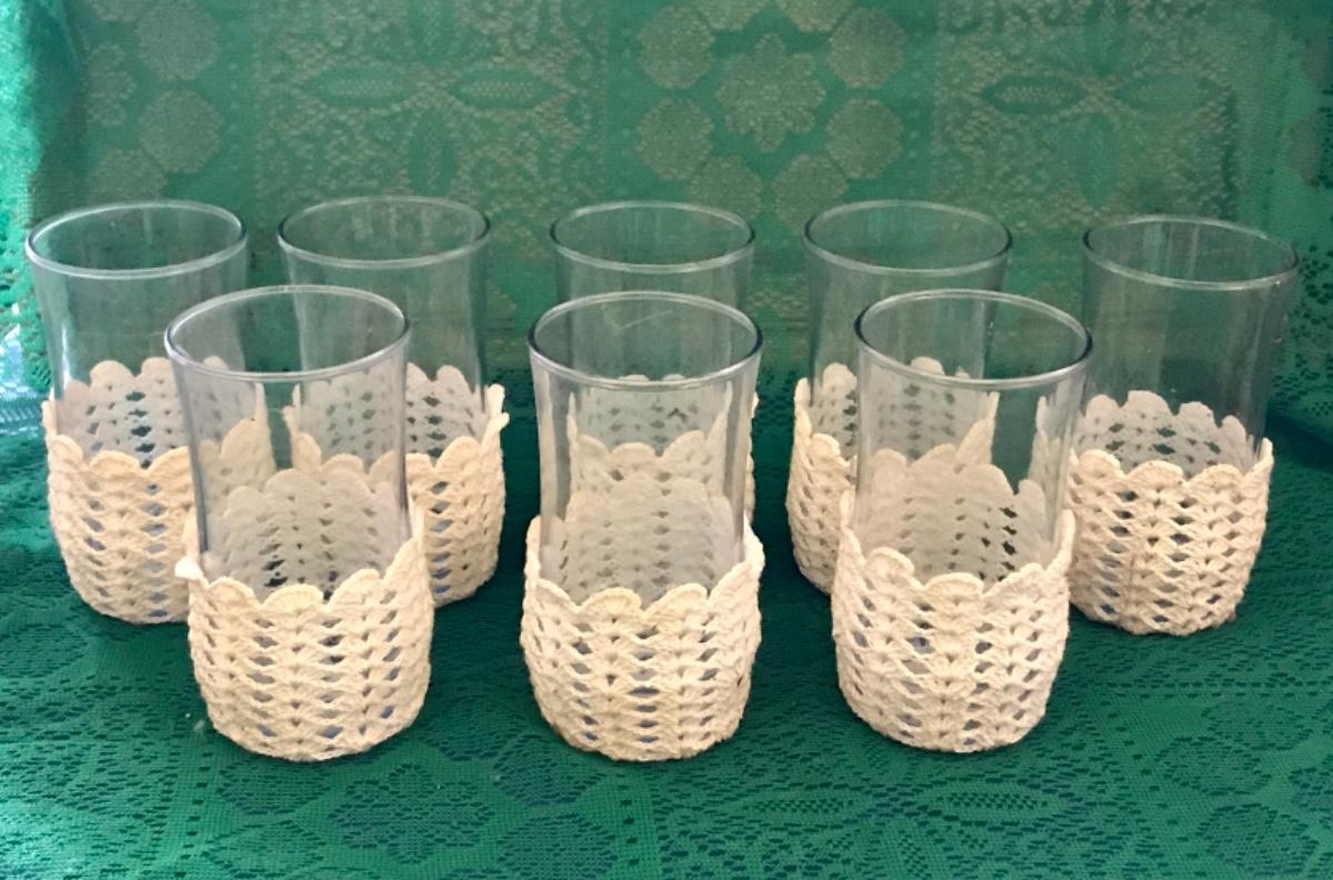 Eight piece beverage glass set with homemade crocheted cozies. In good condition, but need cleaning.