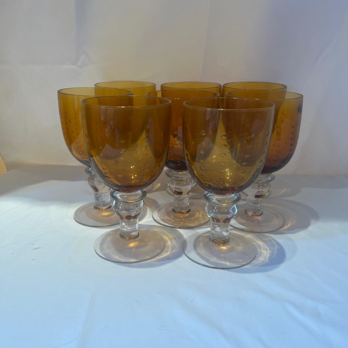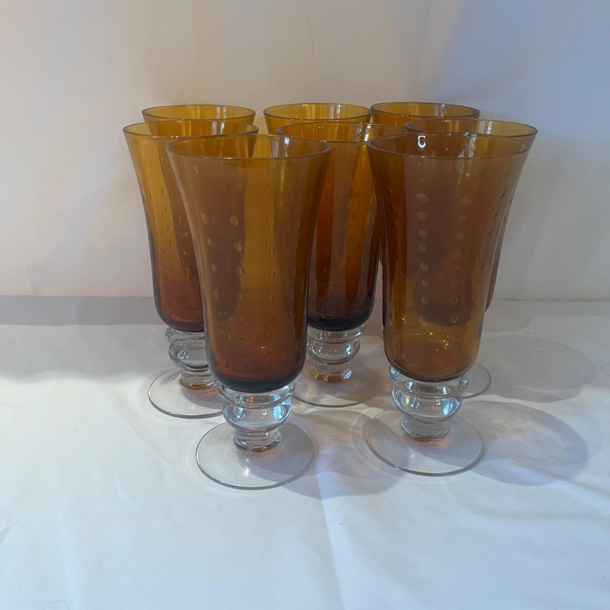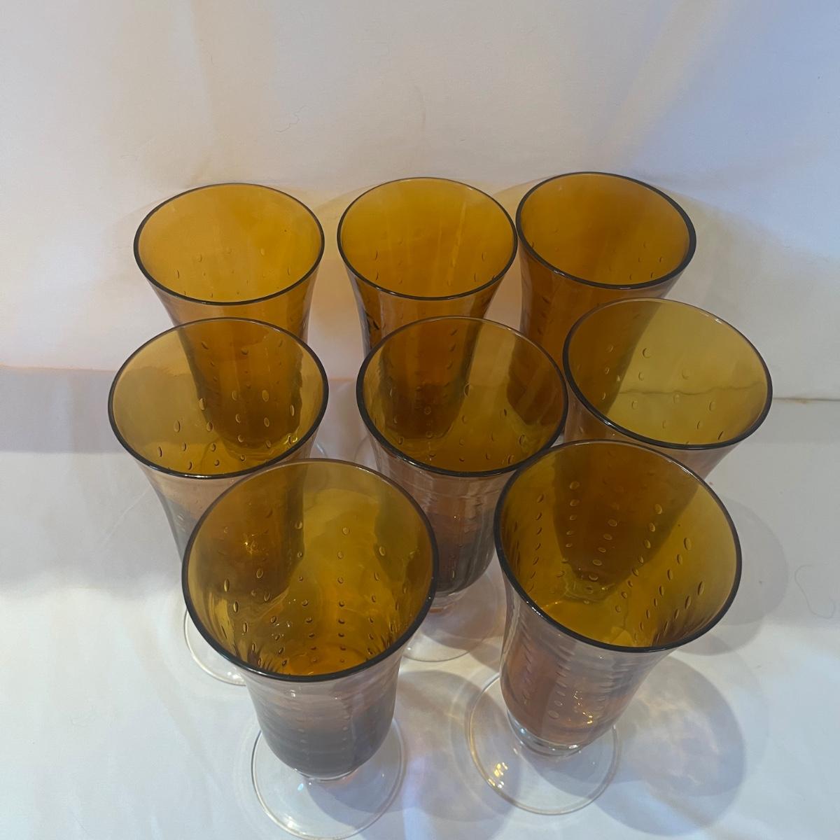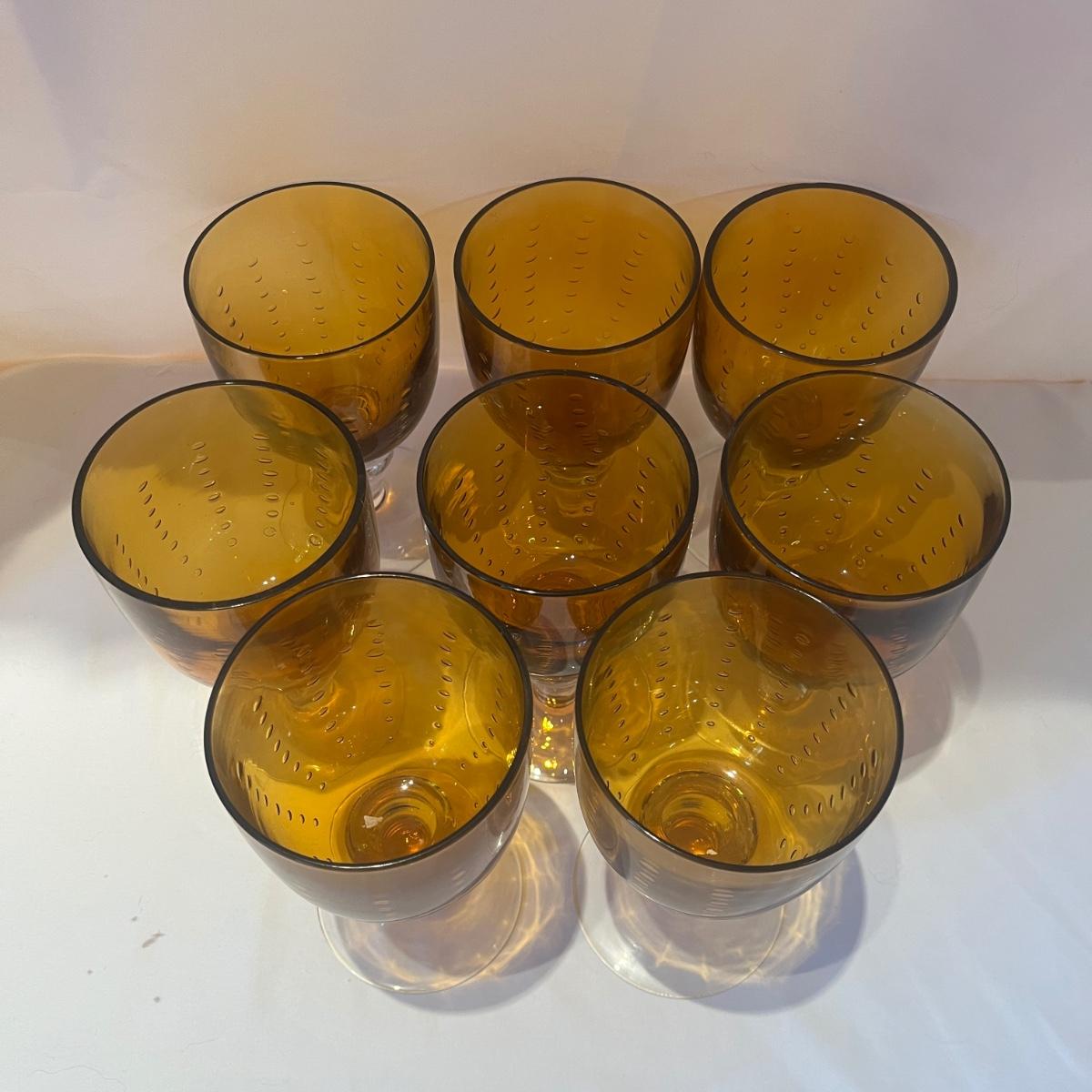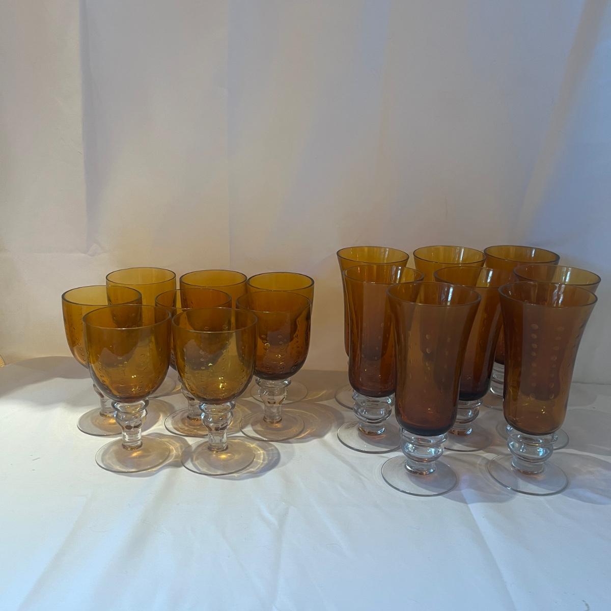 Lot includes two sets of eight bubbled amber and clear glasses. Tallest glasses measure 3.5”D x 8”H. Glasses are unmarked but have the appearance of Zrike Pavilion amber tea glasses and water goblets.