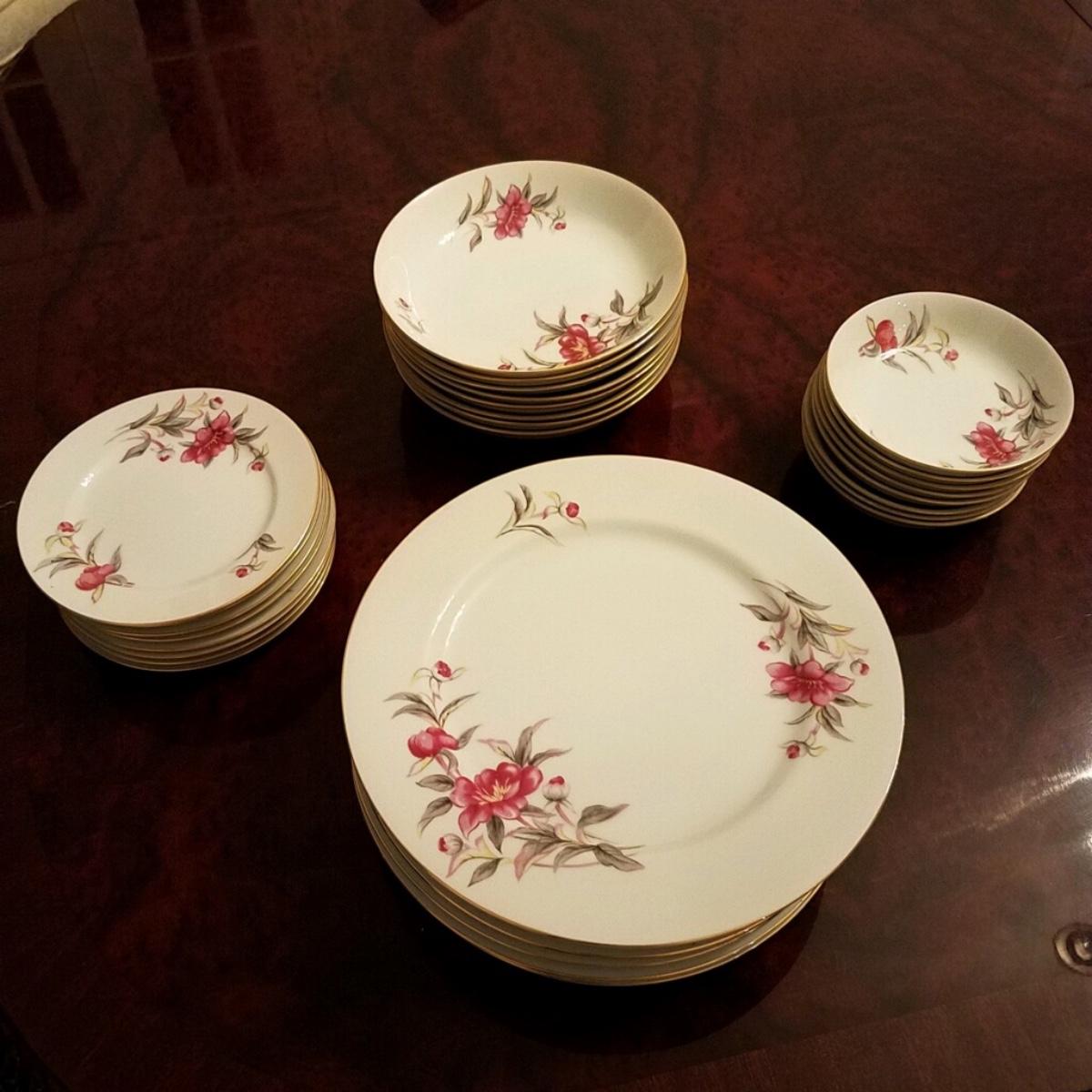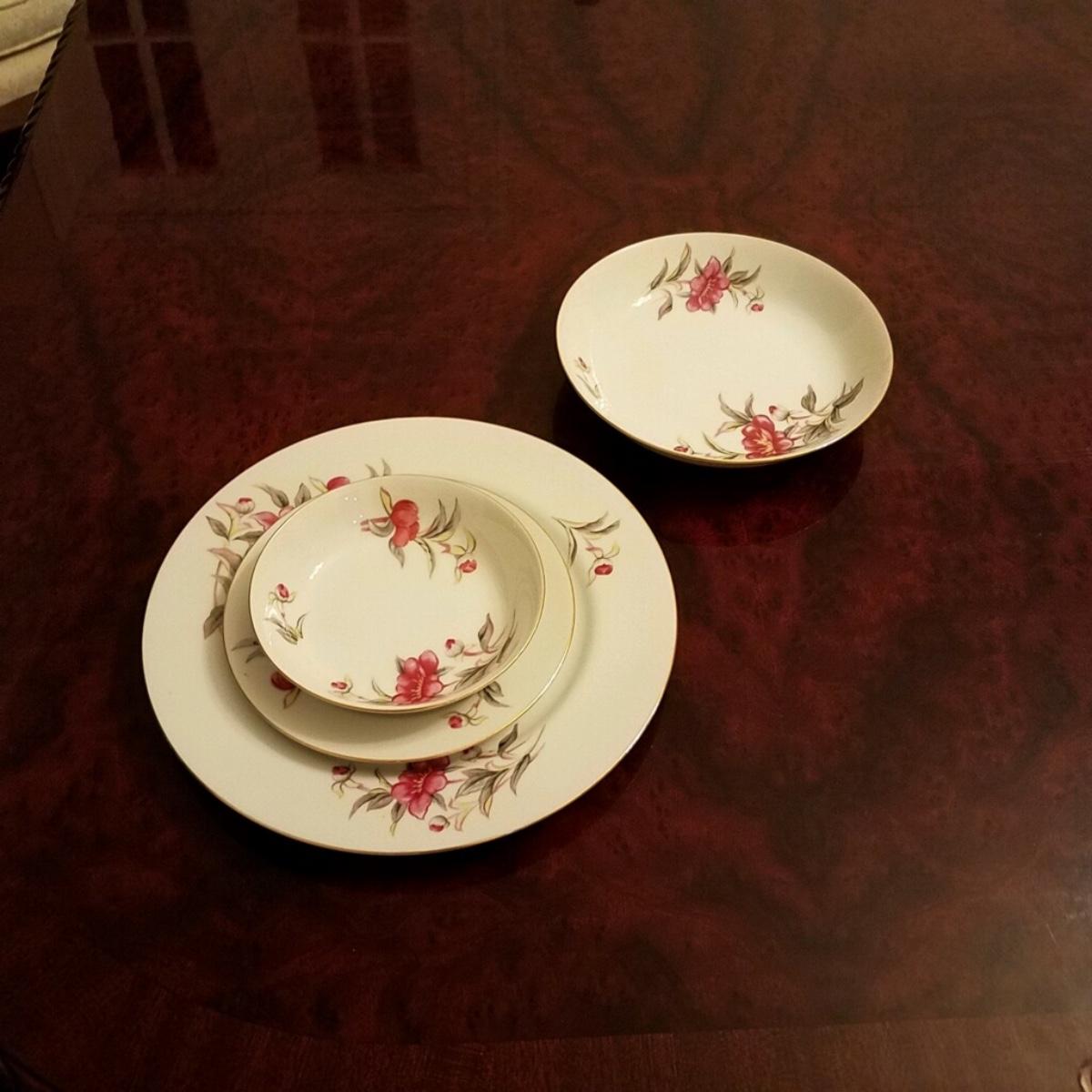 Eight place settings of vintage Ucagco china. Includes plates, bread plates, dessert and soup bowls. 32-piece set. One dessert bowl has a chip. Otherwise very good vintage condition