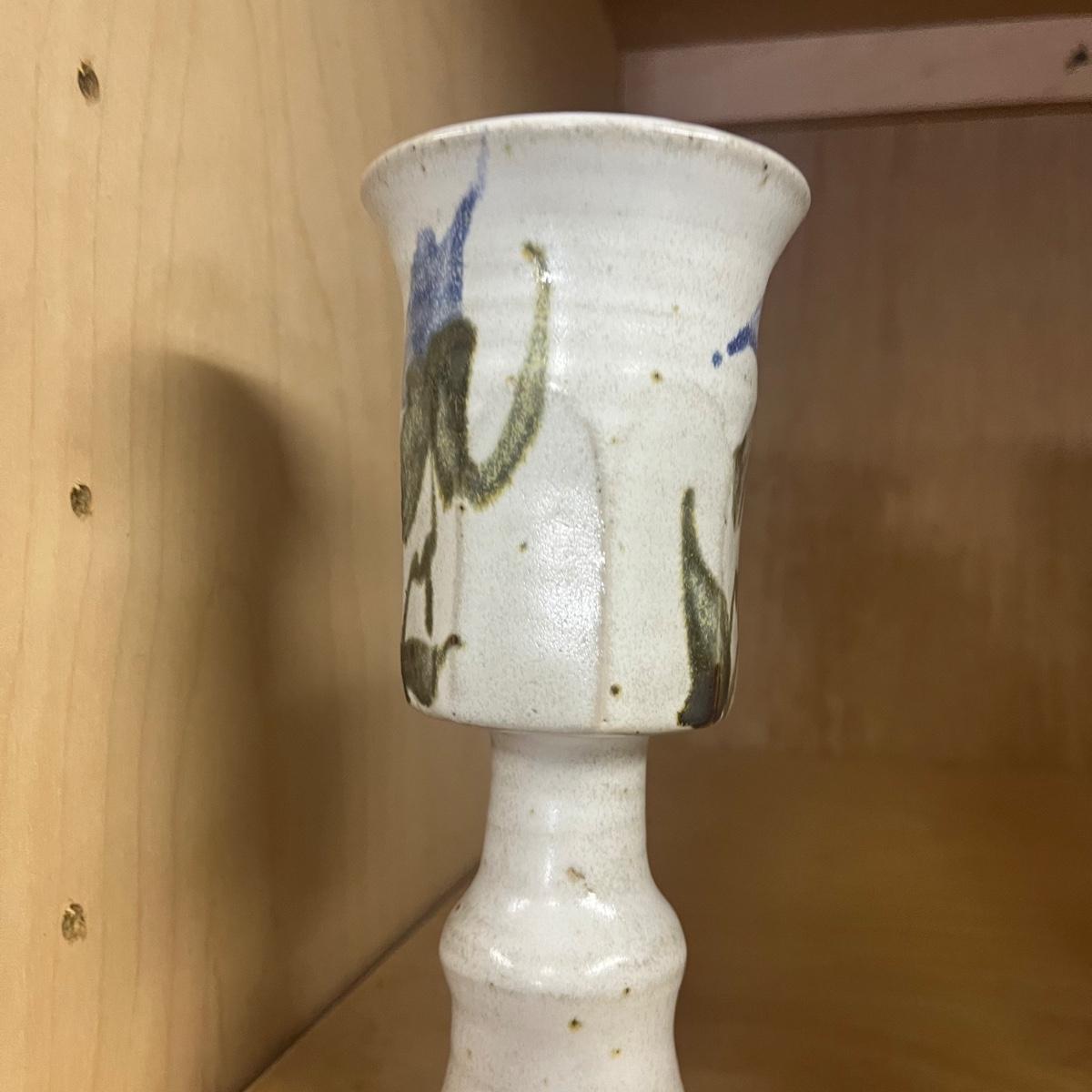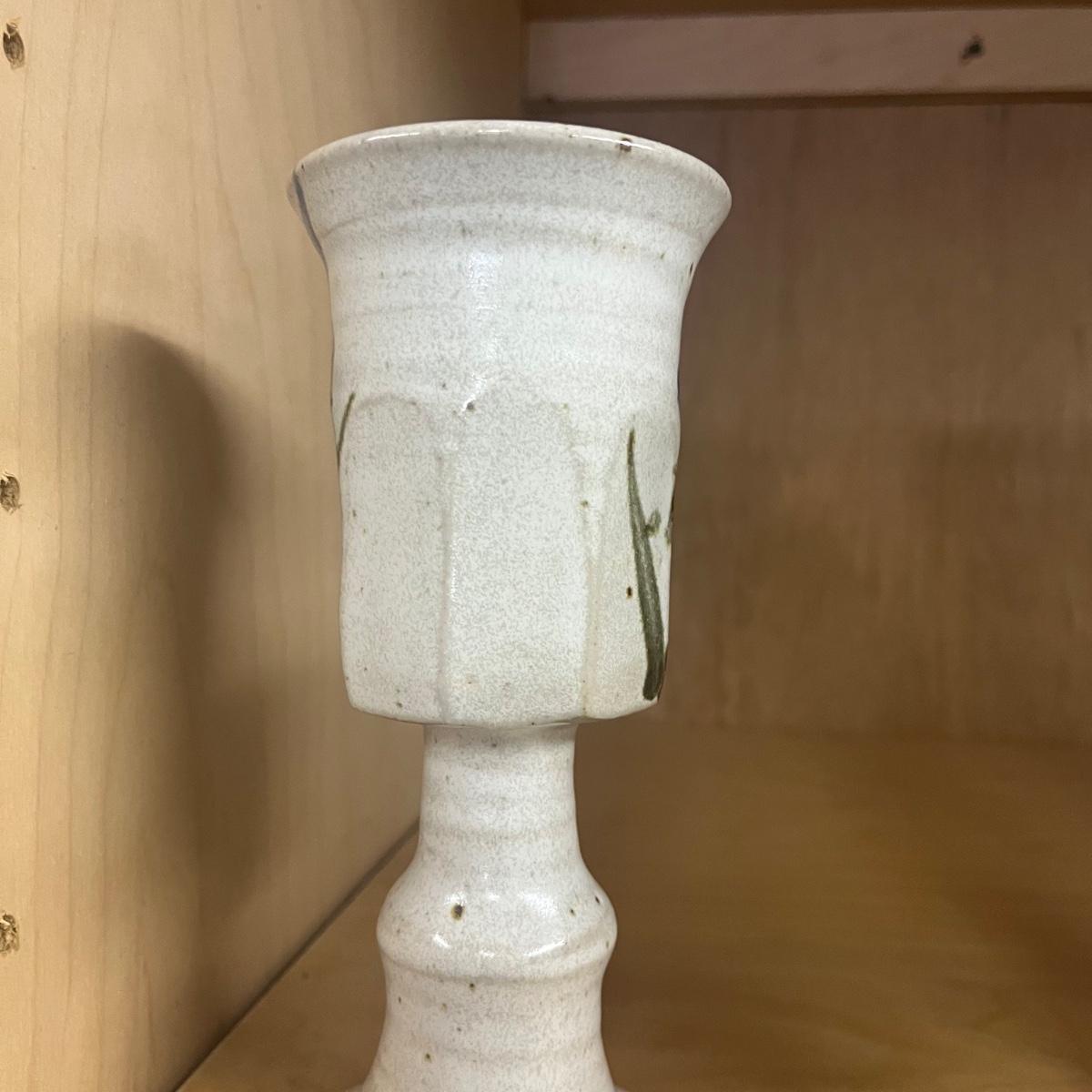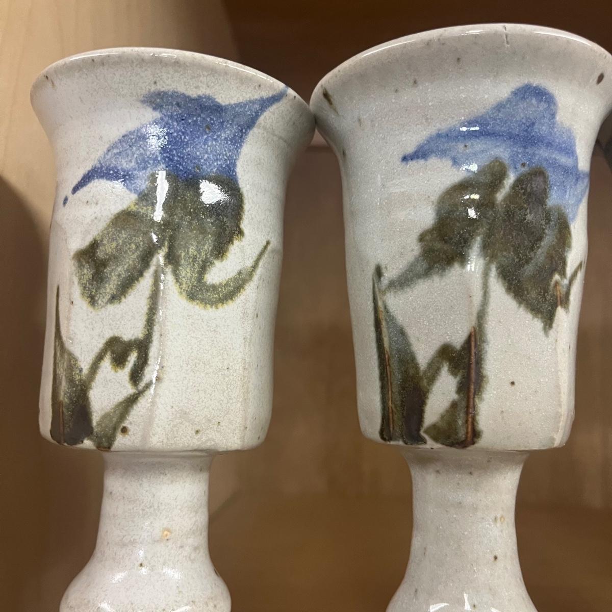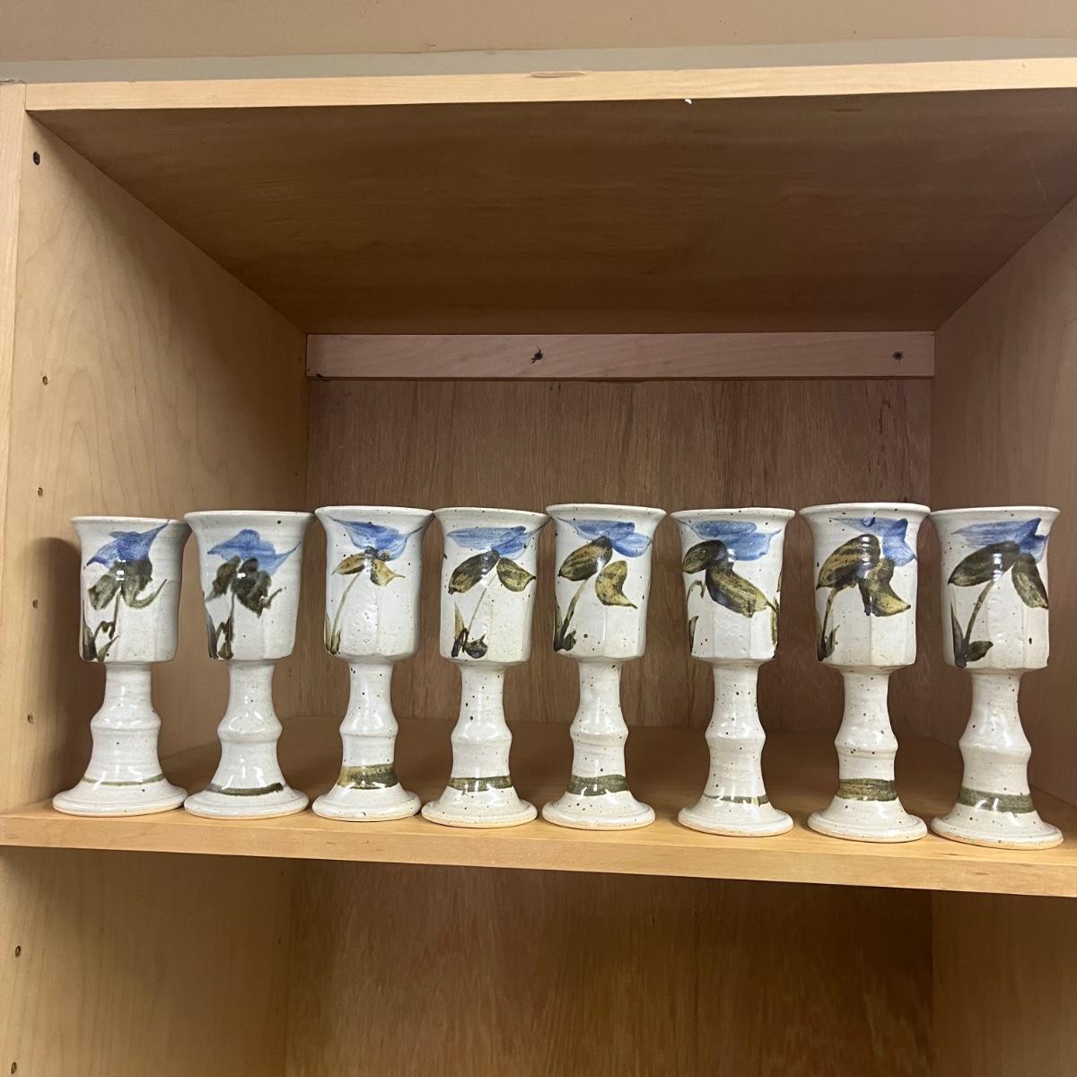 Lot includes eight handmade pottery goblets. Tallest goblet measures 3.25” x 8.25”. Being handmade, they are all just a little different in size.