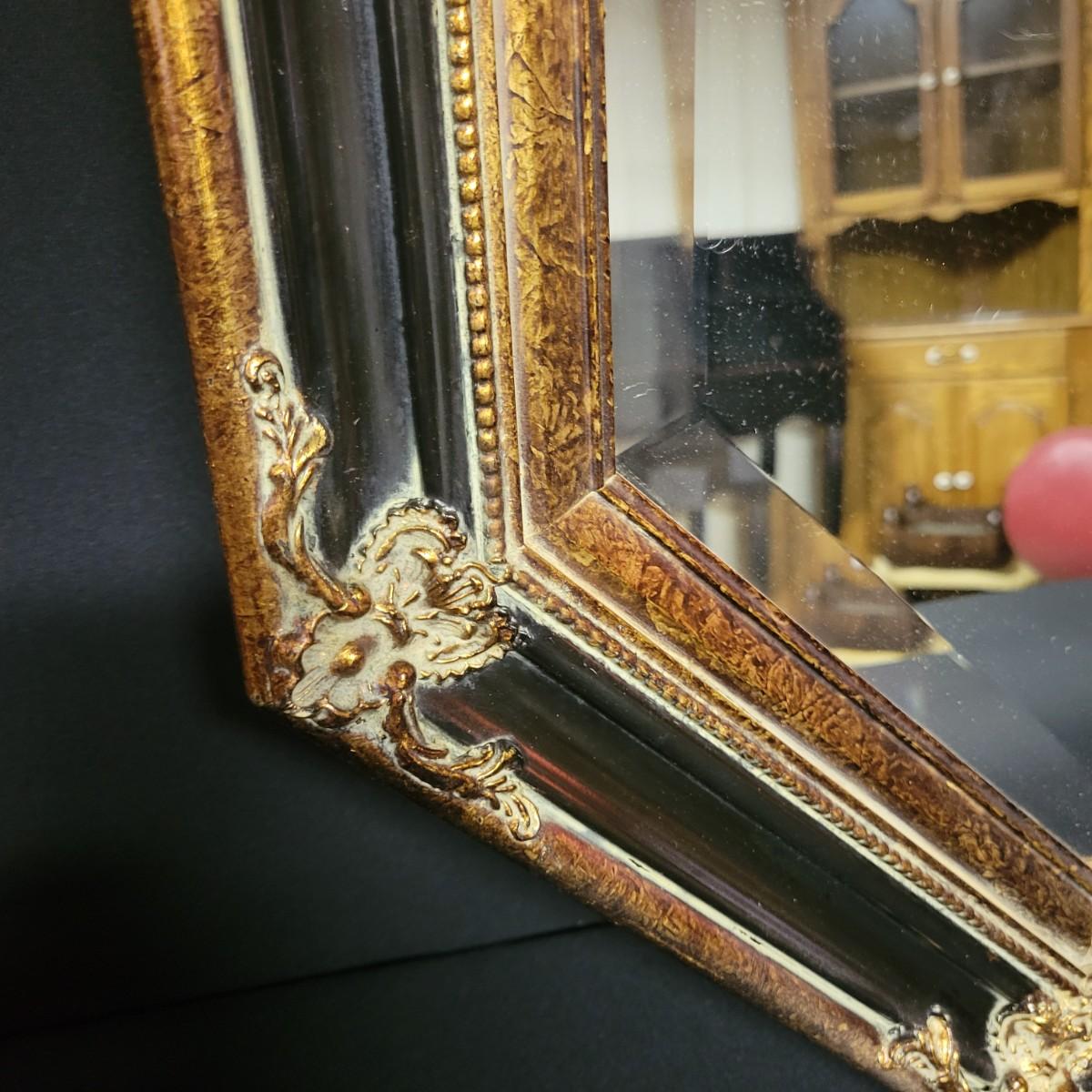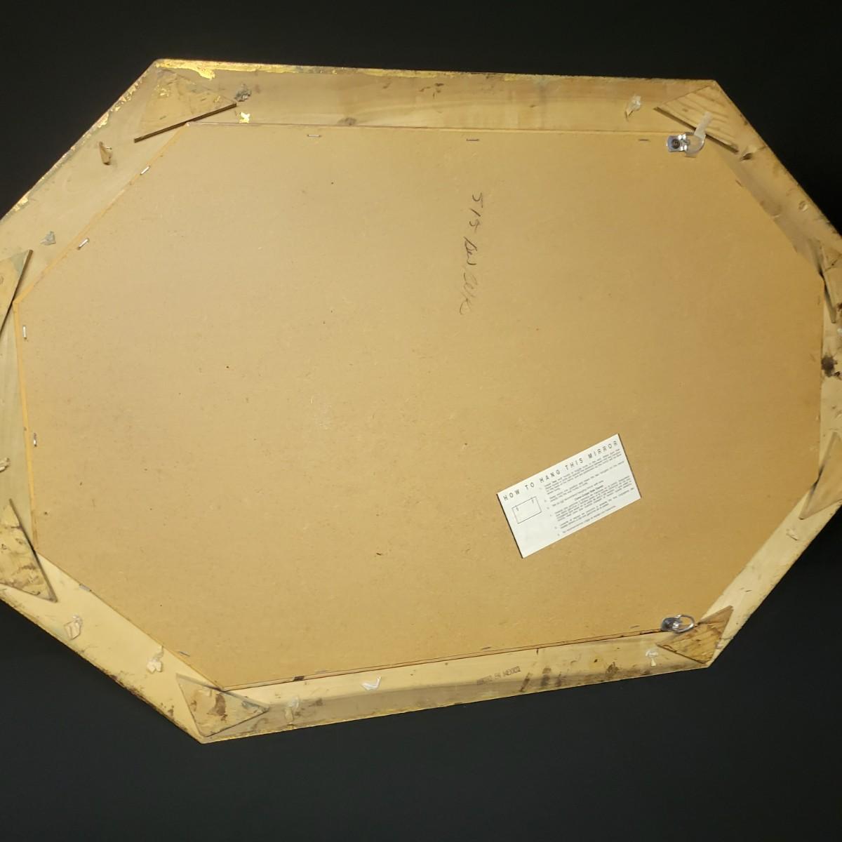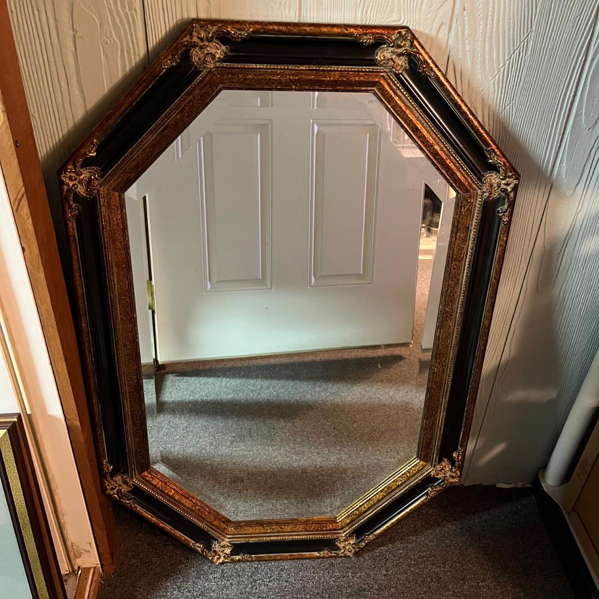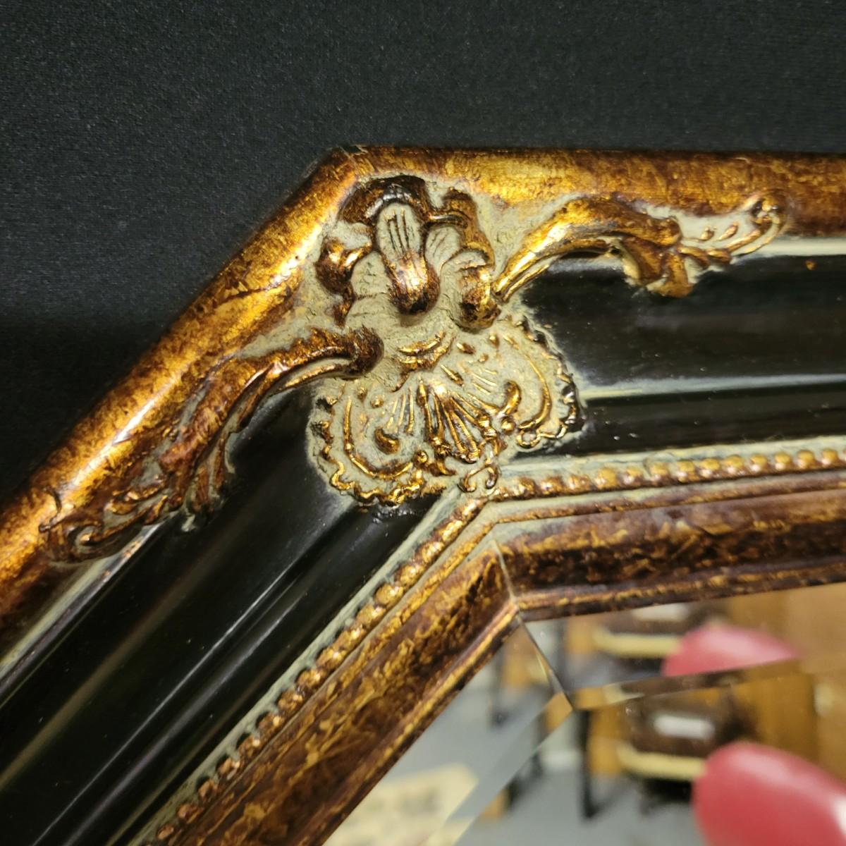 An eight sided beveled mirror in a wooden, ornate black and gold frame that is in good condition. Bevel is approximately 1". Mirror measures approximately 26" x 38.5" x 1.5" Shipping available. Shipping can be costly please call UPS store at 828-252-6930 for quote
