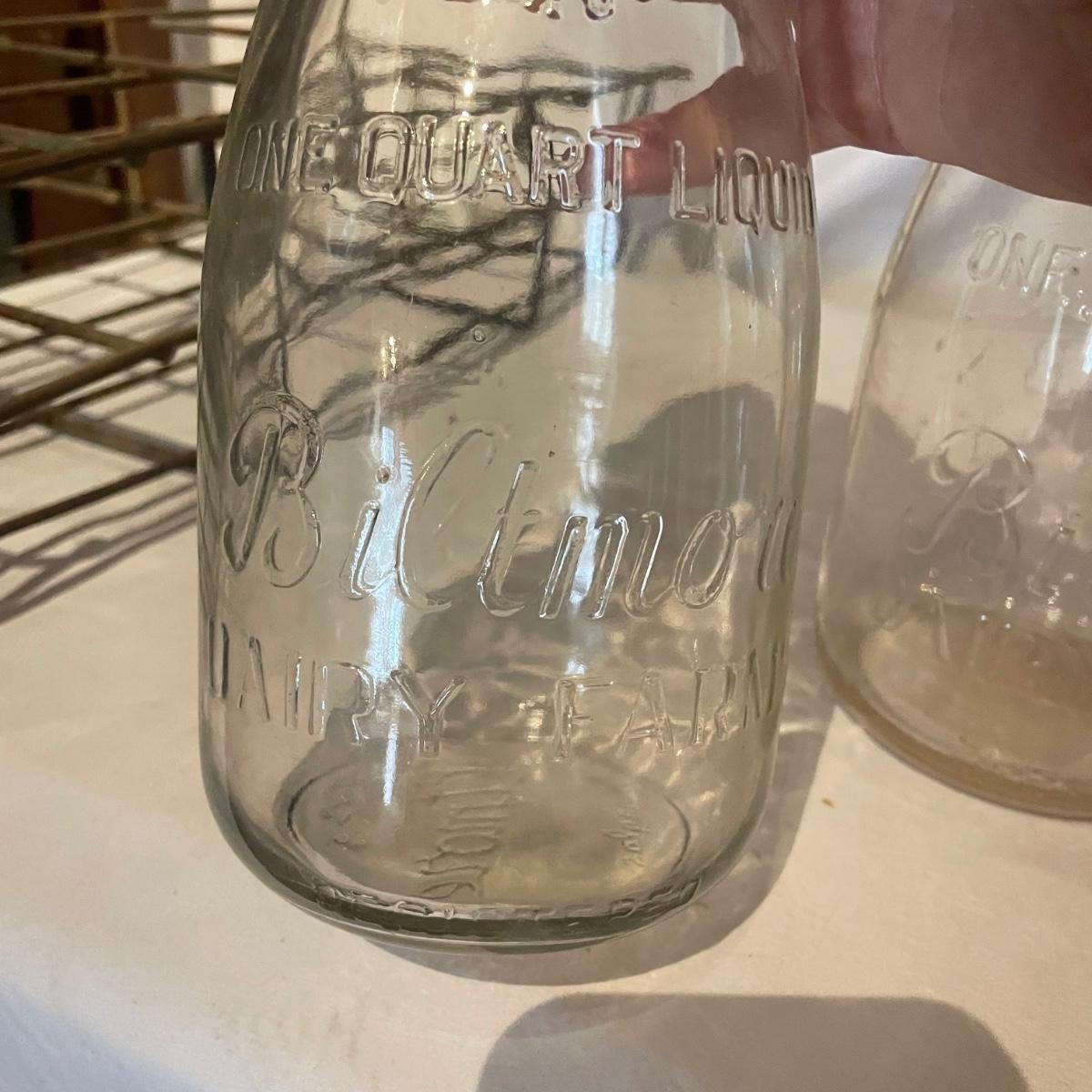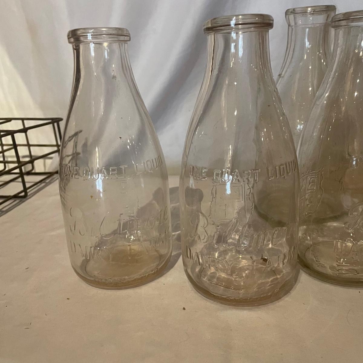 All eight of these one quart glass bottles are from Biltmore Dairy and come with a steal metal bottle carrying basket (this does not bare the Biltmore name) and measures 9” x 18” x 10”.