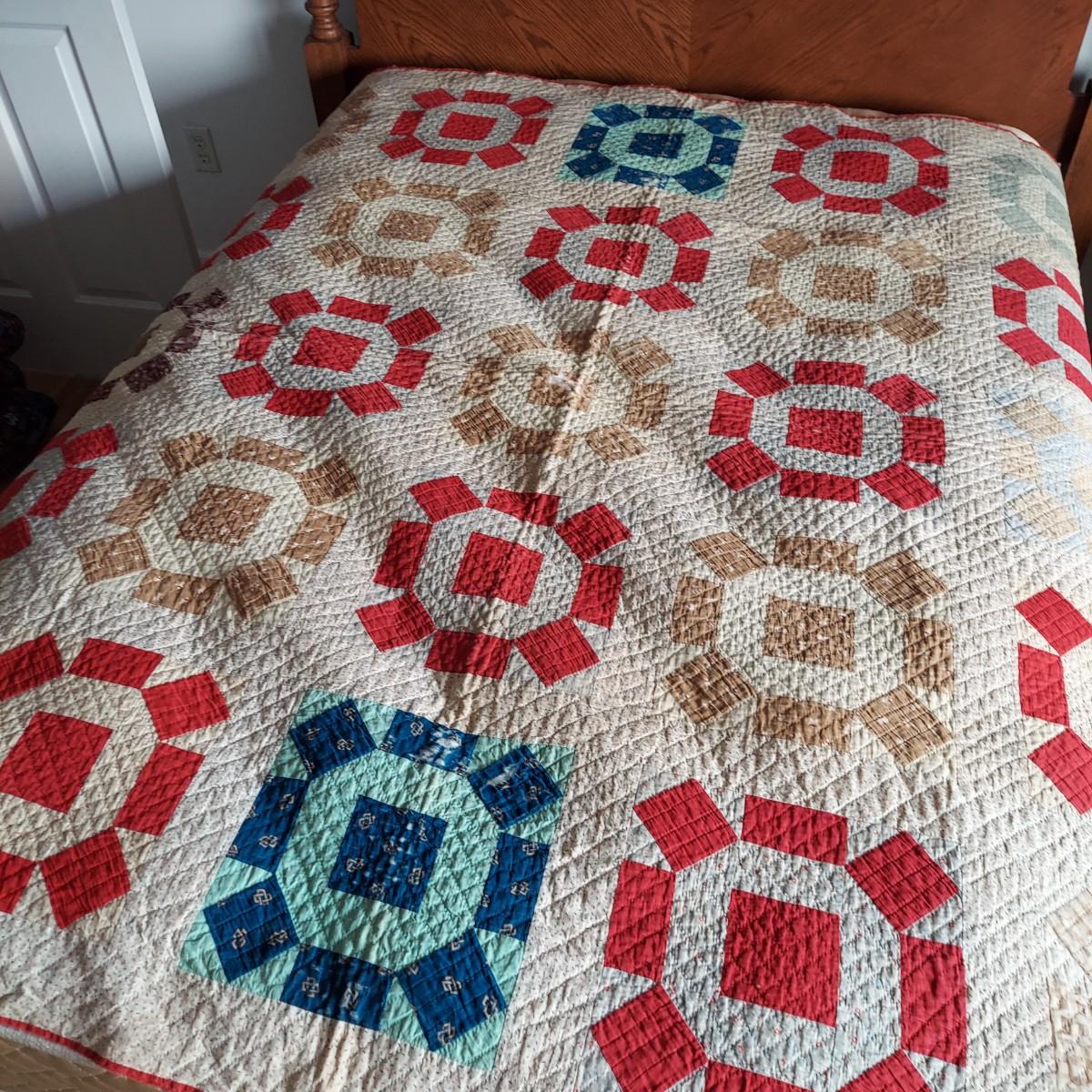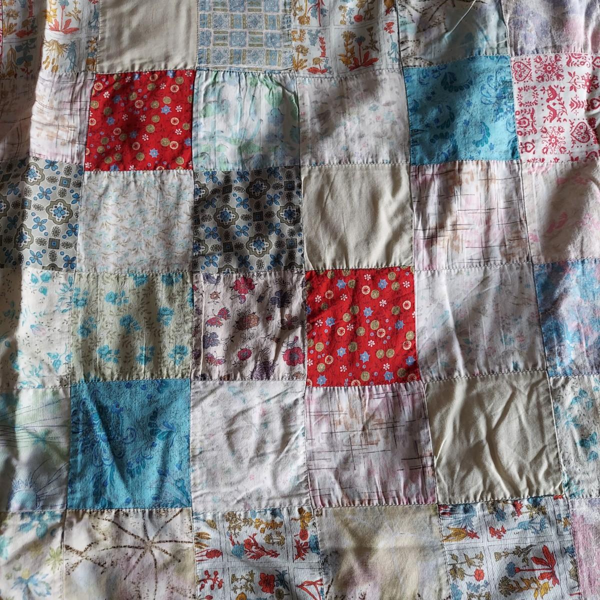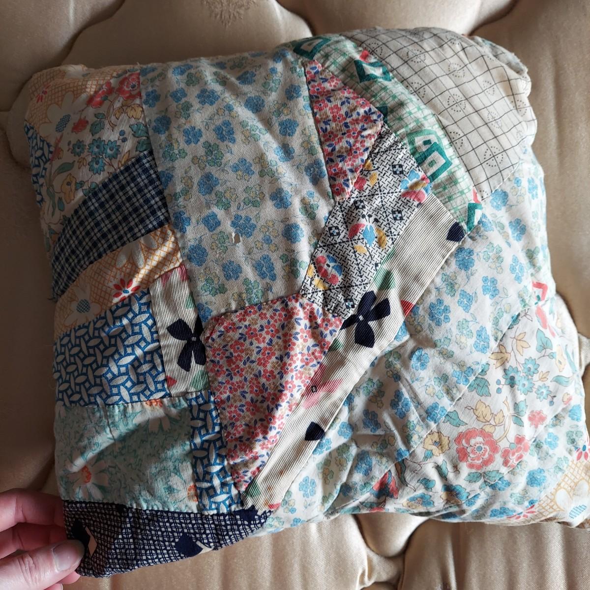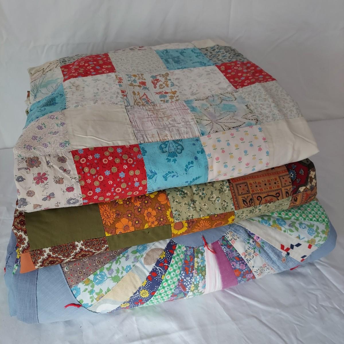 Lot includes eight vintage/antique quilts. Most appear to be hand sewn and hand quilted. Some have stains and tears due to age. The largest quilt with Chambray blue background and dresden plate style pattern measures approximately 104” x 88”H. Please see photos for details. Shipping available