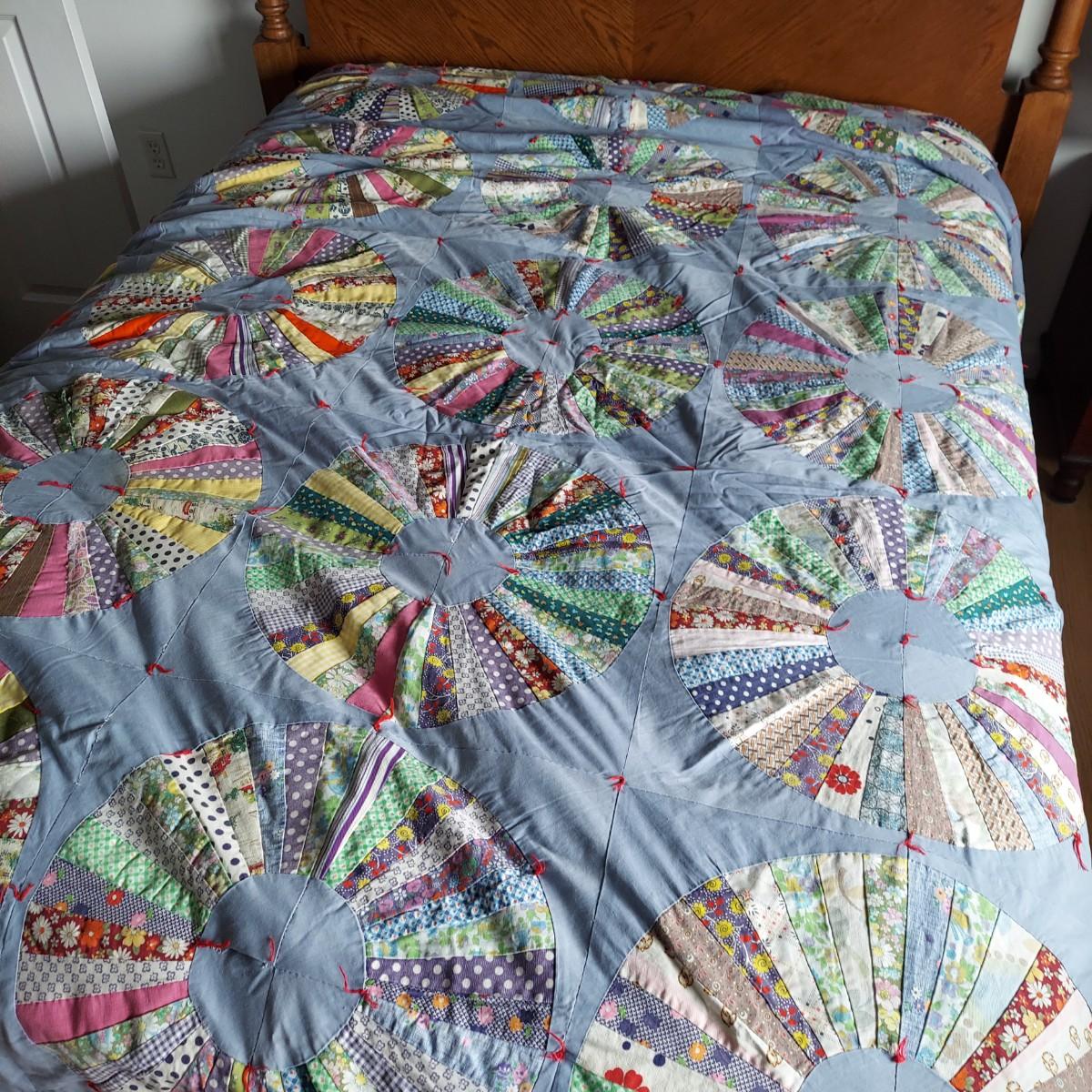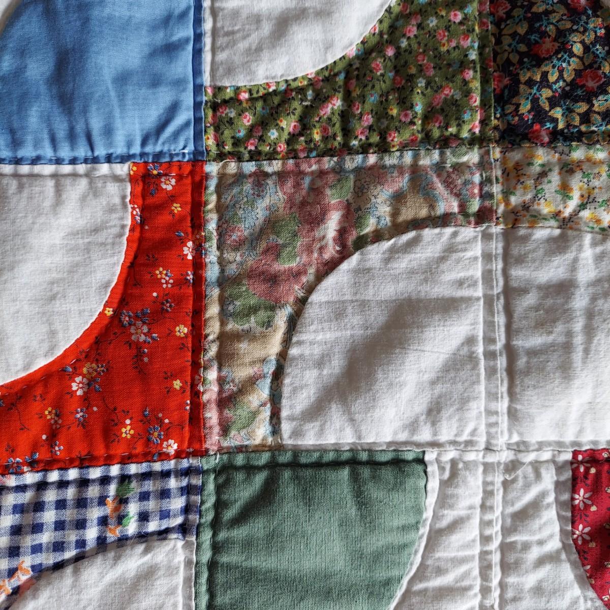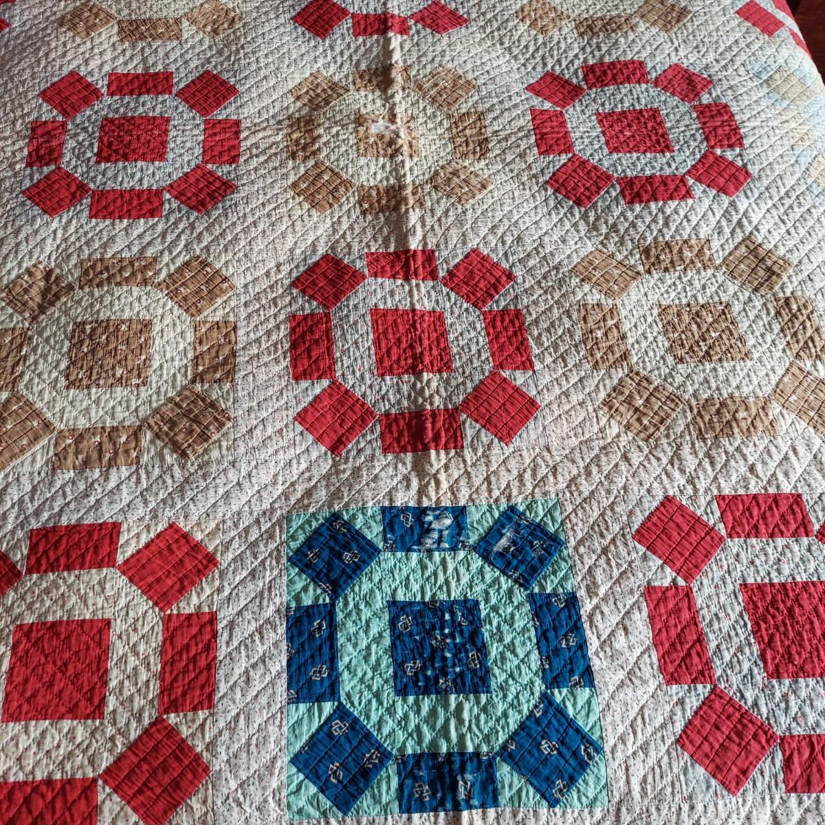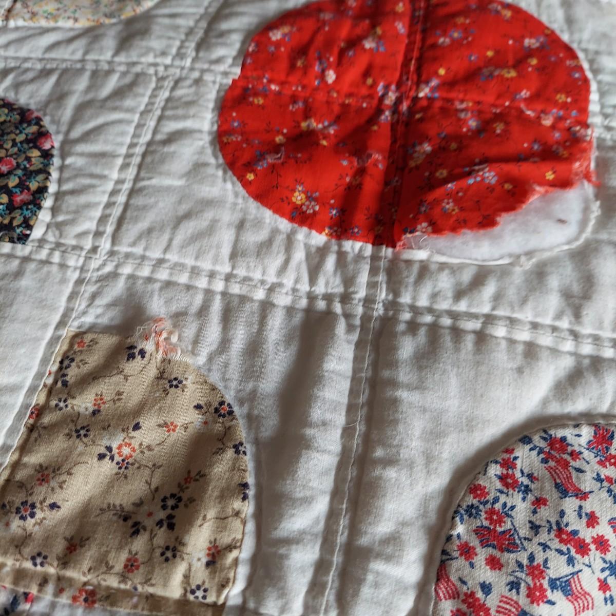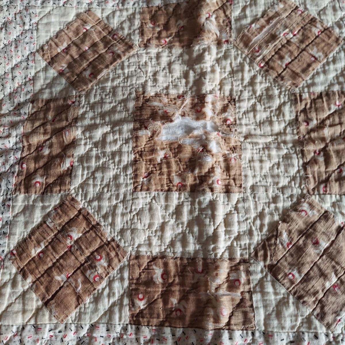 Lot includes eight vintage/antique quilts. Most appear to be hand sewn and hand quilted. Some have stains and tears due to age. The largest quilt with Chambray blue background and dresden plate style pattern measures approximately 104” x 88”H. Please see photos for details. Shipping available